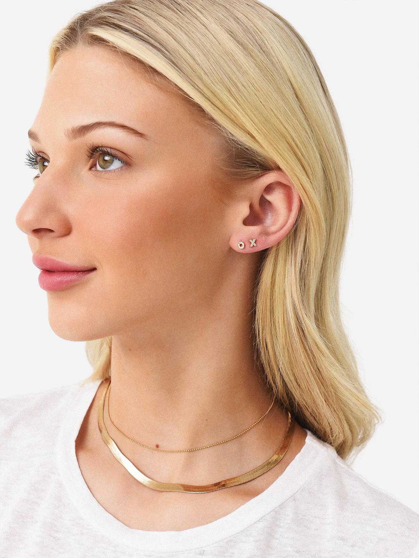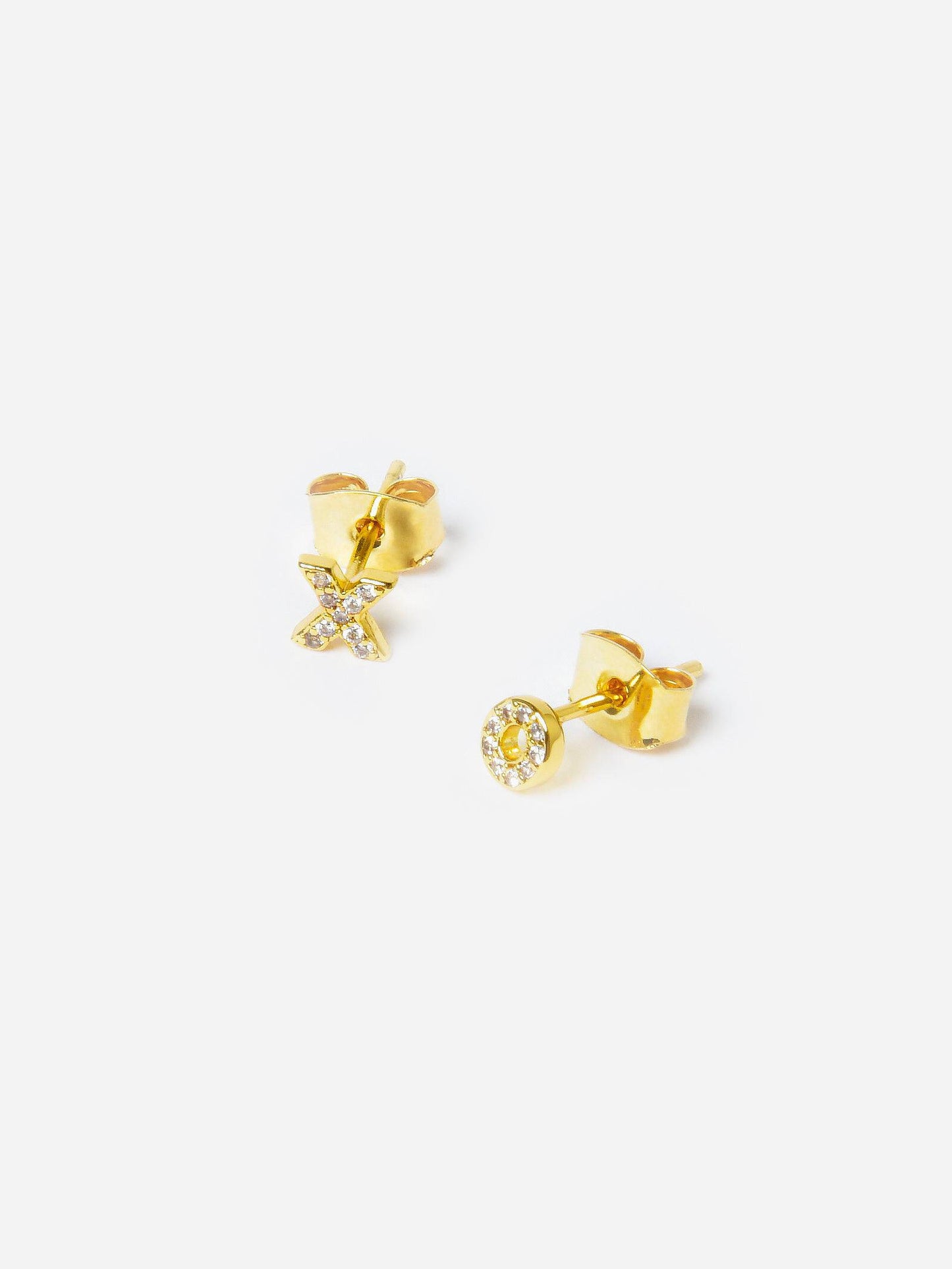 A pair of hugs and kisses stud earrings with pavé cubic zirconia stones.
