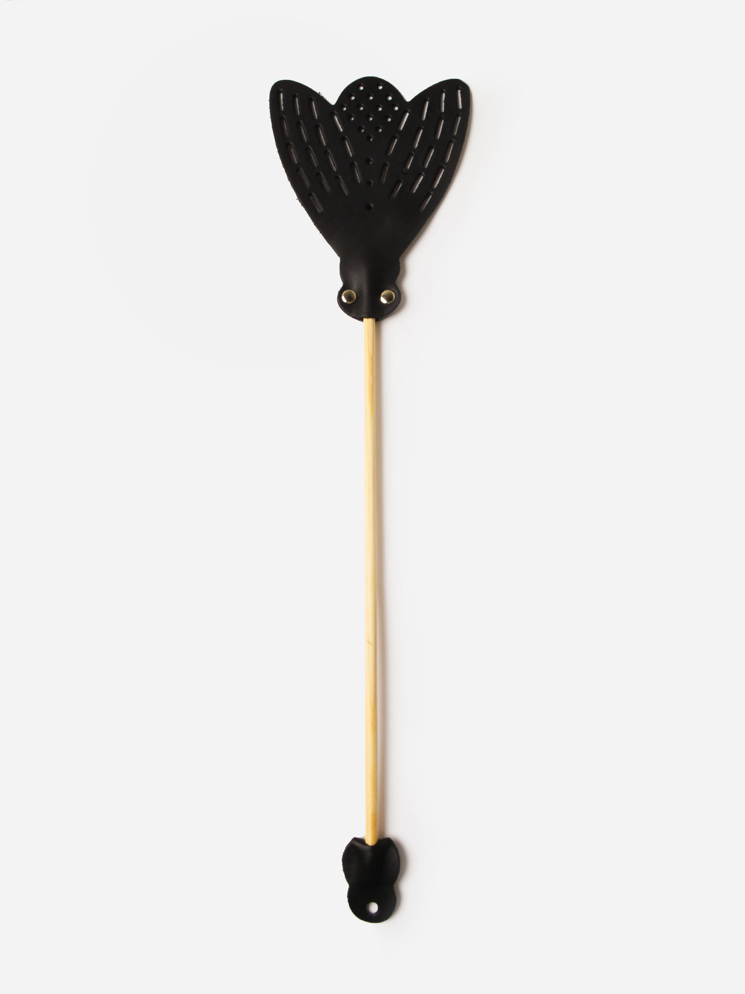 A durable fly swatter made from leather and birch wood.