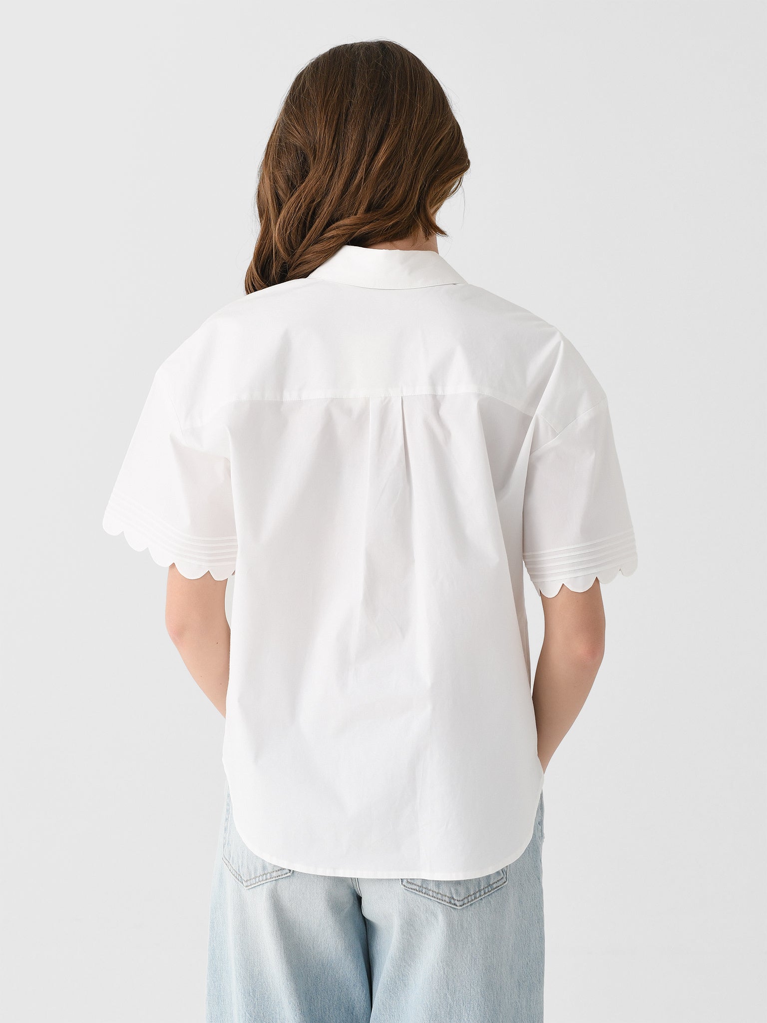 This crisp button-down shirt is made from organic cotton and features short sleeves with pintuck details and scalloped trims.