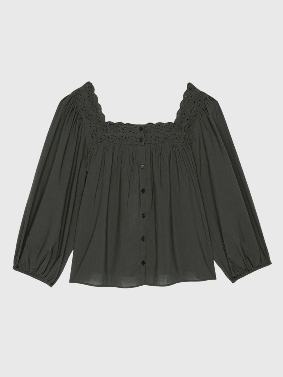 This vintage-inspired button-down top is crafted from lightweight cotton voile for an airy, breathable feel. A scalloped neckline framed with delicate eyelet lace adds a touch of romantic charm, while voluminous sleeves and a relaxed fit lend a soft, graceful silhouette. Designed to blur the line between loungewear and daywear, it’s perfect for sleeping in comfort or styling casually for a relaxed, effortless daytime look.