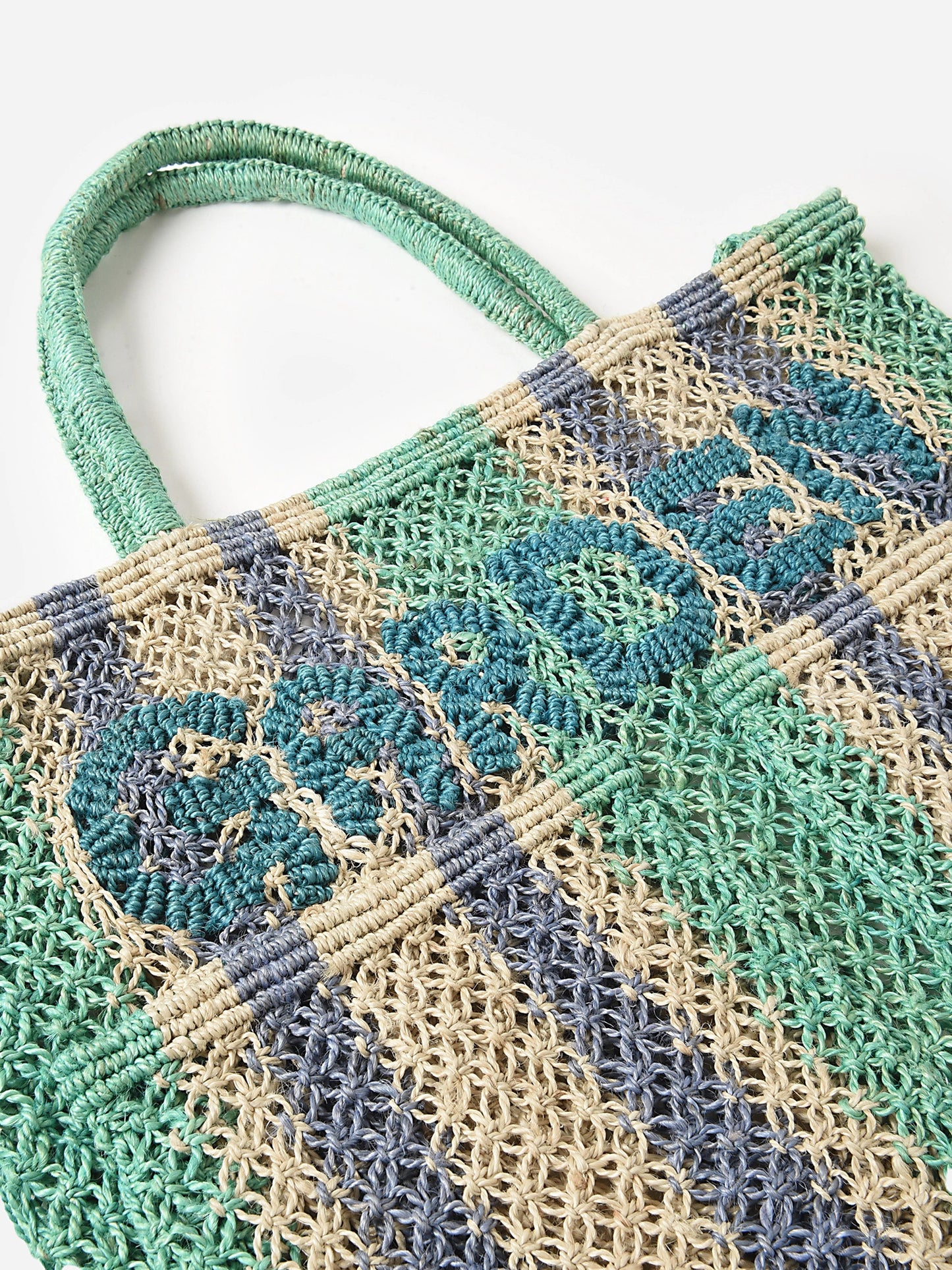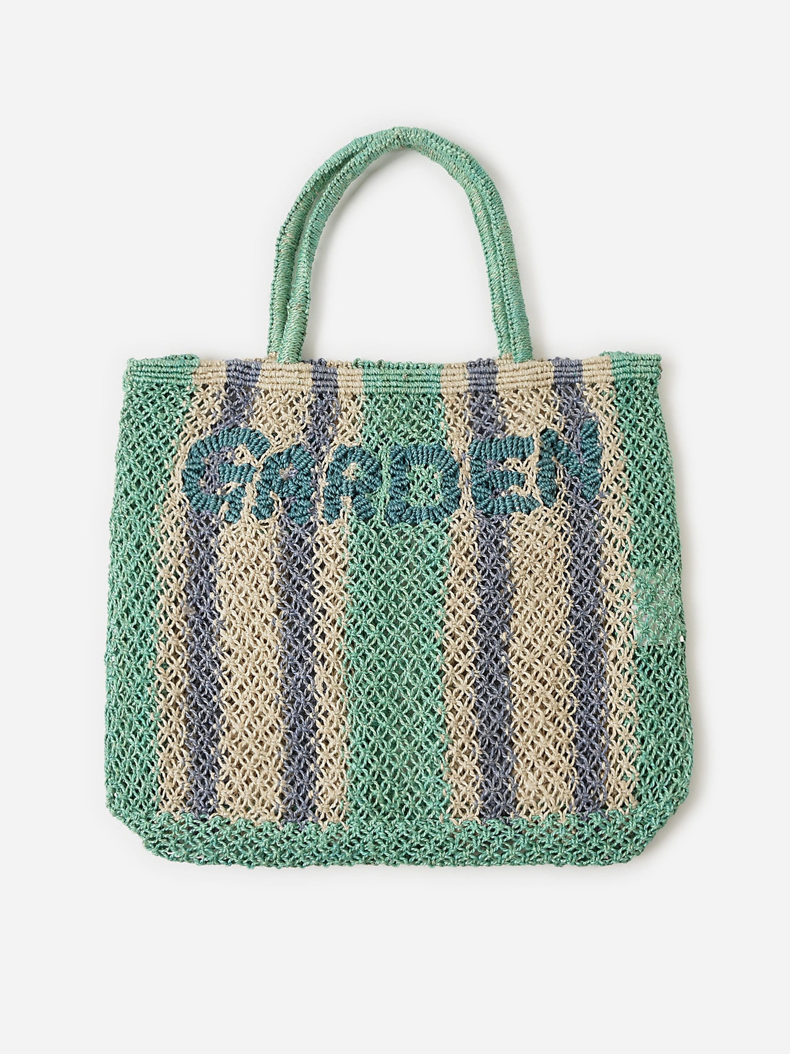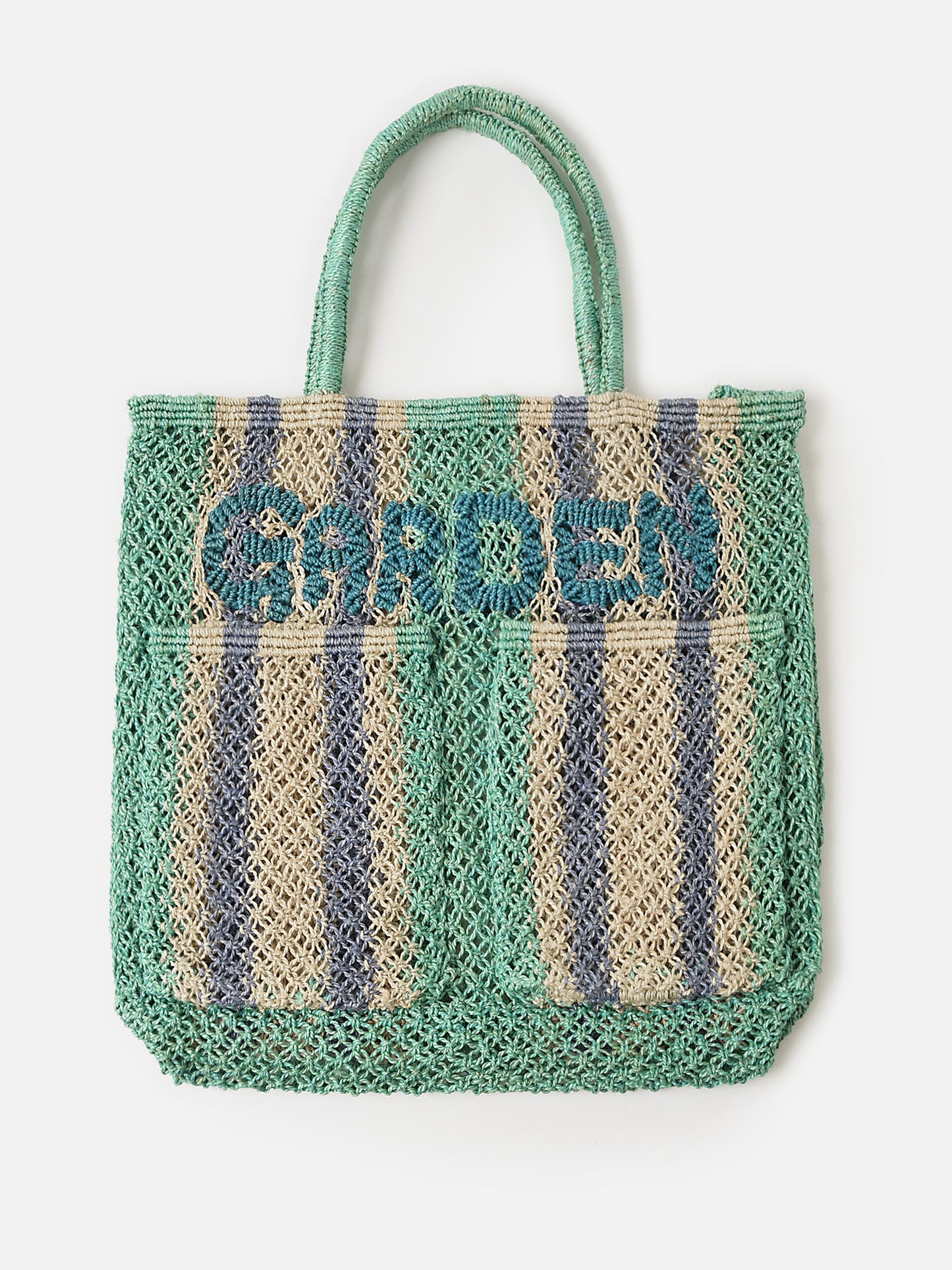 A colorful striped tote bag made from natural jute with an embroidered design and exterior pockets.
