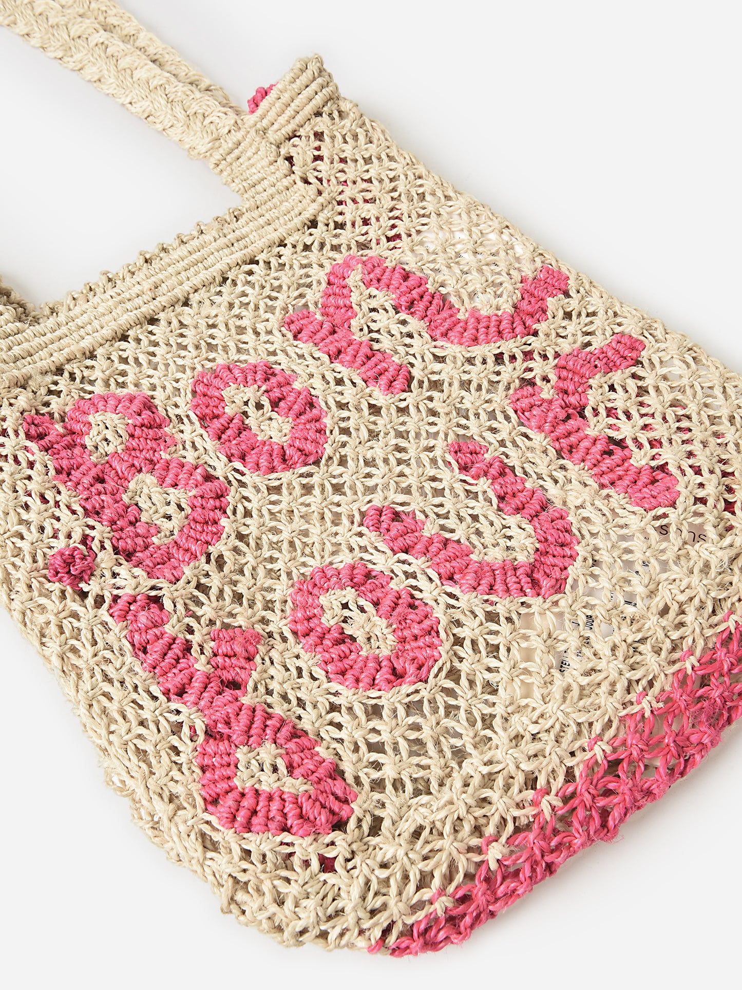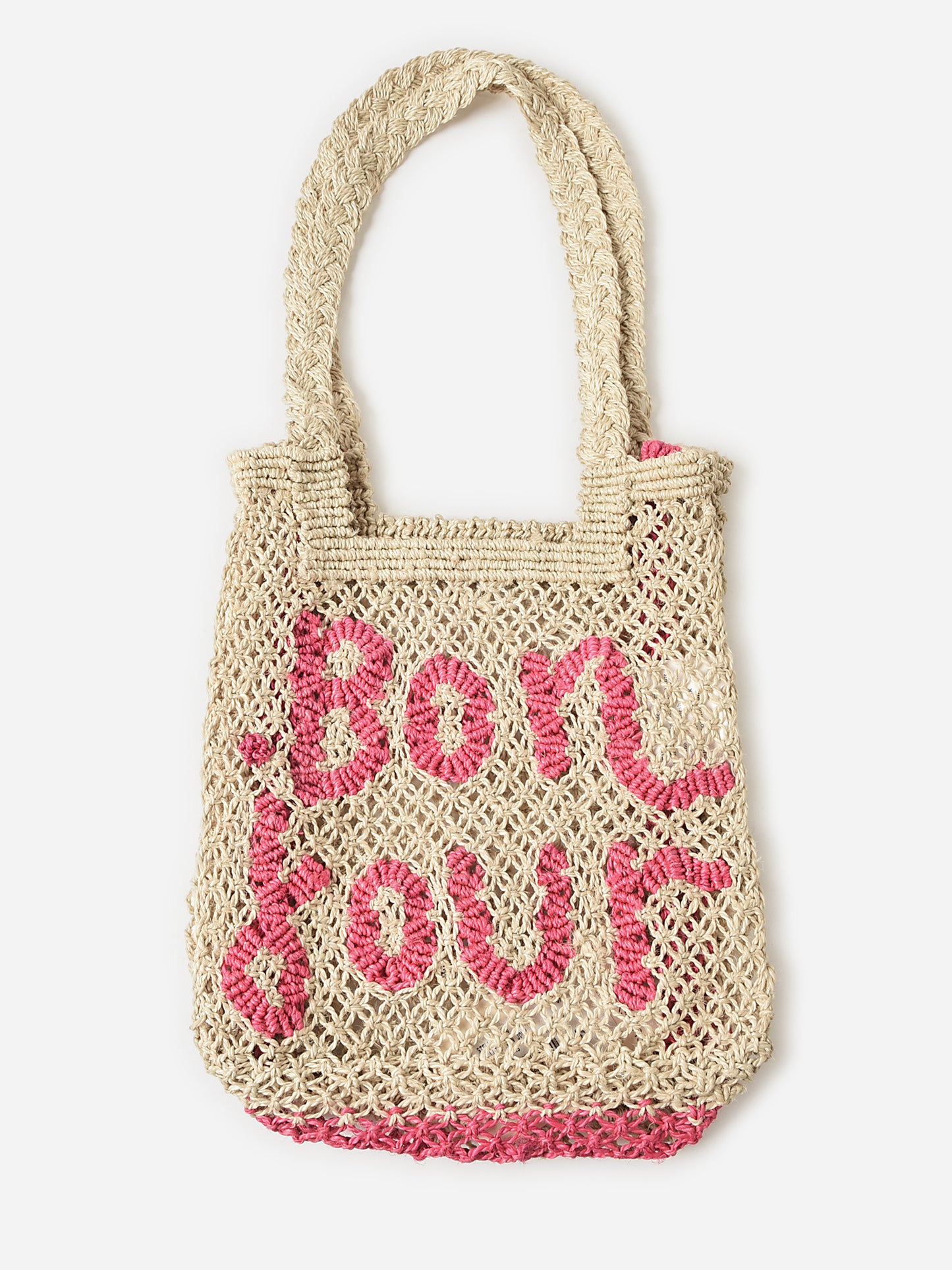 A small tote bag handmade from durable jute material with a contrast embroidered design.