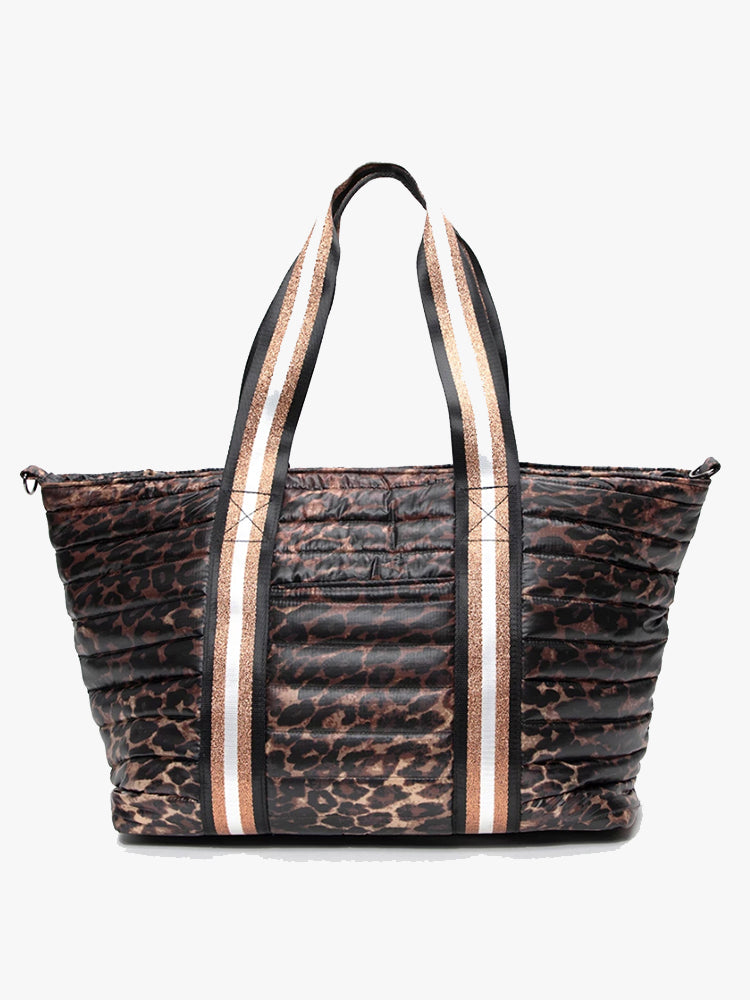 Tote Bag Extra Shine Coating Down-Like Quilted Polyfill 1 Inside Zip Pocketm Inside Waterbottle Pocket, Outter Front Pocket Adjustable strap Nailhead Canvas Bottom with Embossed Logo Dimensions: 13.5 in. H x 22 in. W x 7 in. D Handle Drop: 9.5 in.