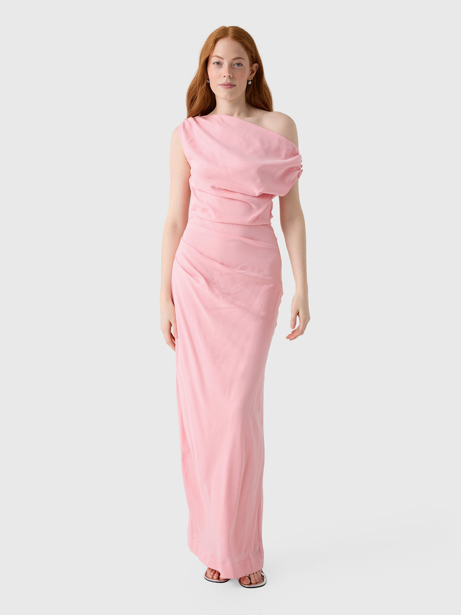 The Athena Off Shoulder Maxi Dress features a refined fit that offers effortless drape. It's designed with a cowl neckline that sits gracefully off the shoulders to create a flattering silhouette.
