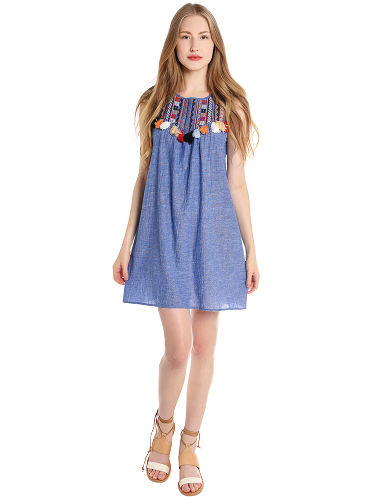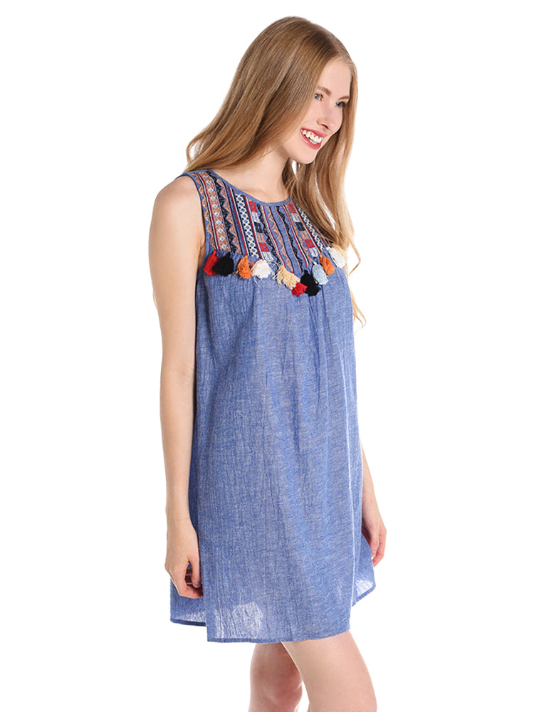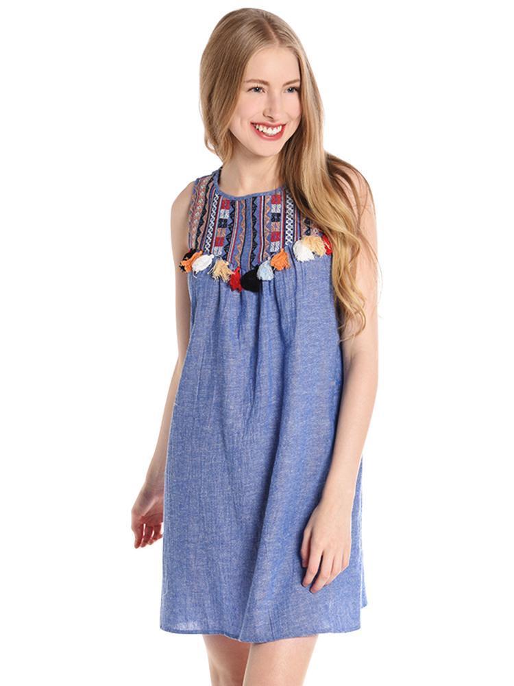 The THML Sleeveless Tent Dress with Tassels is summer ready.