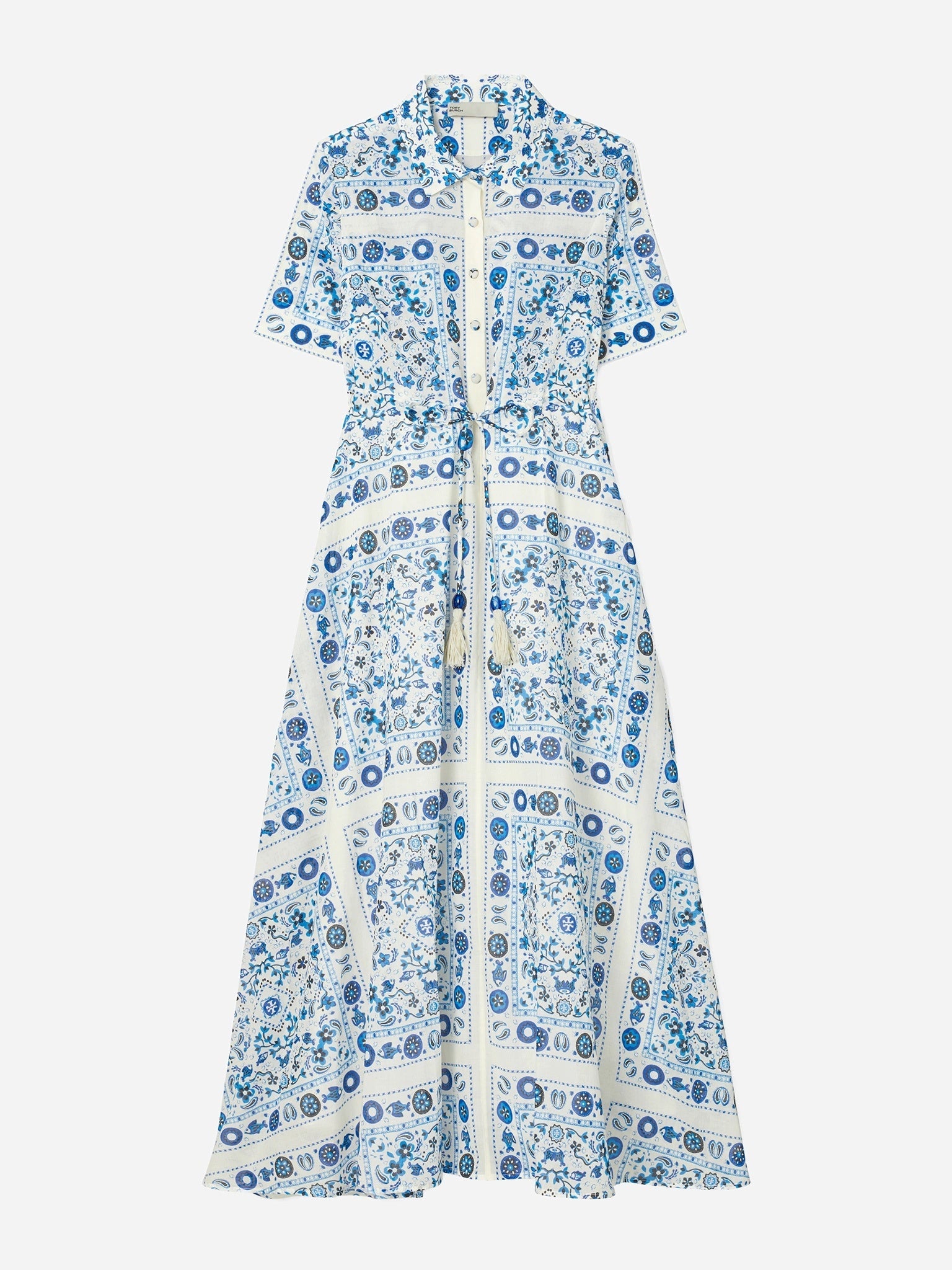 Short sleeve shirtdress with a novelty print and self-tie tassel belt.
