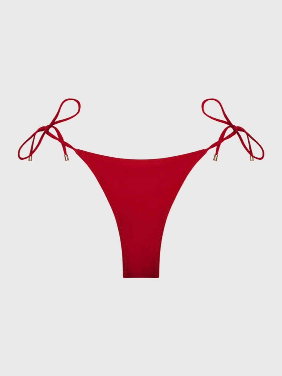 This bikini bottom is designed with adjustable side ties to ensure a personalized and secure fit. The design features minimalist back coverage and is updated with gold-toned metal tips for a refined, polished finish.