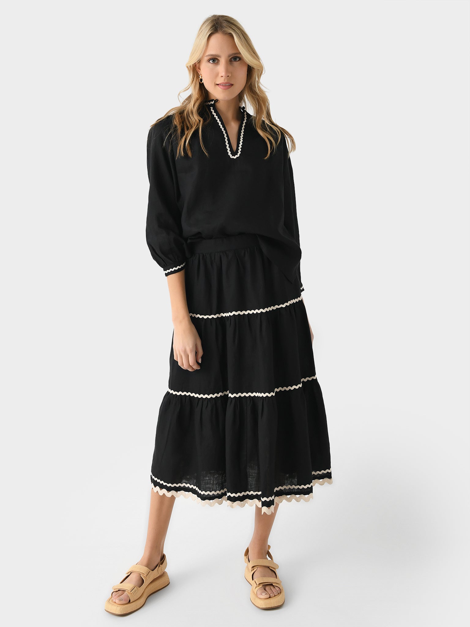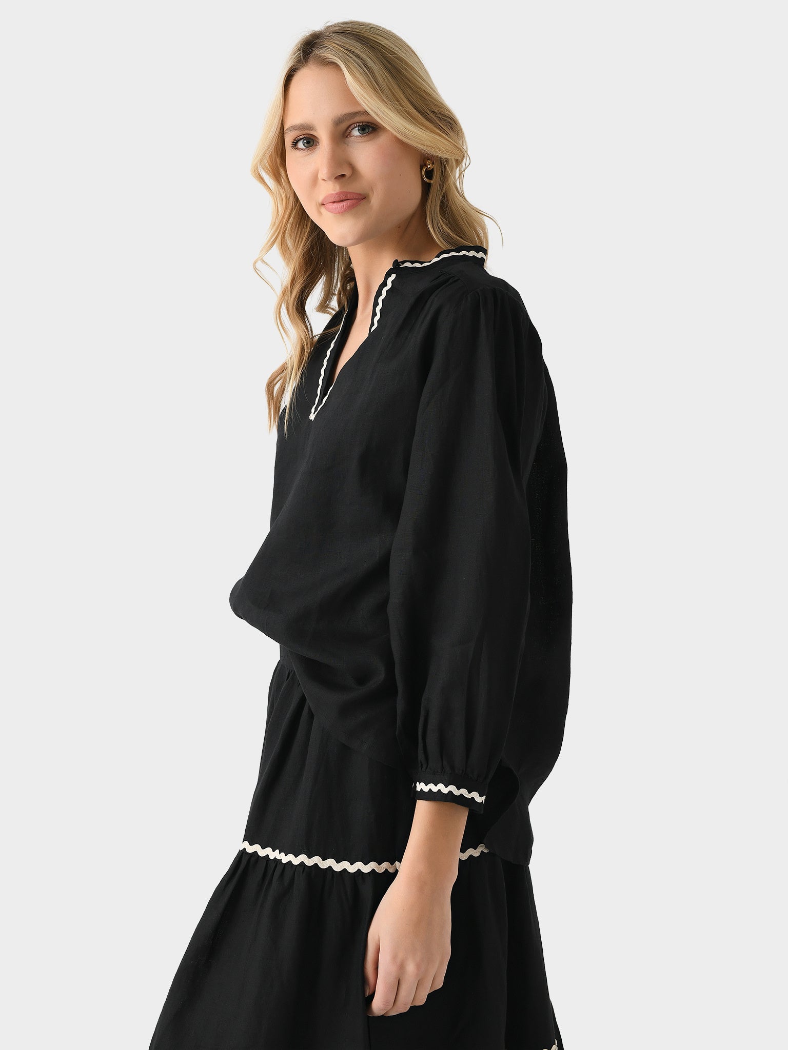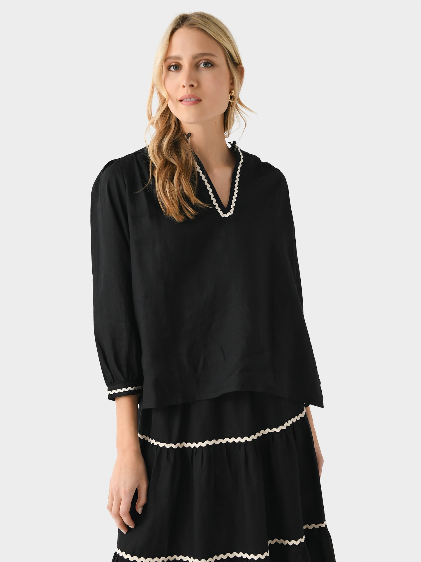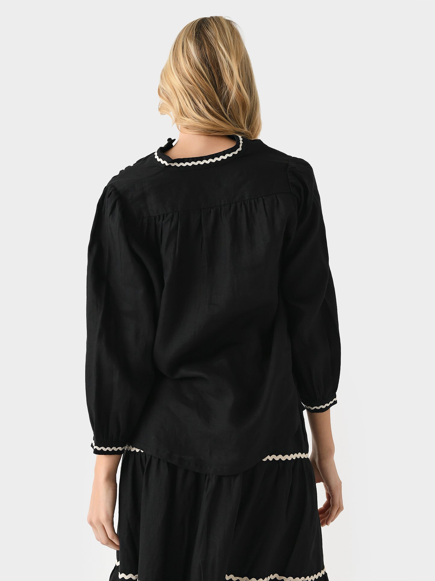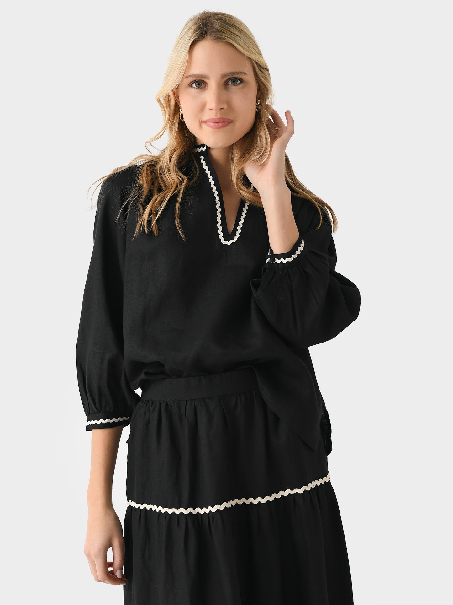 A boxy blouse made from lightweight linen with contrast ric-rac trims.