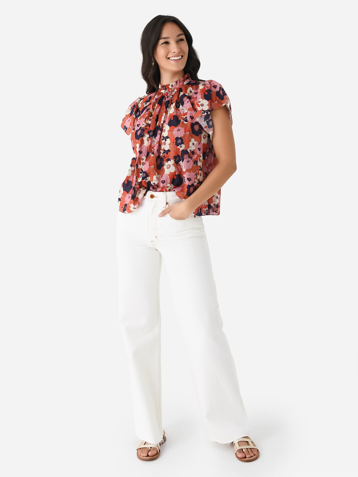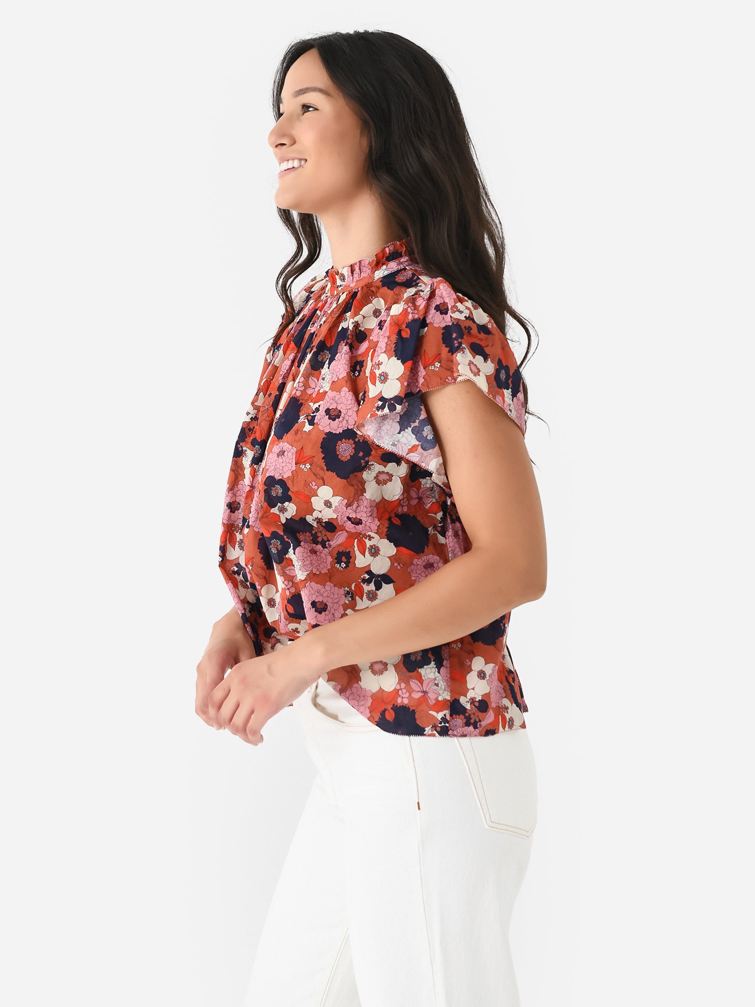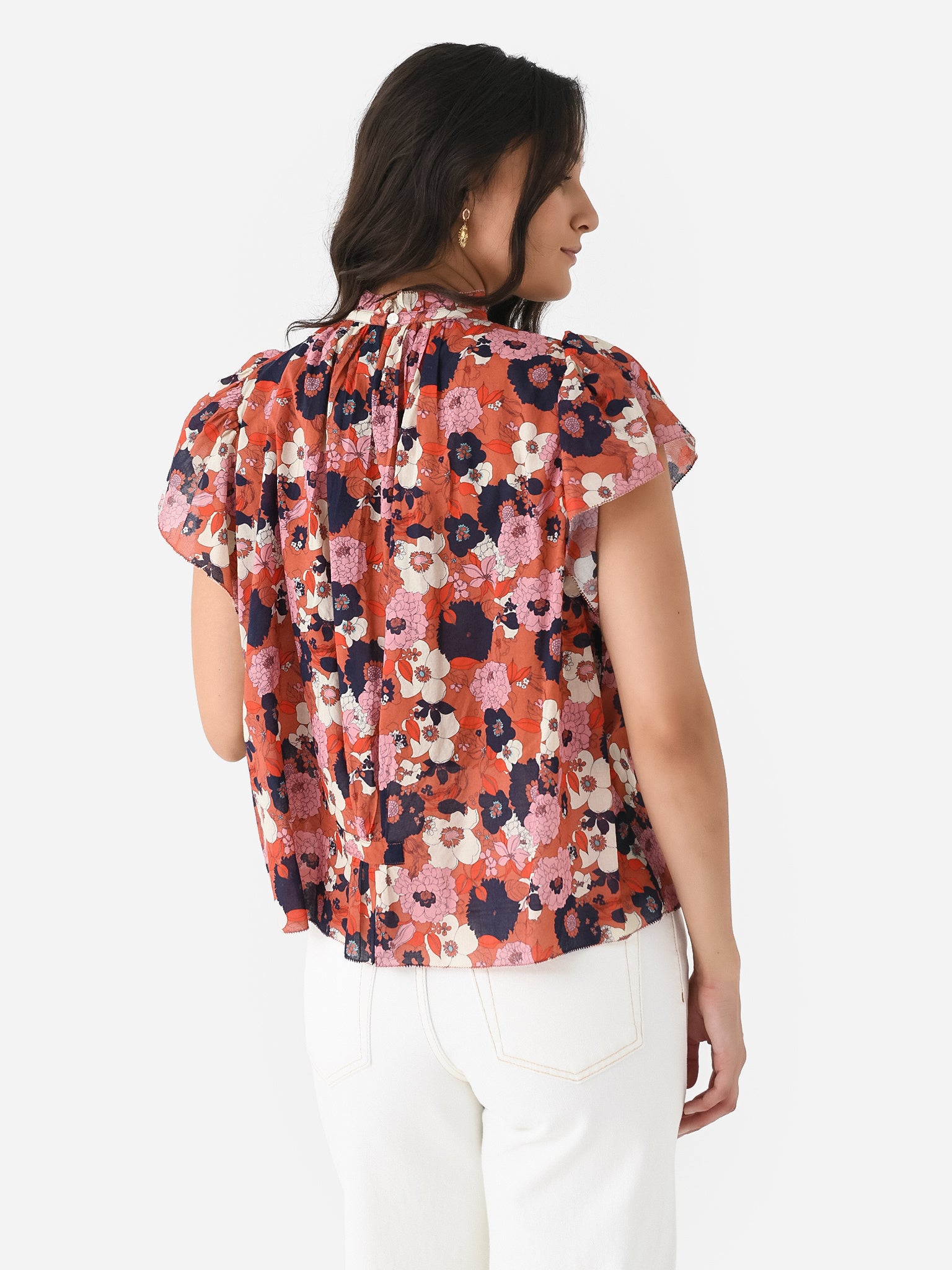 Easy-fitting blouse with a high neckline and flutter sleeves.