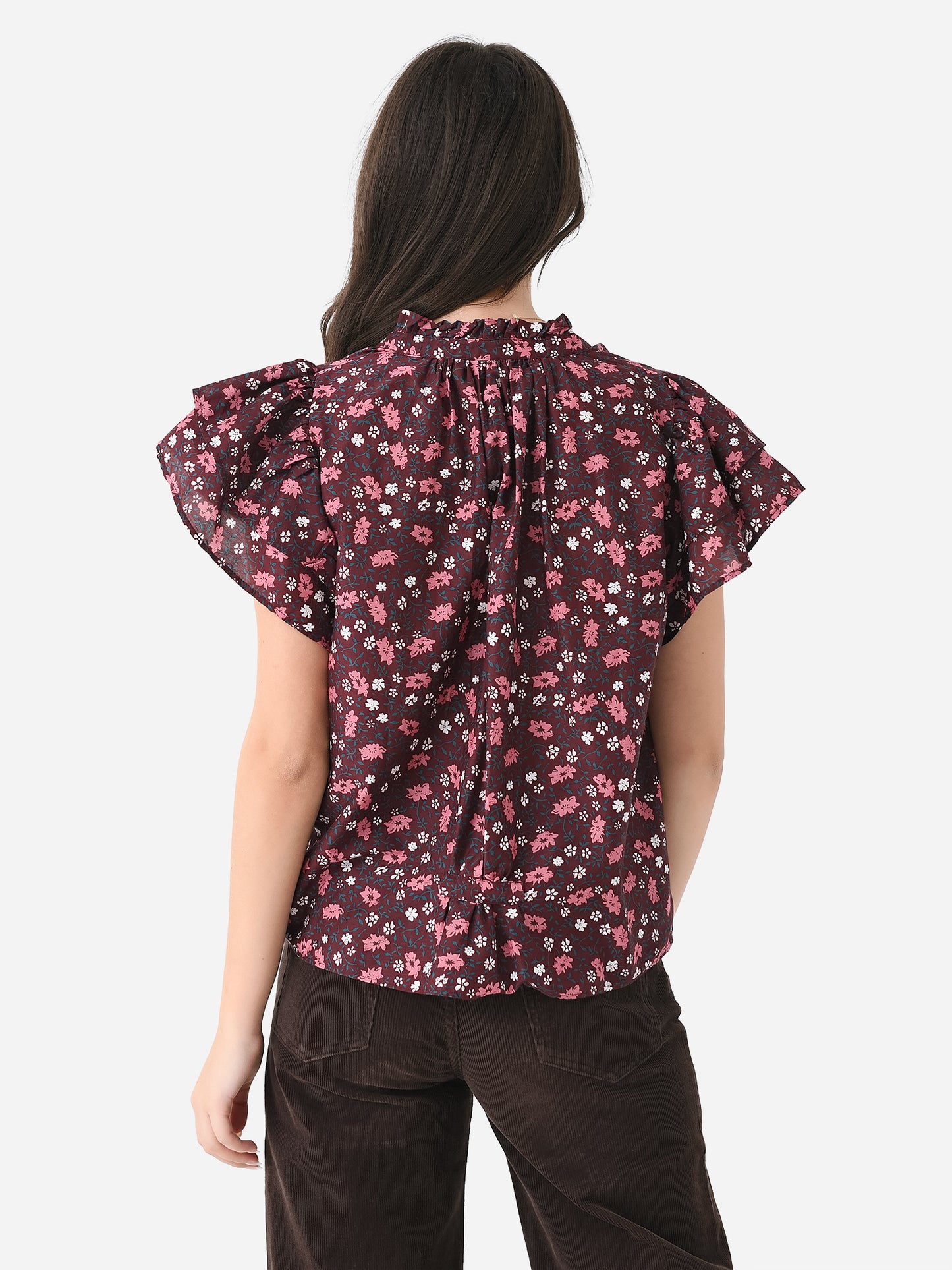 A printed blouse with a ruffle collar and layered ruffle sleeves.