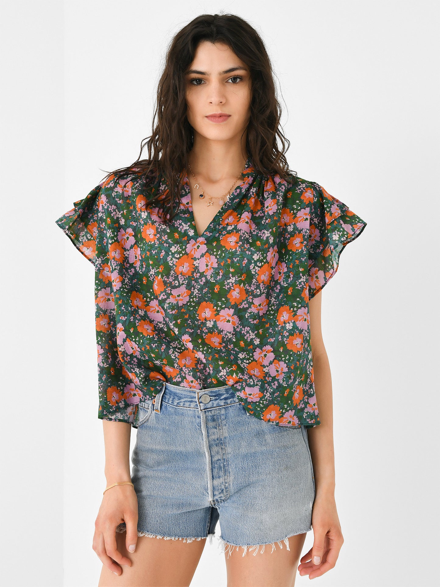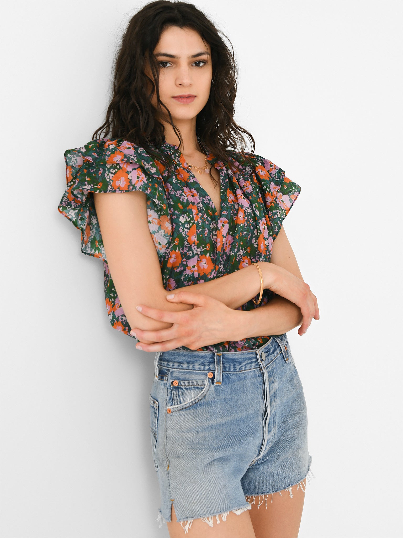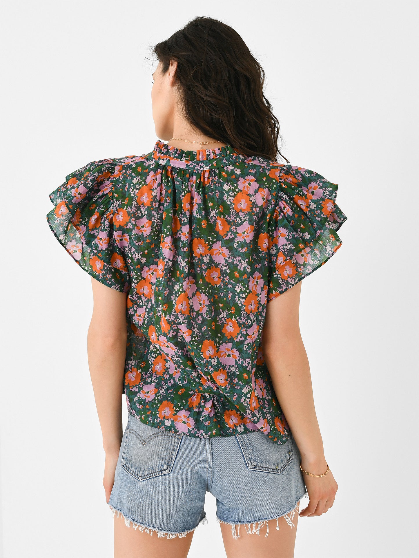 A novelty-printed blouse with a ruffle collar and feminine layered ruffle sleeves.