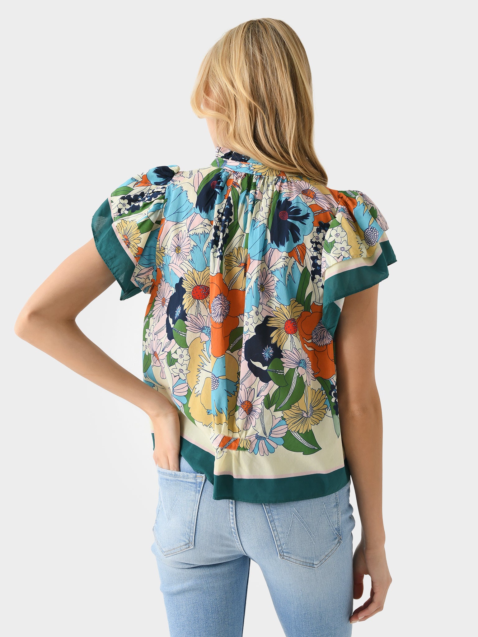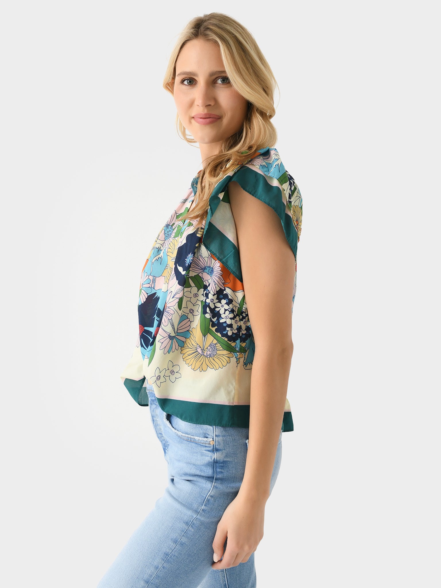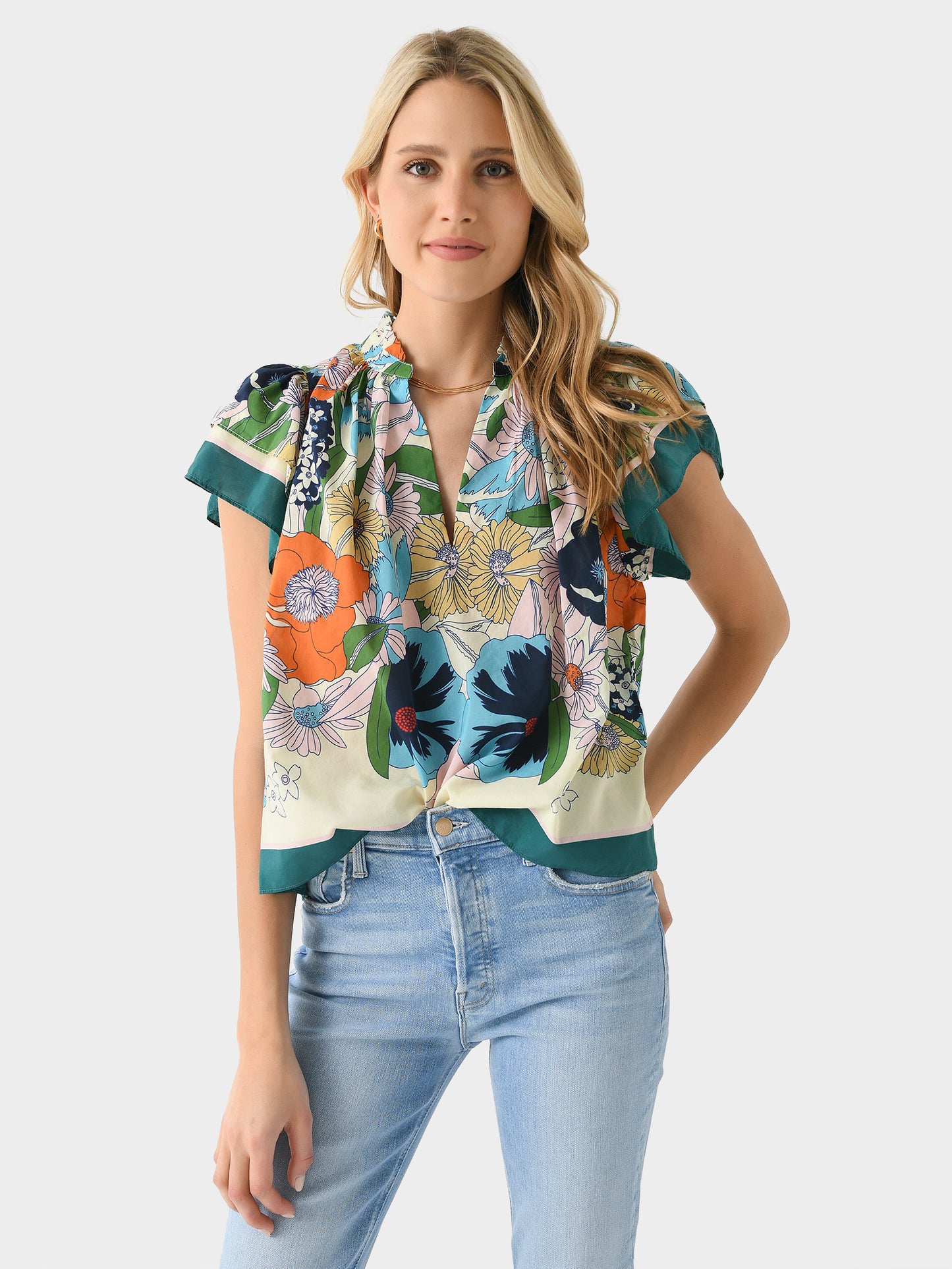 A lightweight v-neck blouse with a colorful floral print and layered flutter sleeves.