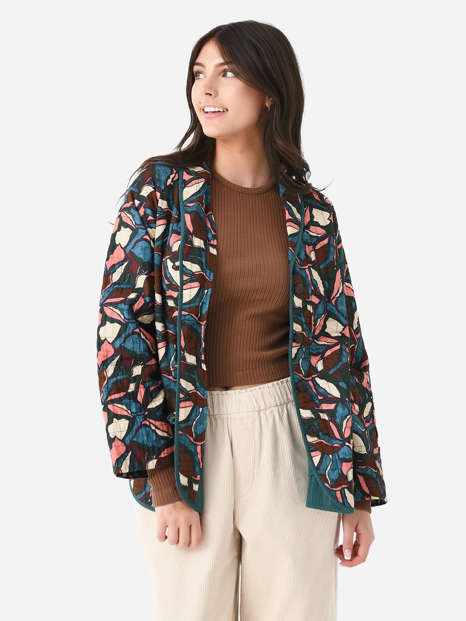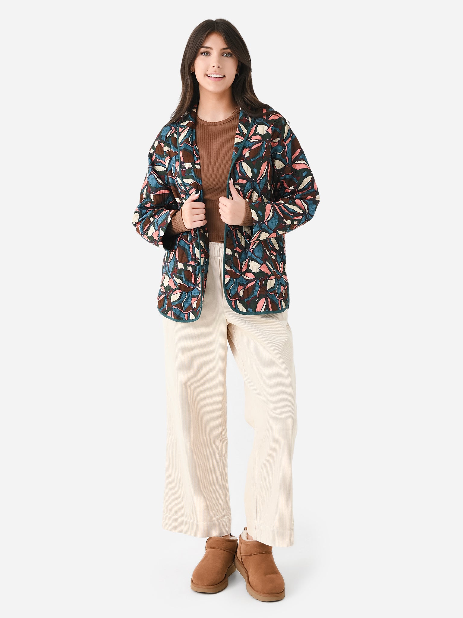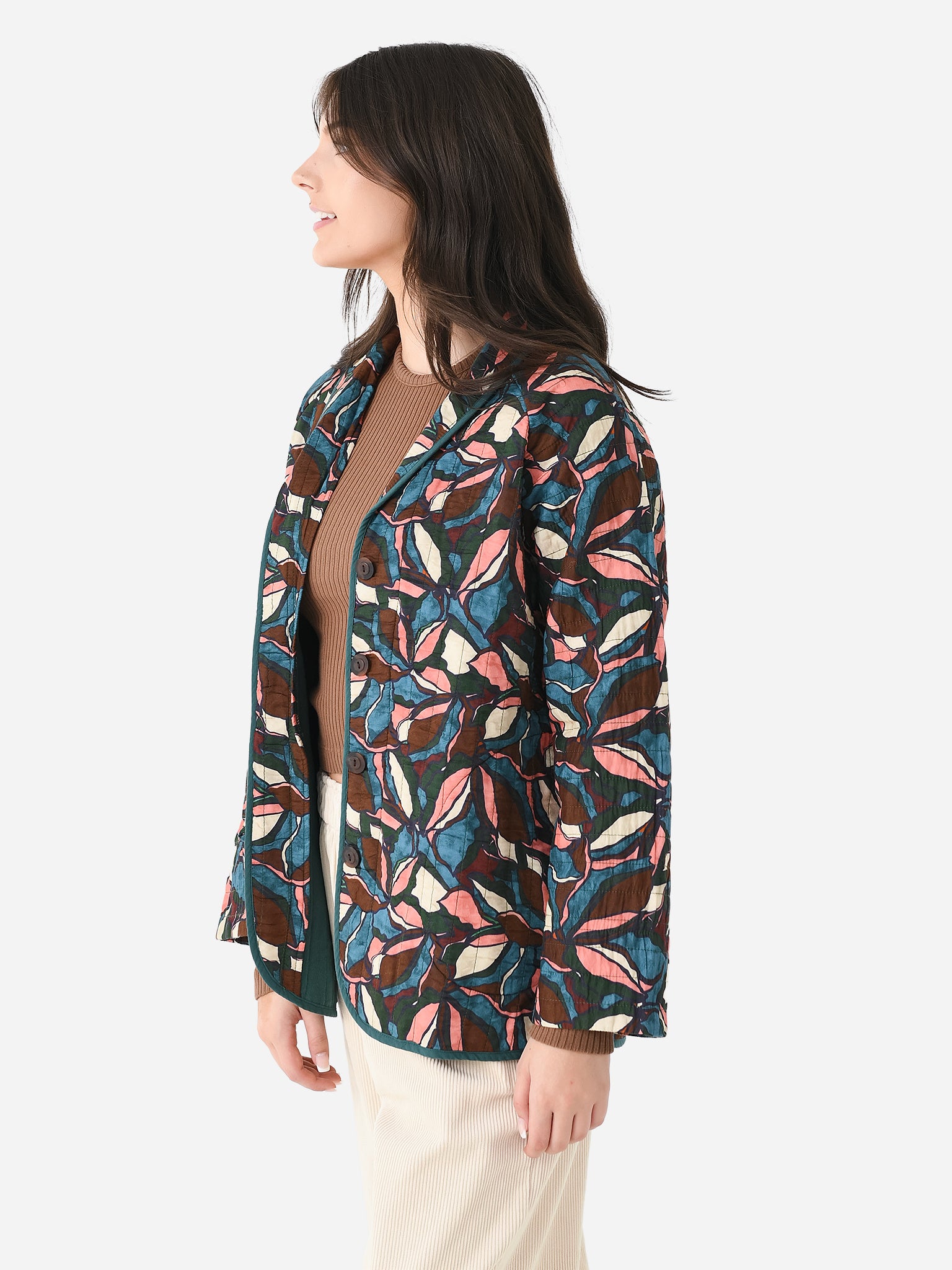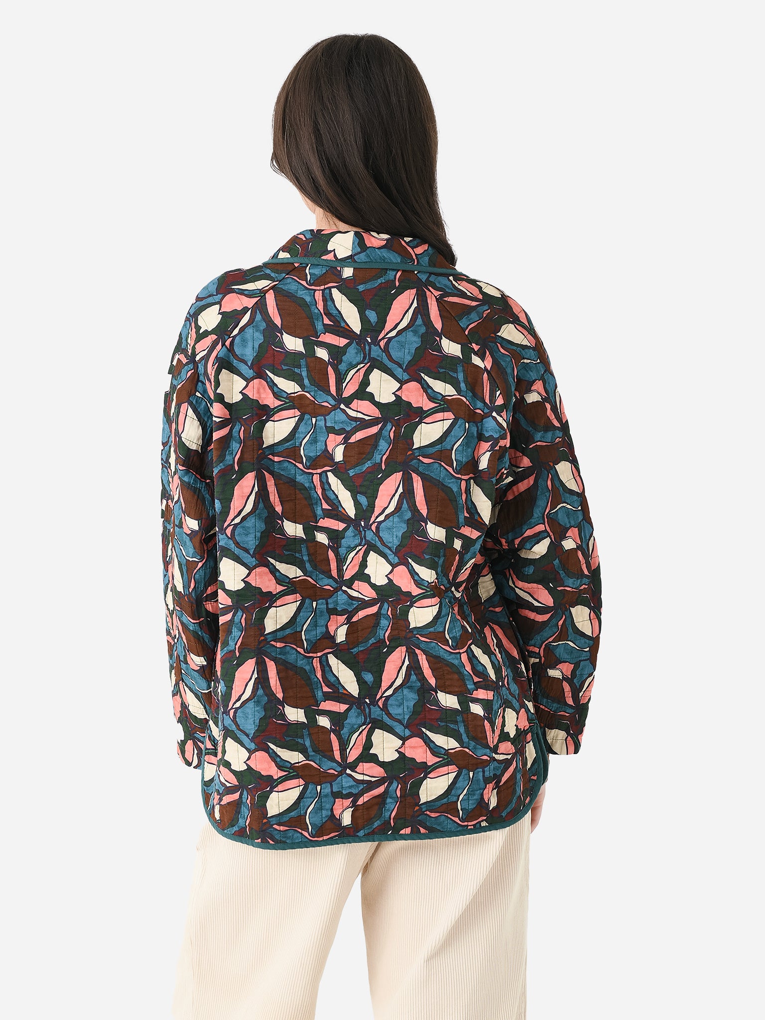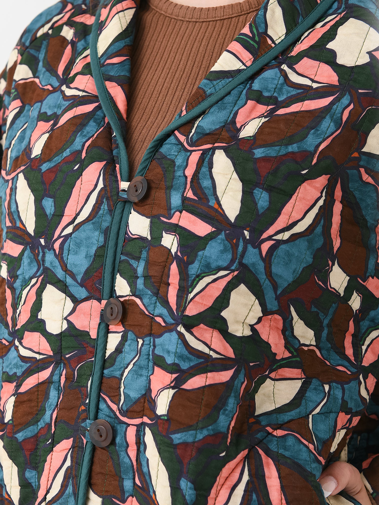 A lightly quilted jacket featuring a vintage-inspired silhouette and colorful leaf print.