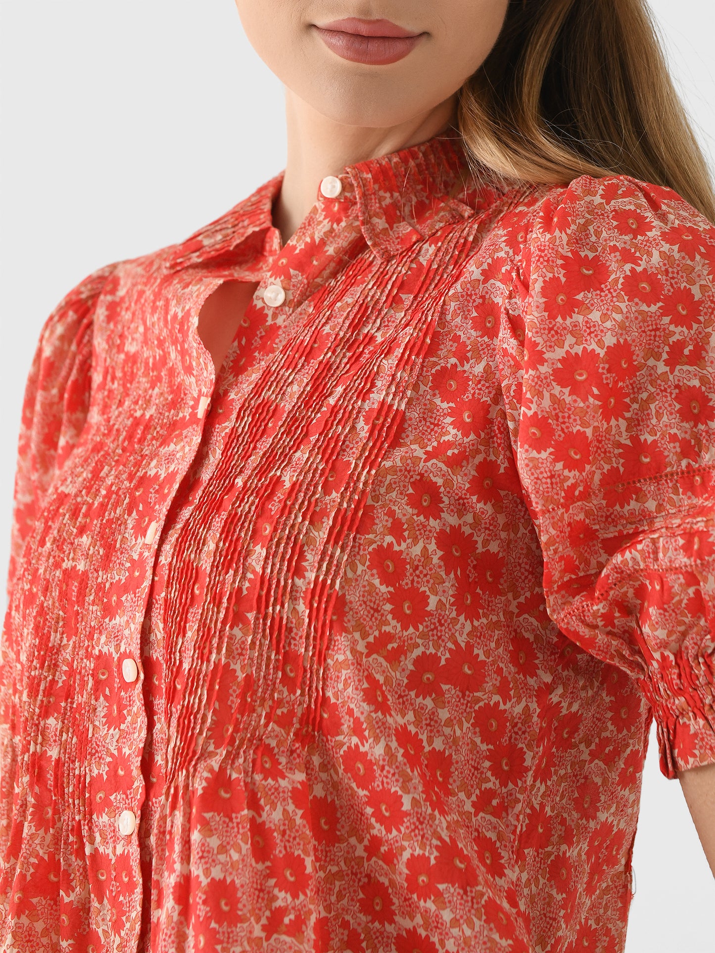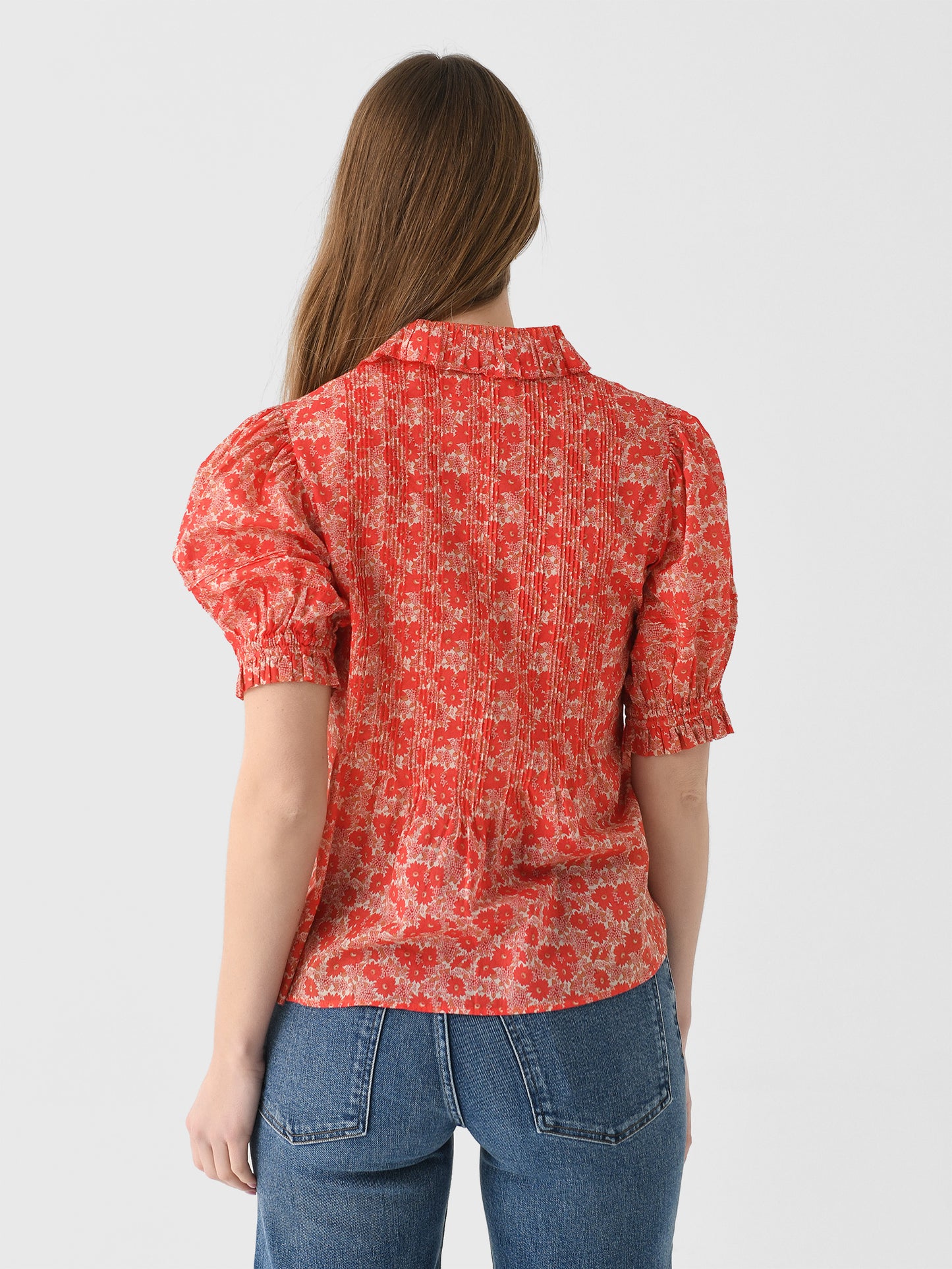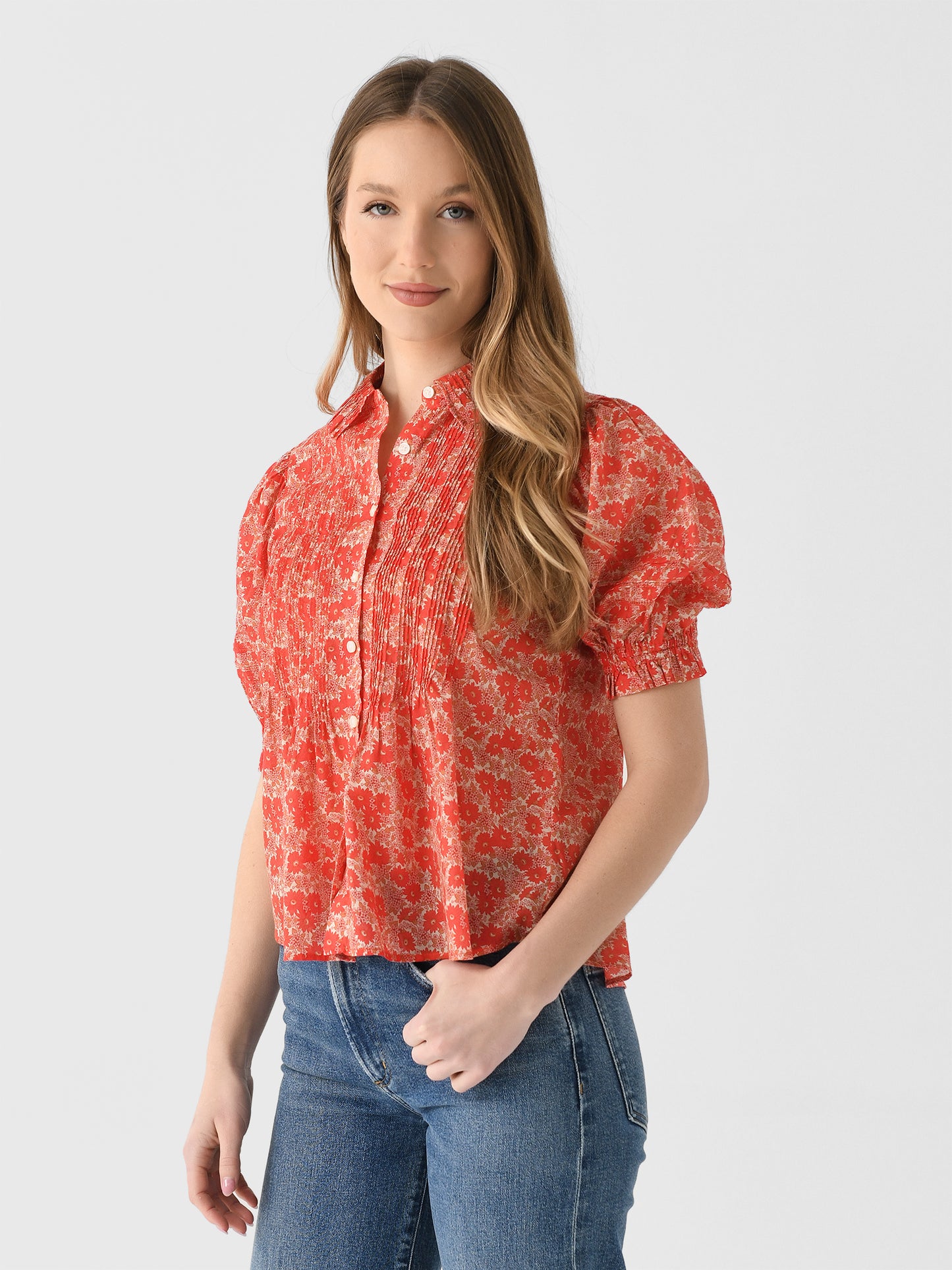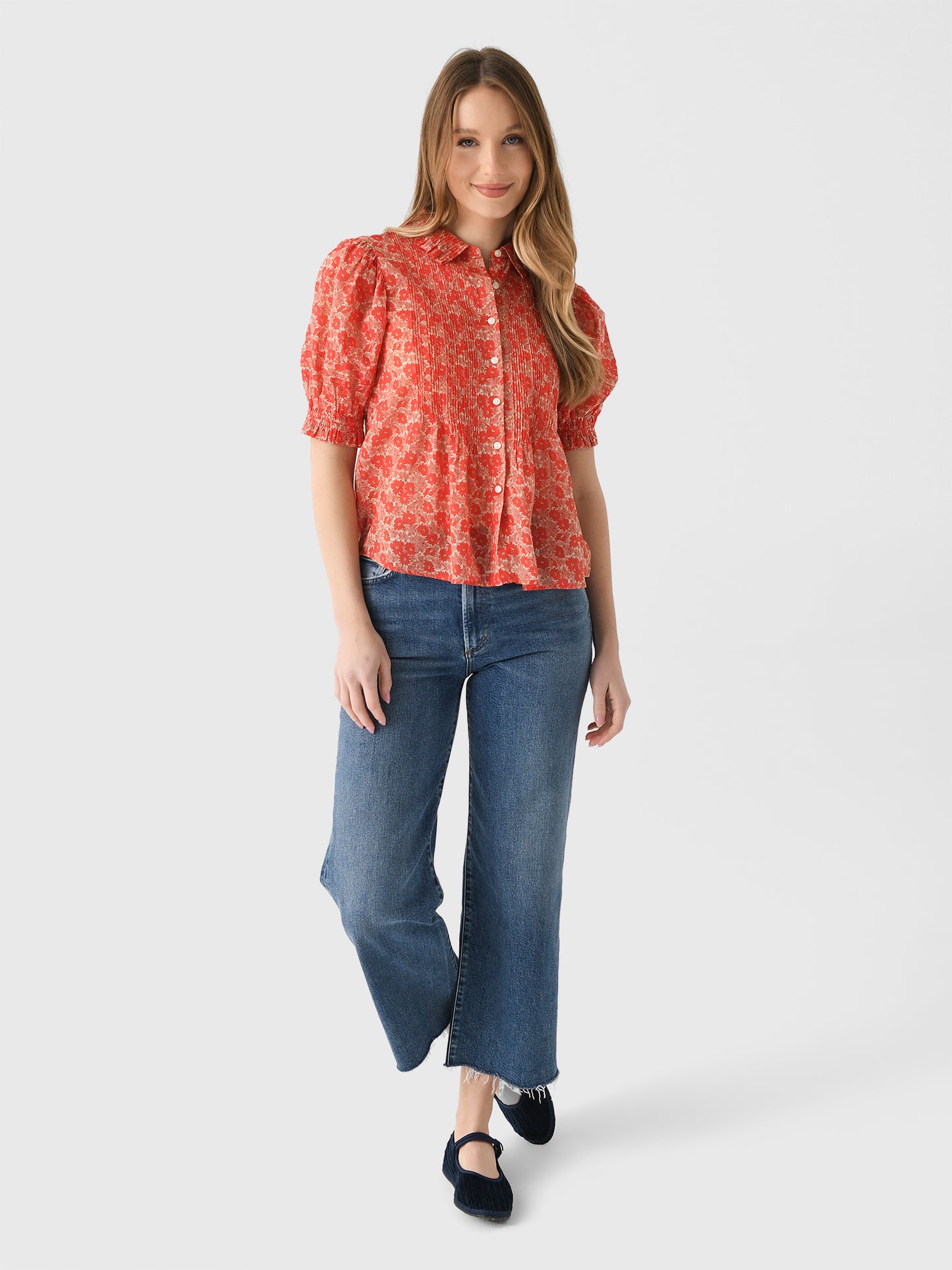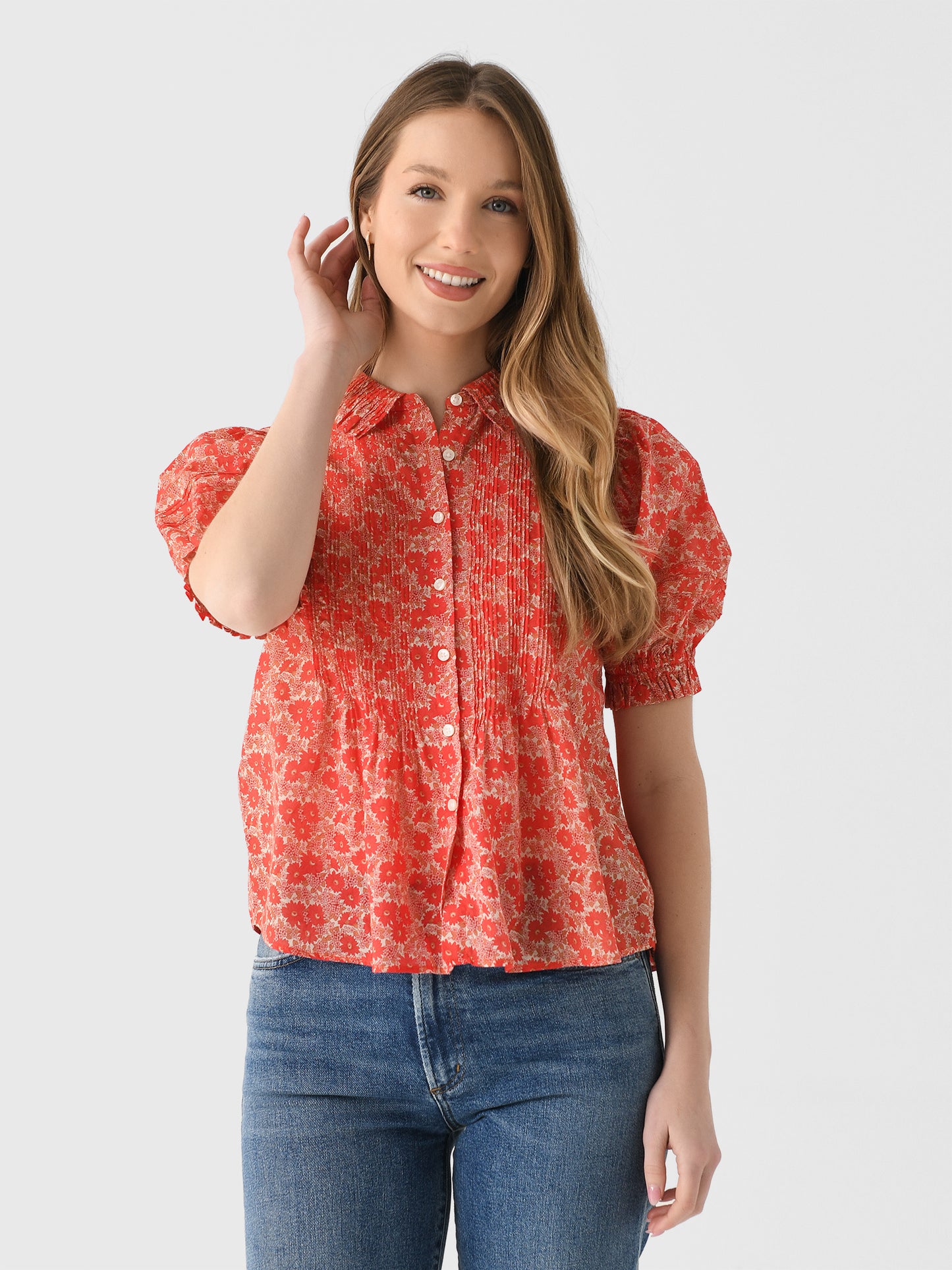 This breezy blouse features a flattering curved hemline, delicate pintucks, and a slightly cropped length for a touch of whimsy.