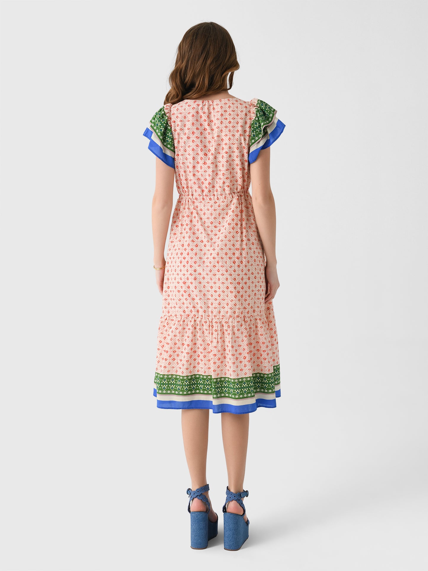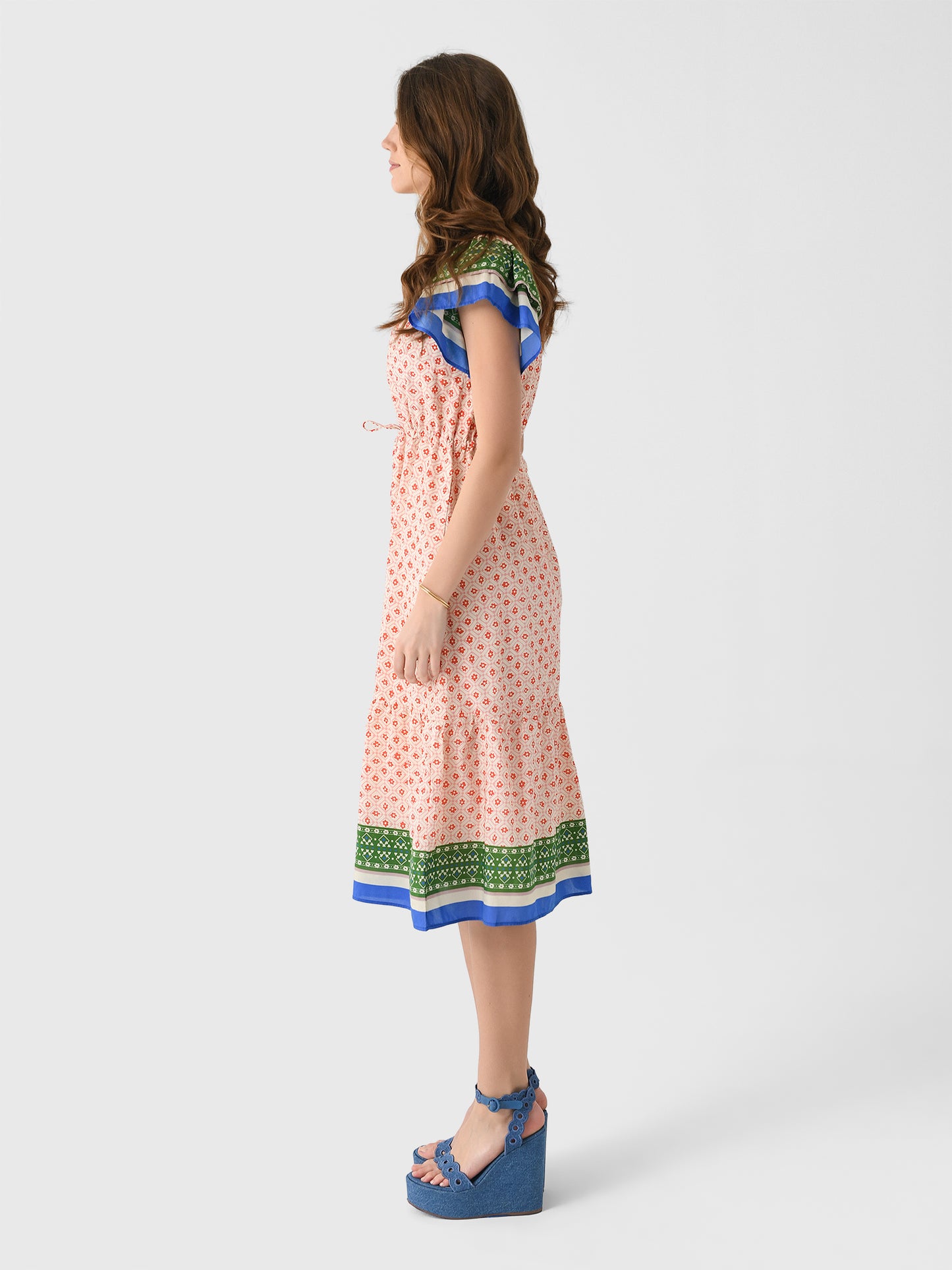 The Kristine Dress is a midi-length style featuring double flutter sleeves, a drawstring waist, and a flowing, gathered skirt.