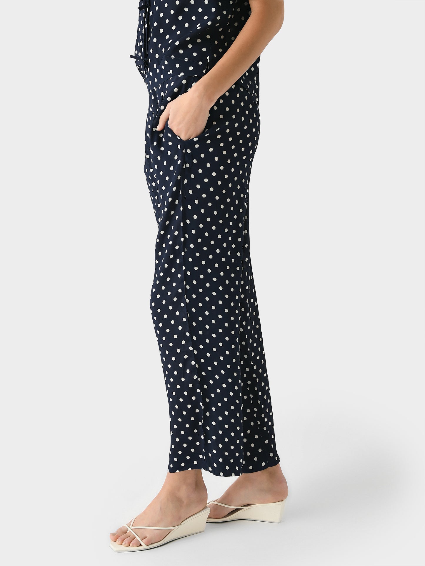 A polka dot-printed pull-on pant finished with a faux fly and straight-leg design.