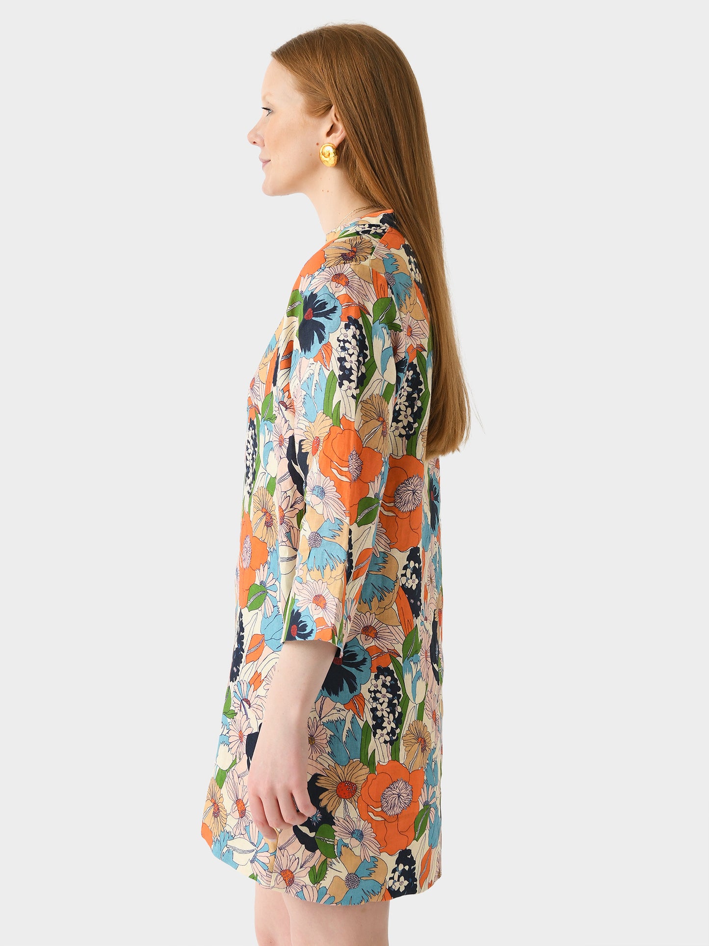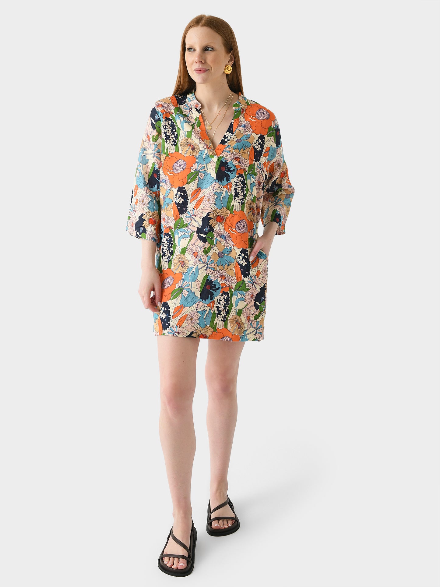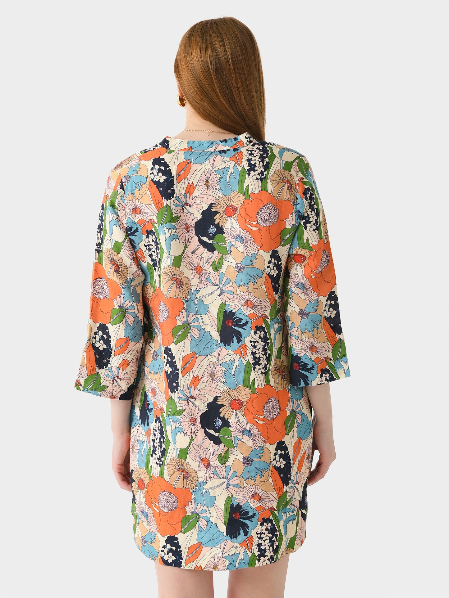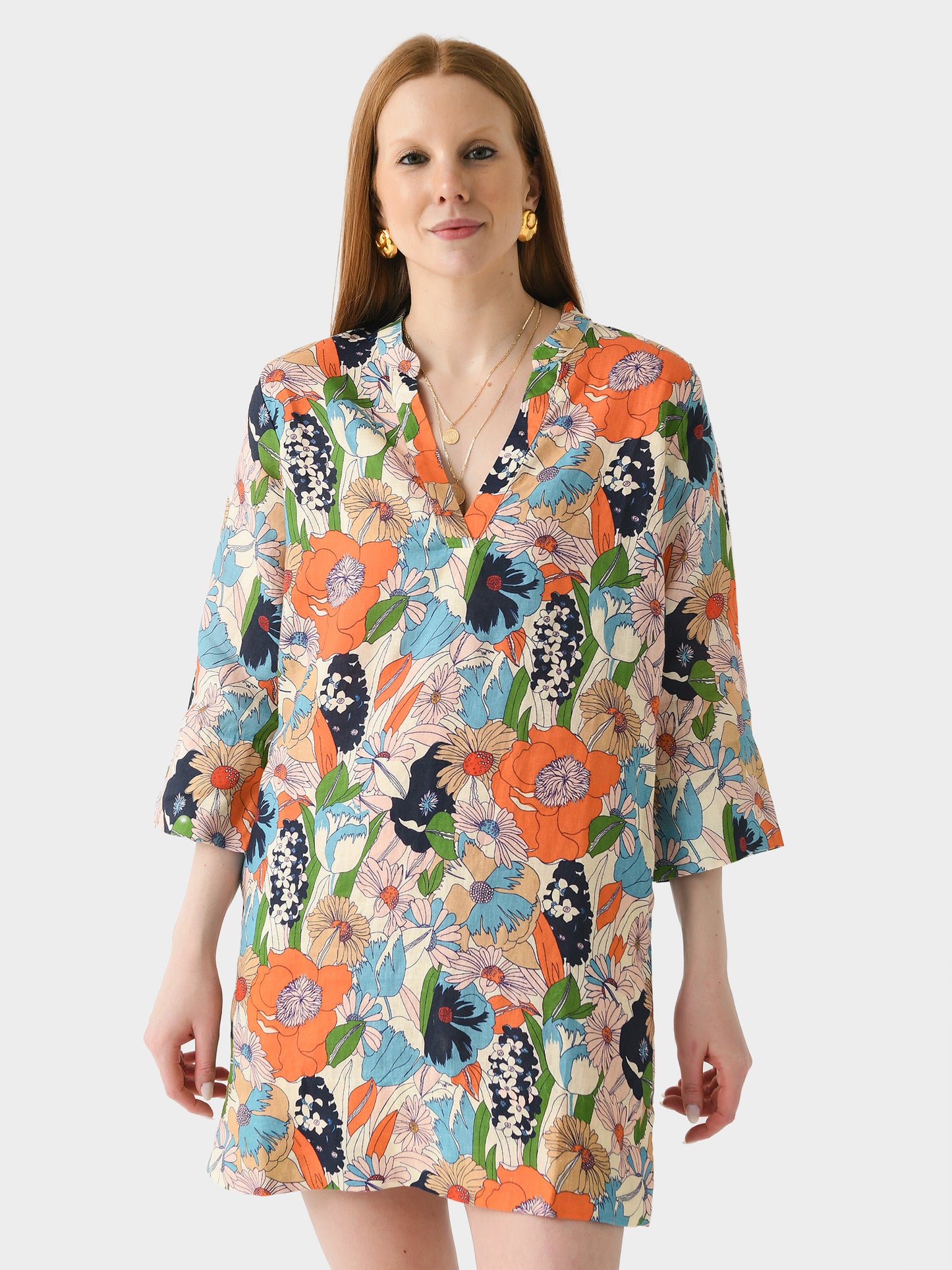 A casual shift dress made from lightweight linen with a colorful floral print.
