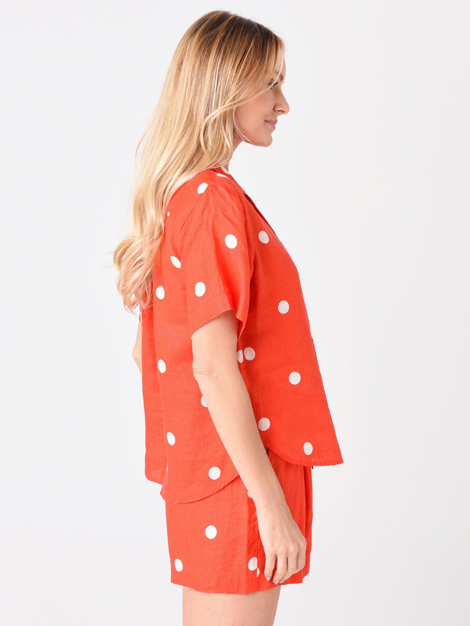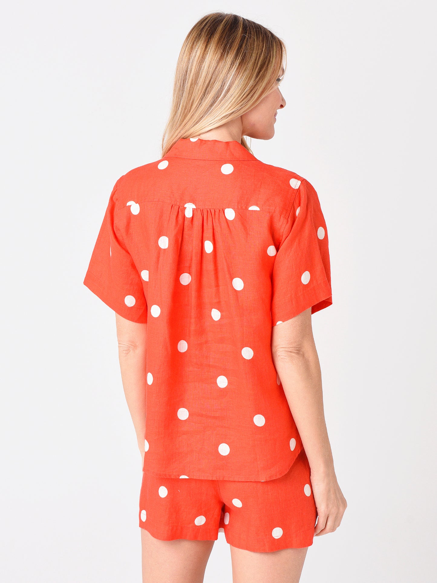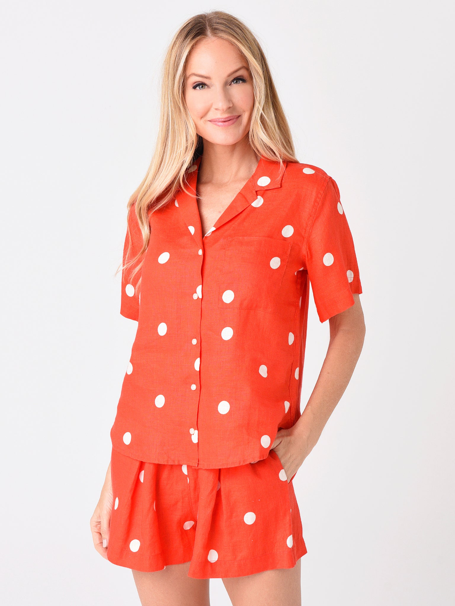 The Trovata Women's Margot Short Sleeve Camp shirt delivers a bright dot print to your casual and relaxed outdoorsy linen tops.