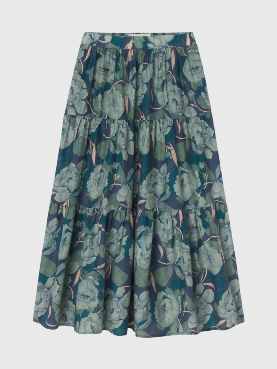 Crafted from an exquisite cotton-silk blend, this midi-length skirt offers a masterclass in fluid movement. It features a soft elastic waistband leading into a voluminous, three-tiered silhouette.