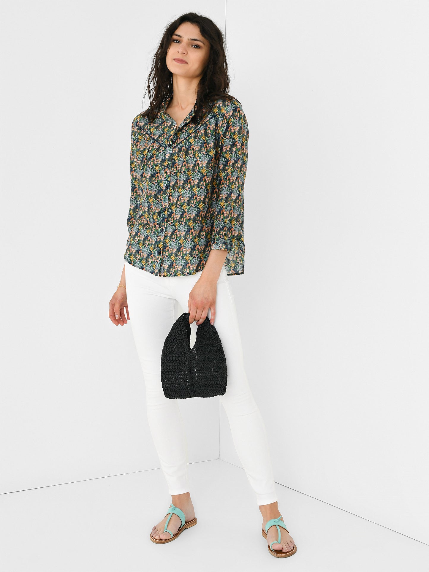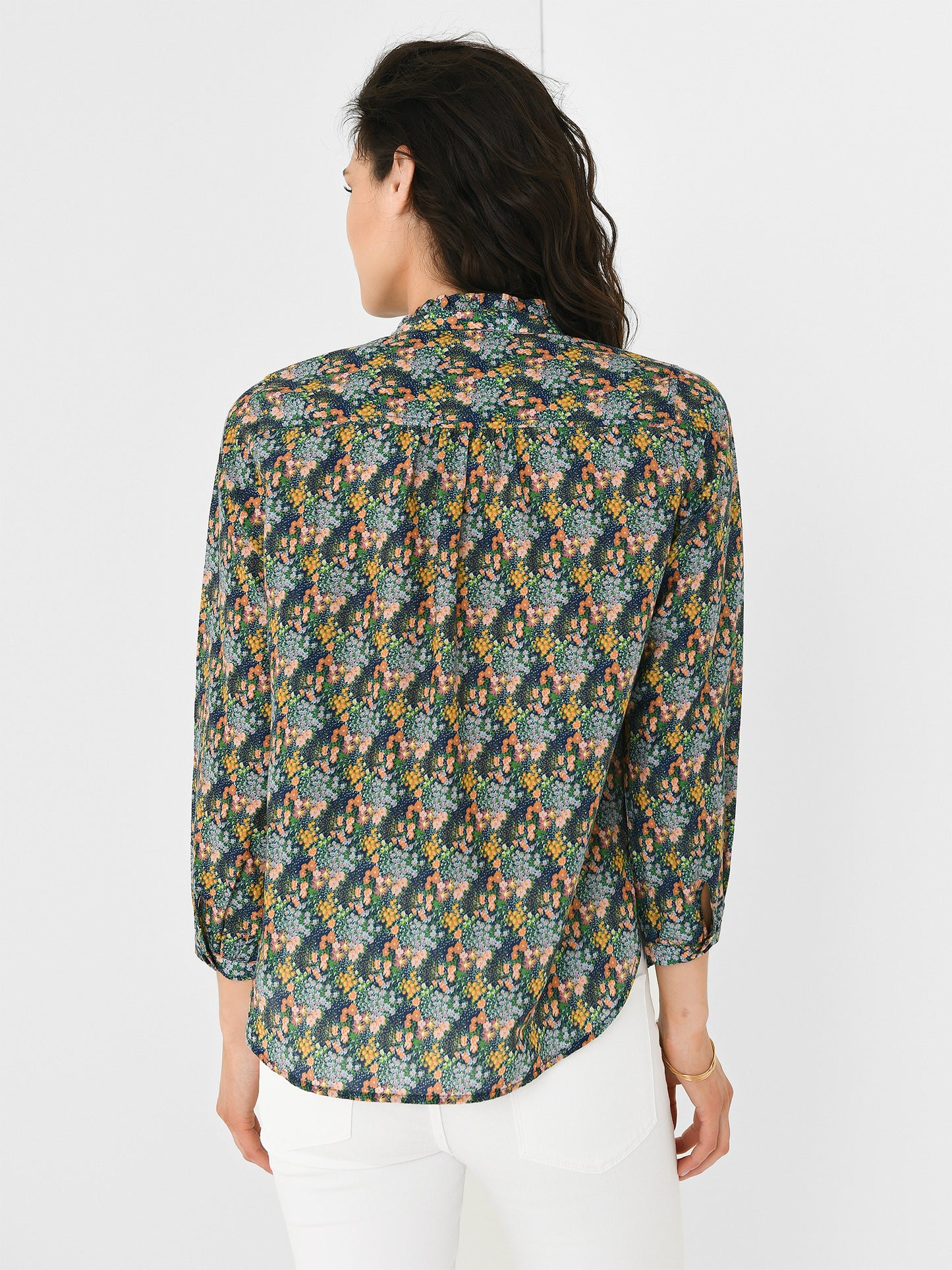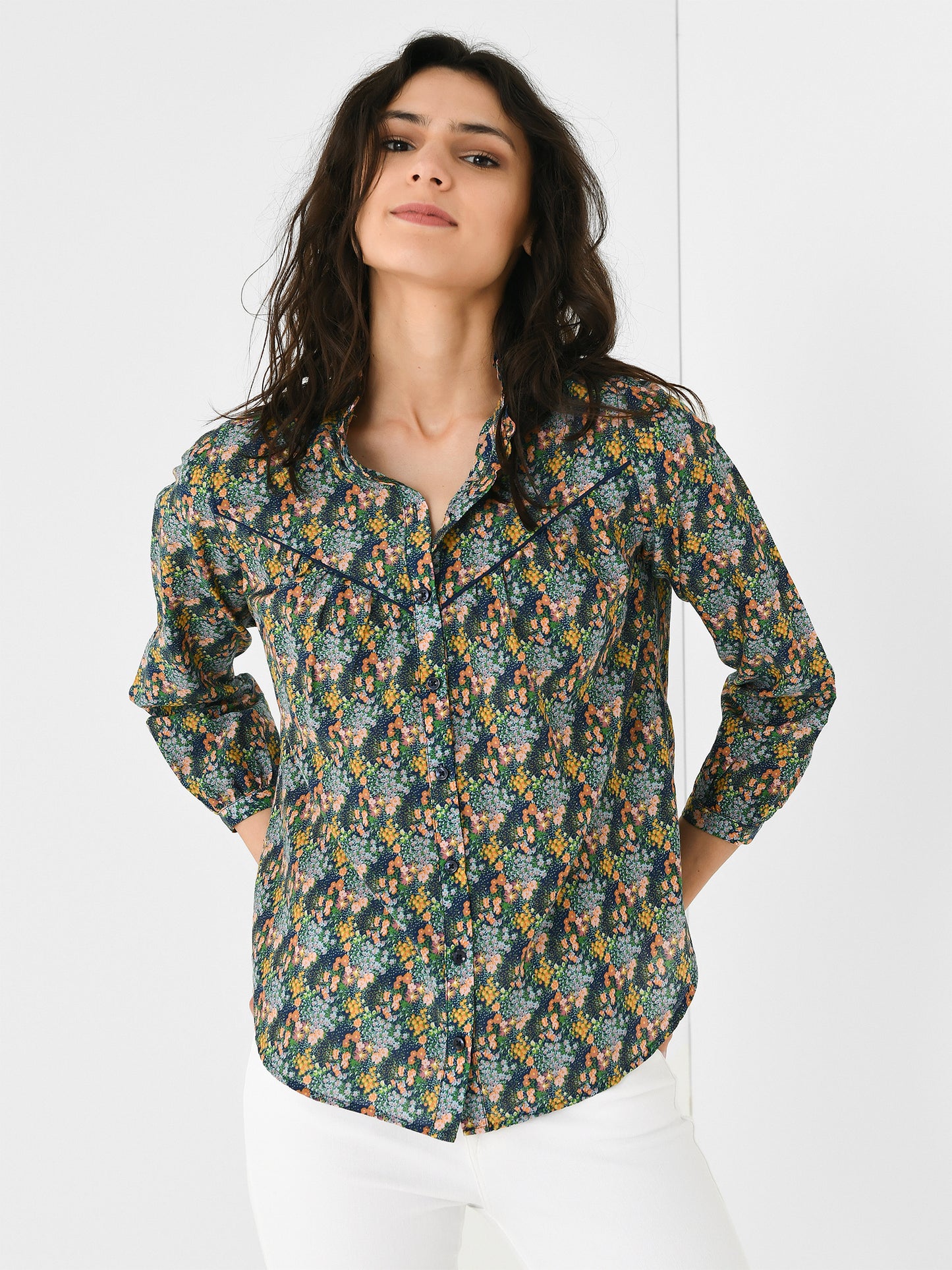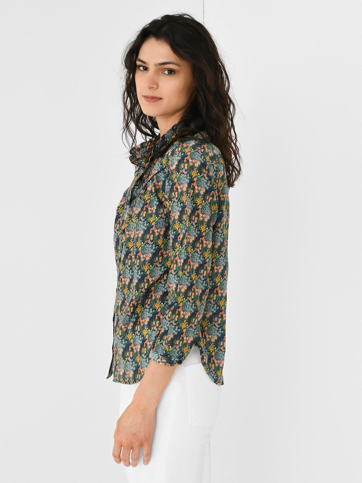 A floral-printed blouse constructed from lightweight cotton silk with a ruffle collar and a western-inspired yoke.
