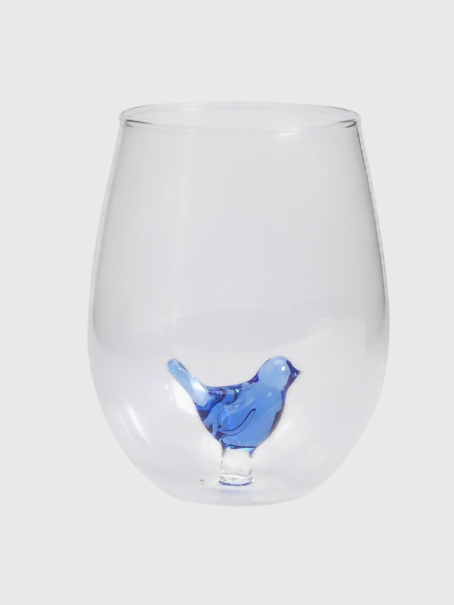 This hand-blown jumbo stemless wine glass features a delicate blue bird perched at its base, waiting to be discovered. Each bird is individually crafted, making every glass a one-of-a-kind treasure.