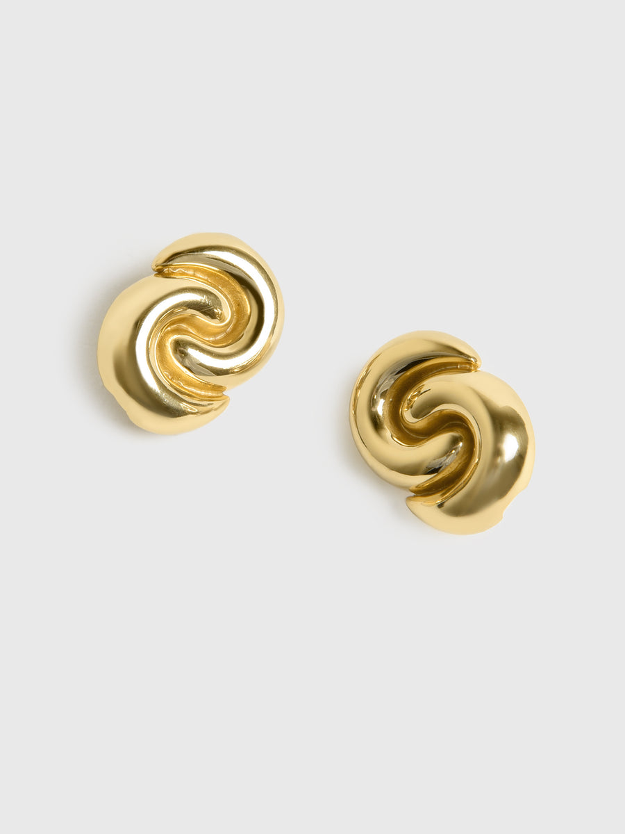 A pair of gold-plated brass earrings with an S-shaped swirl design.
