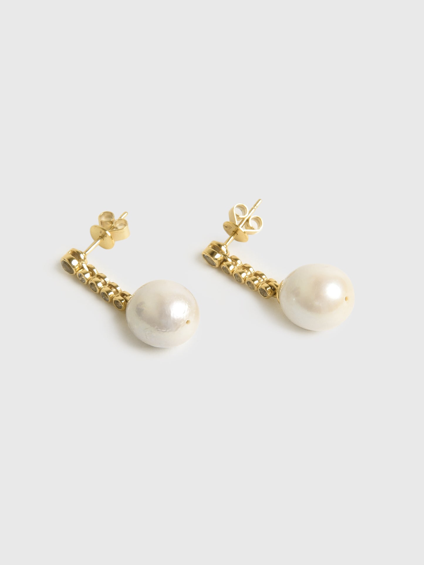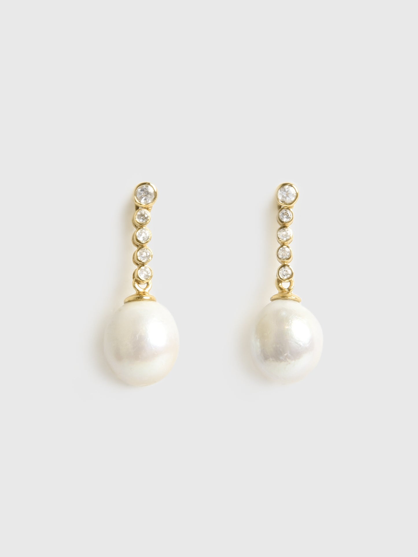 These delicate yet eye-catching plated brass drop earrings feature crystals and pearls, adding sophisticated playfulness to your casual or evening style.
