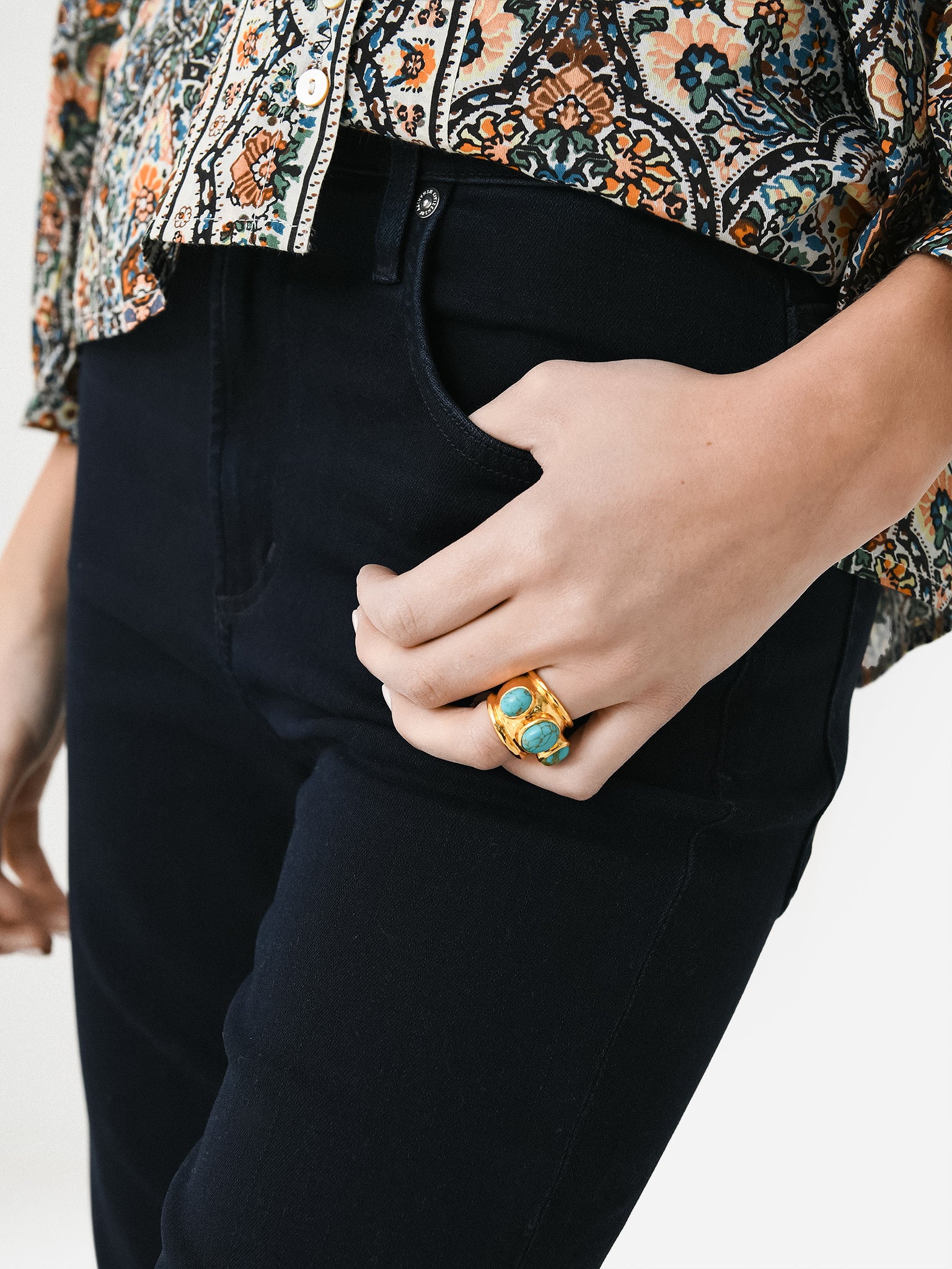 A 24-karat gold-plated brass ring adorned with green turquoise stones.