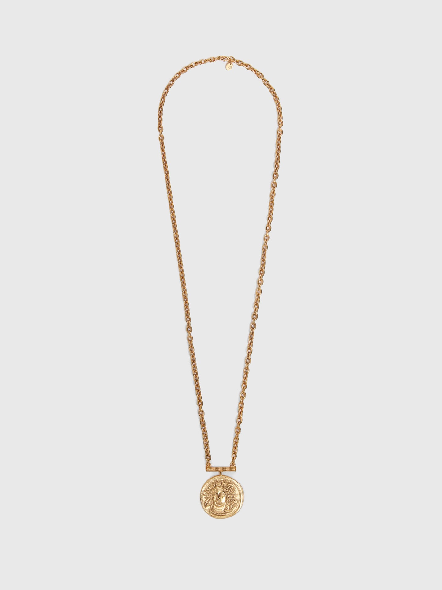 This long brass necklace exudes timeless elegance with a touch of antique charm. Its finely worked medal, reminiscent of vintage finds, creates a refined and bold look.