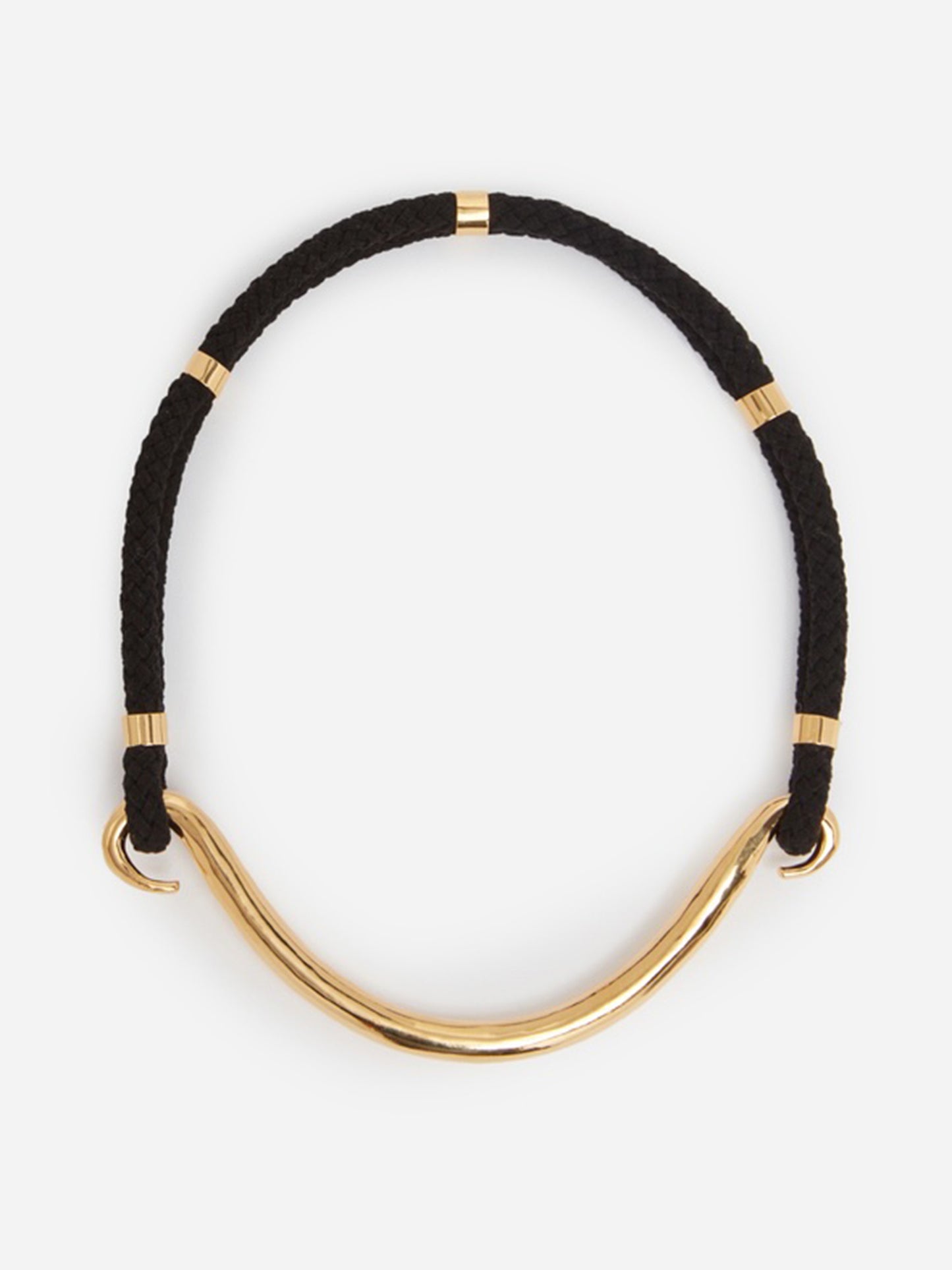 A braided necklace with brass detailing and an easy-on-and-off elastic strap.