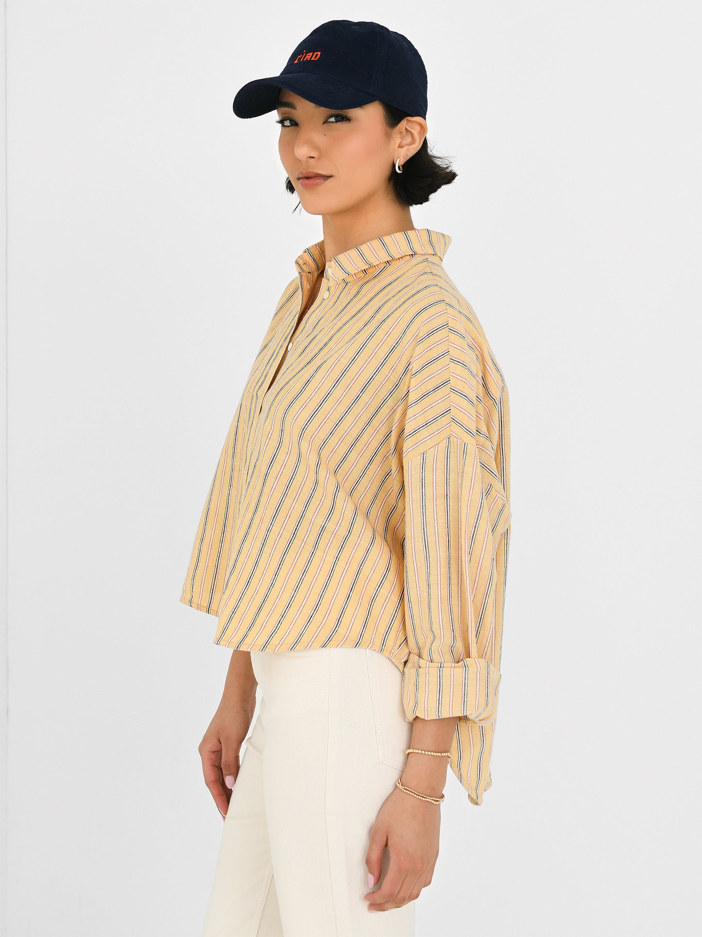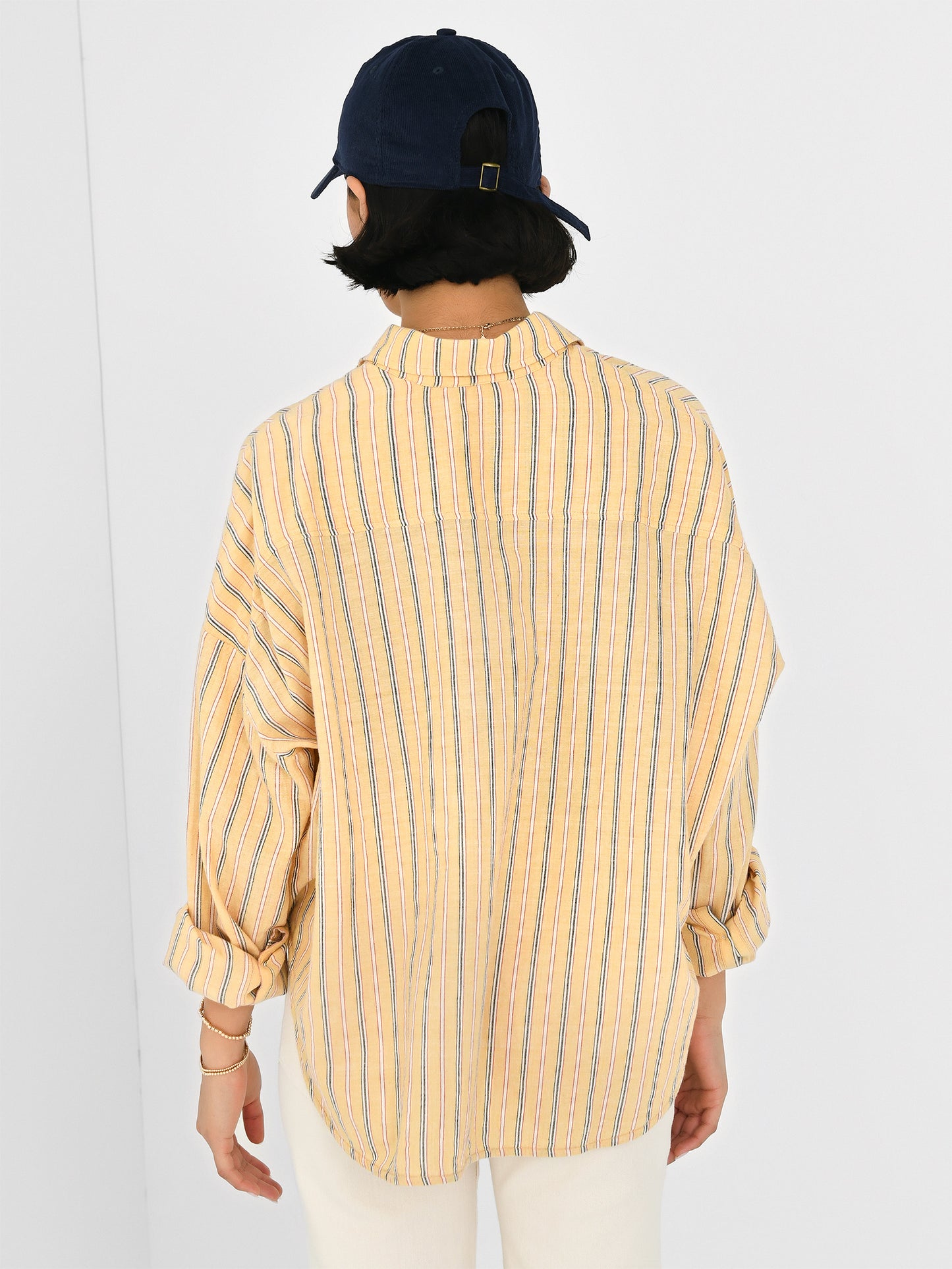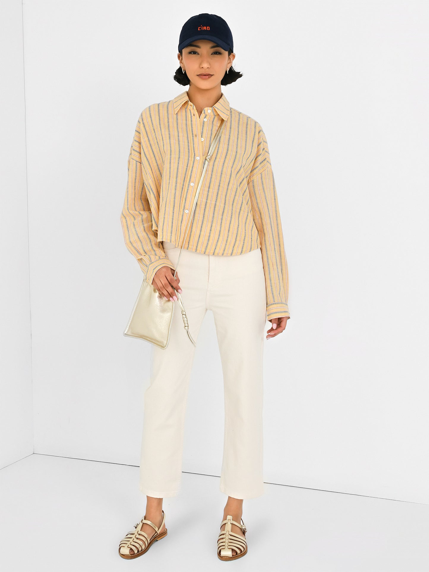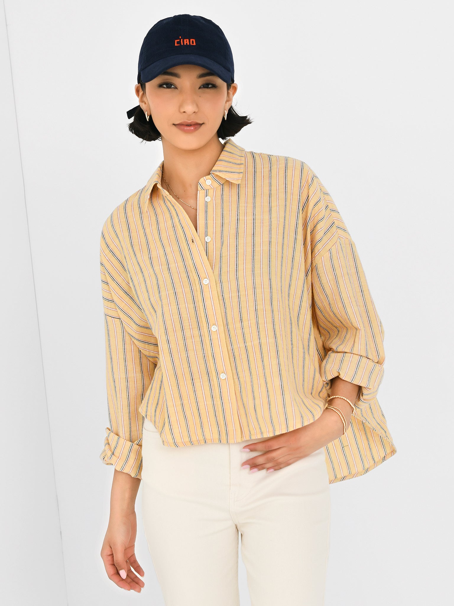 A lightweight cotton button-down shirt with a subtle high-low silhouette and vertical striped print.