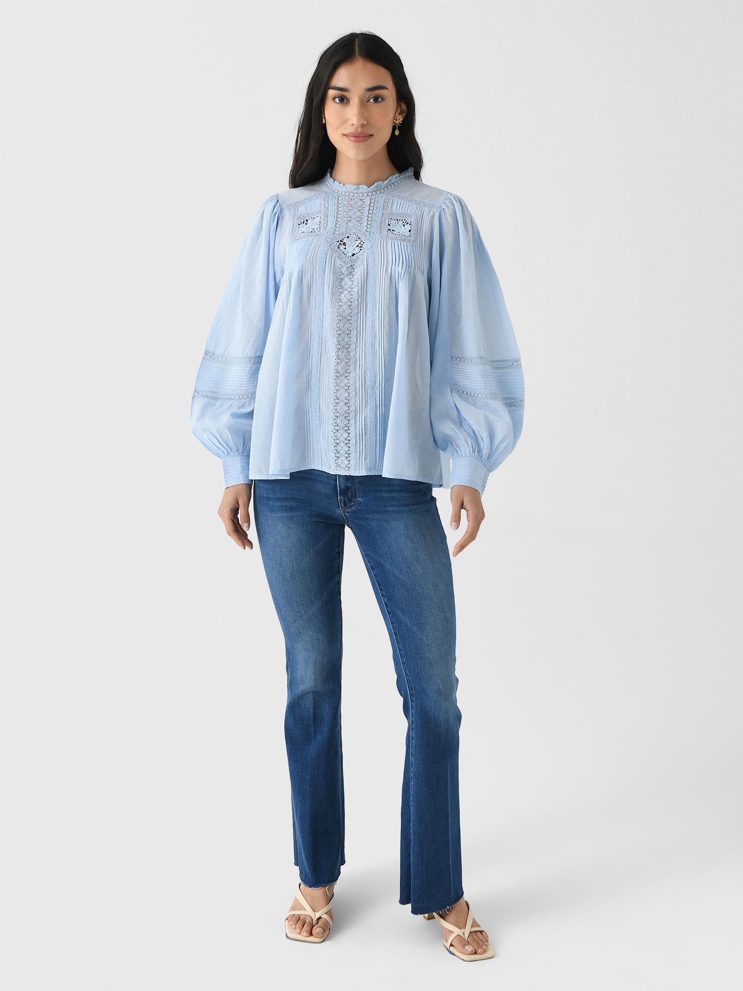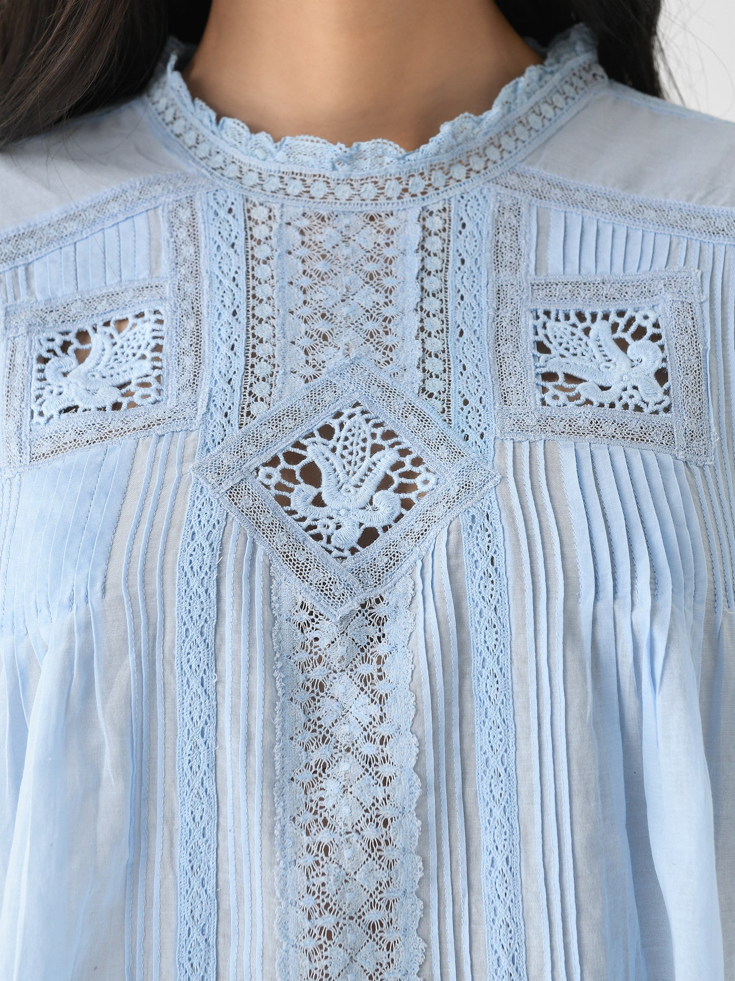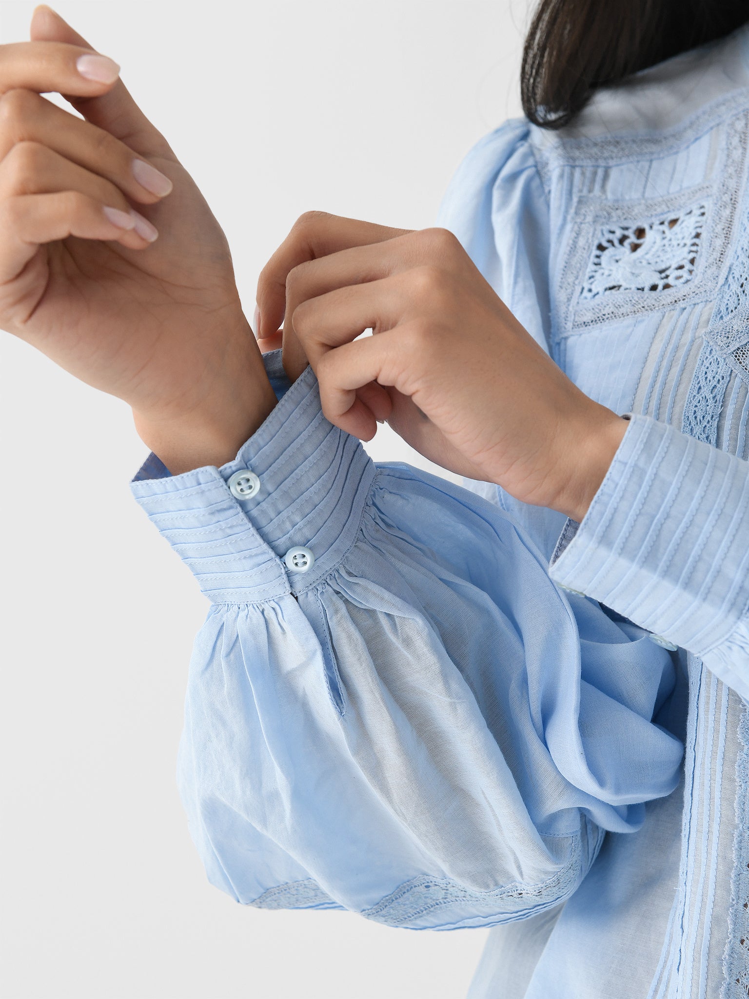Embrace vintage elegance with this exquisite blouse. Delicate quilted pleats, lace inlays, puffed sleeves, and a ruffled Victorian collar create a romantic and feminine look.