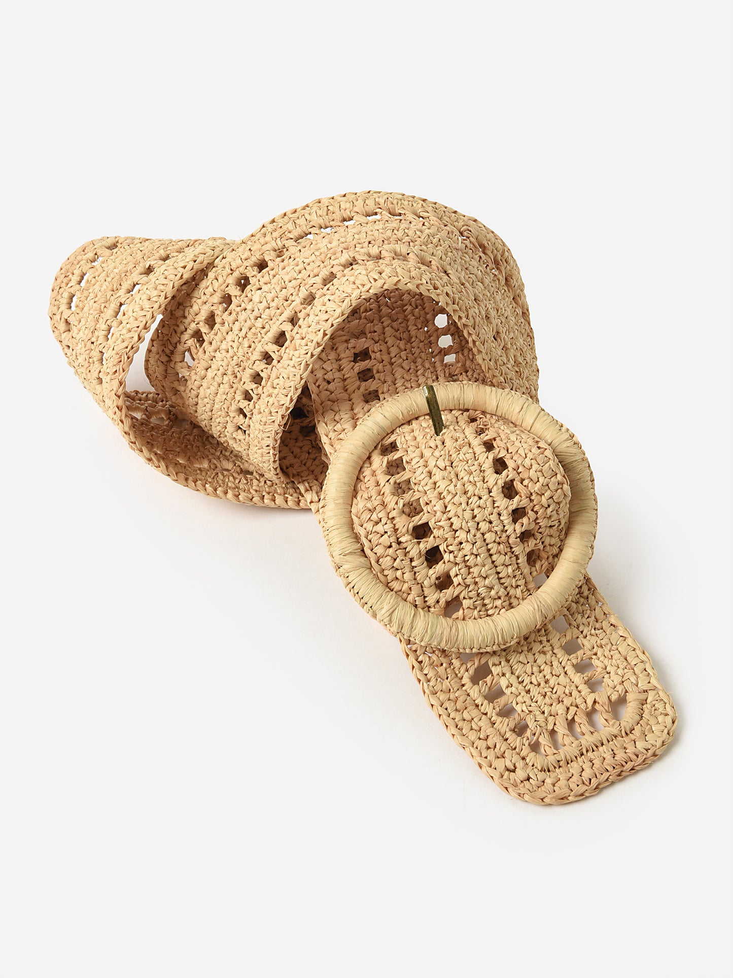 A handwoven Bohemian belt made from natural raffia with an open-crochet design.