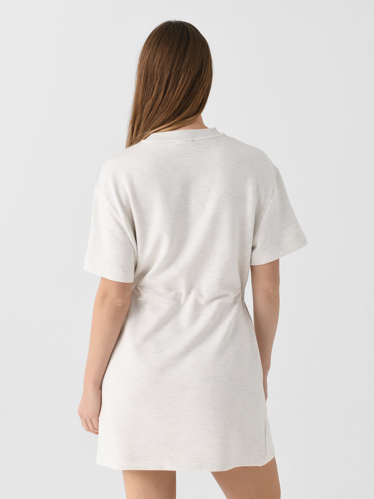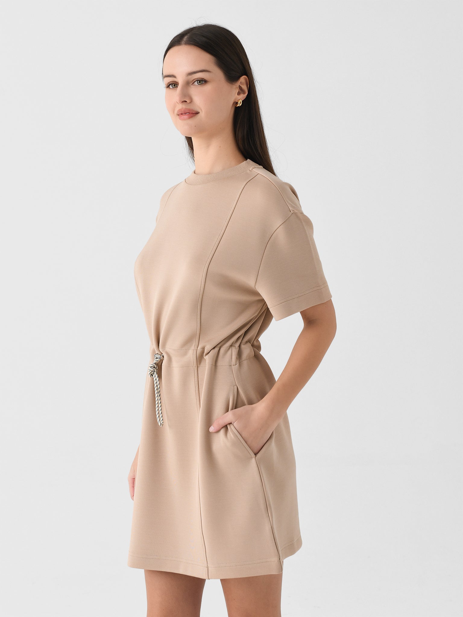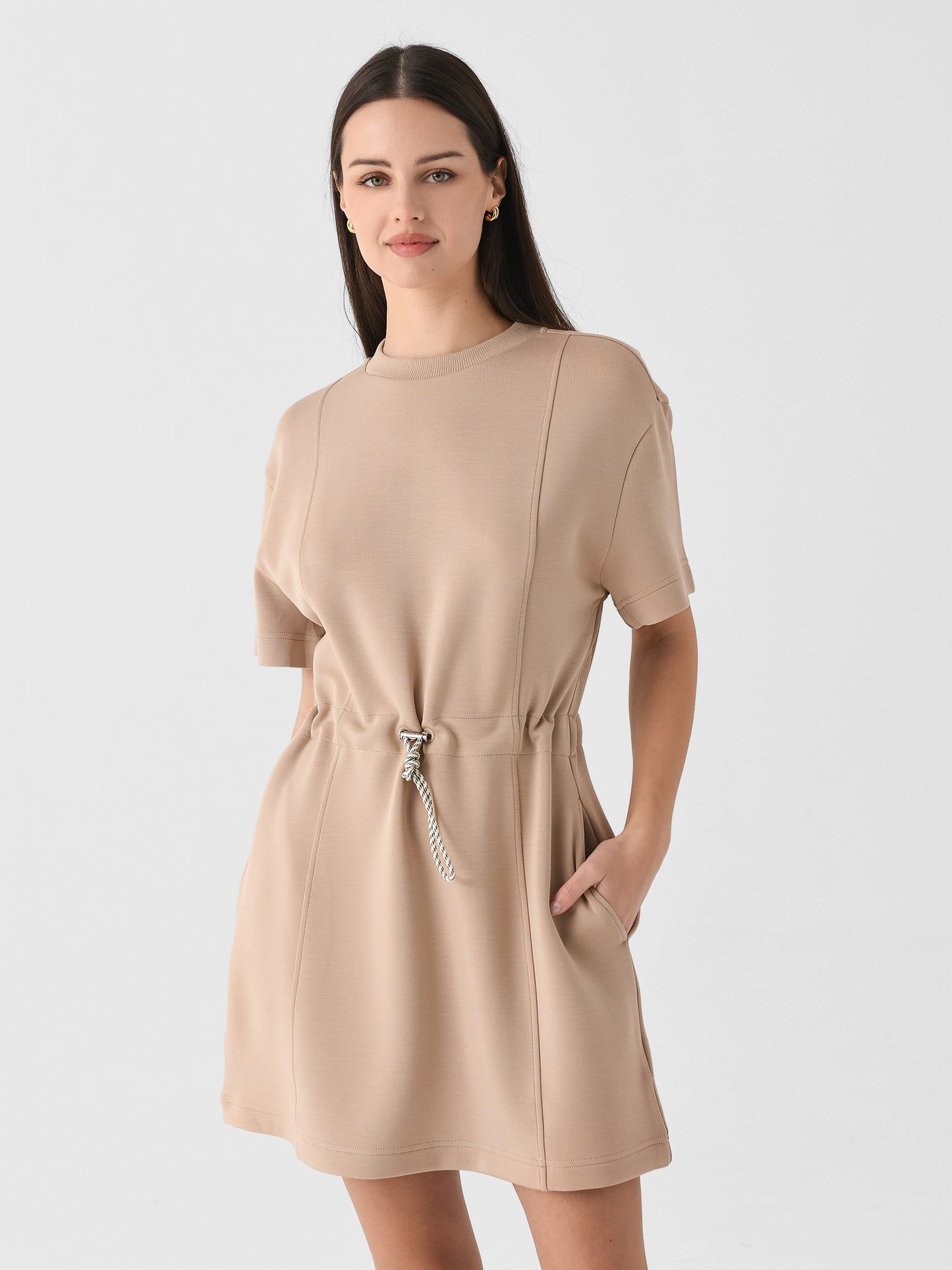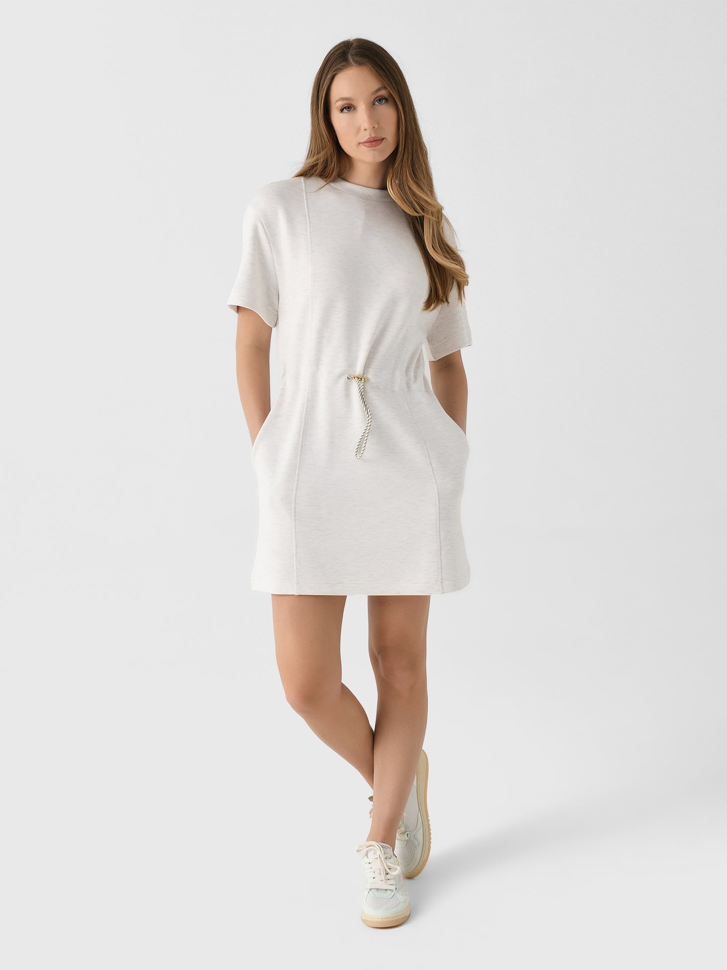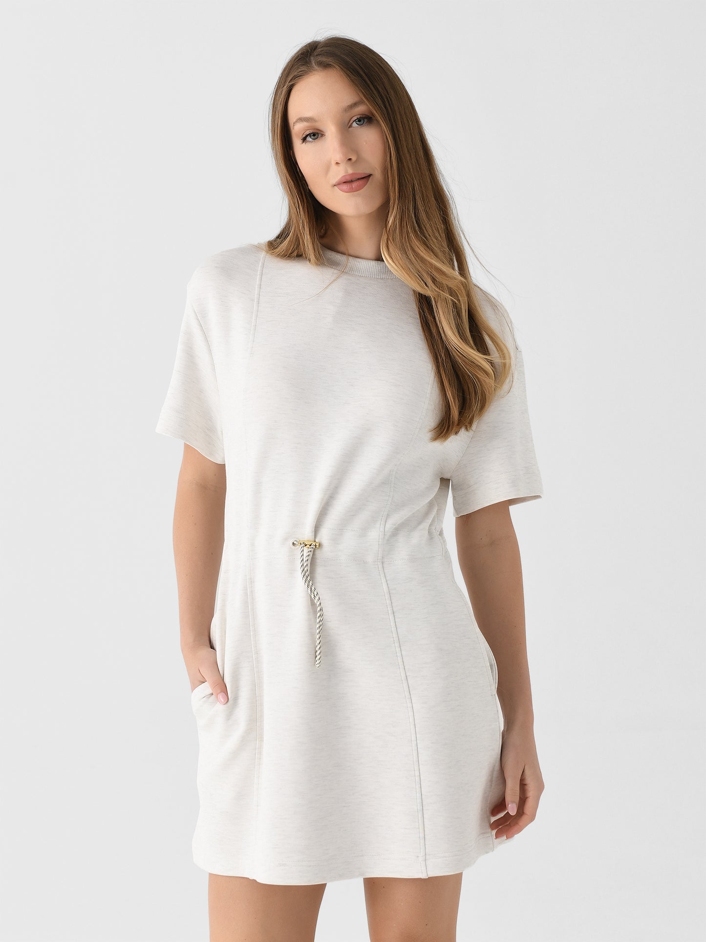 This dress, made from signature DoubleSoft® fabric, combines the classic crew neck and short sleeves look with a cinched waistline inspired by Varley's bestselling Freya sweatshirt.