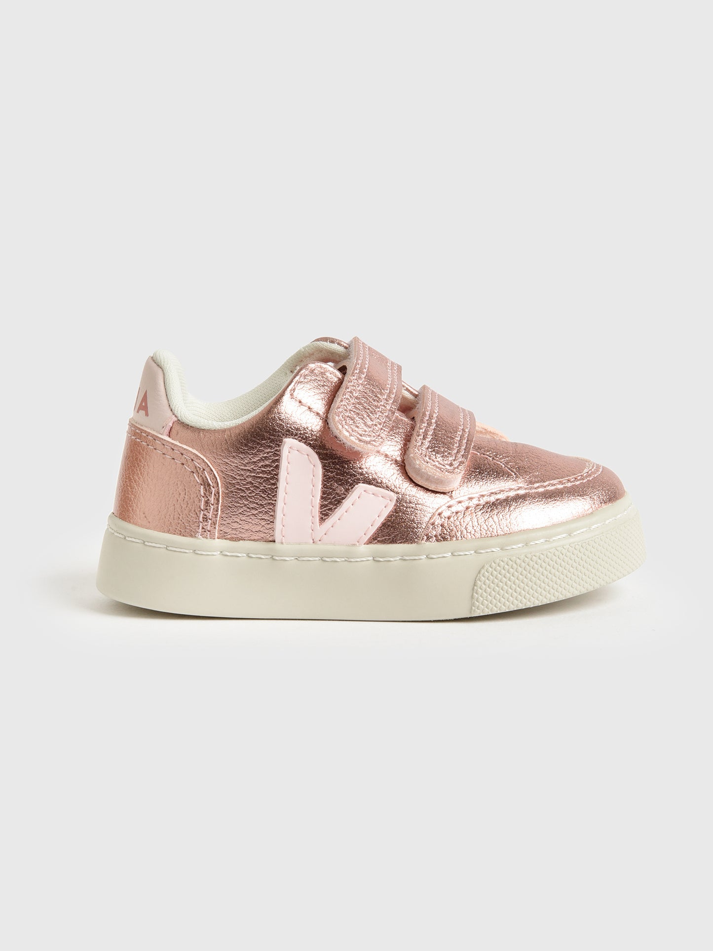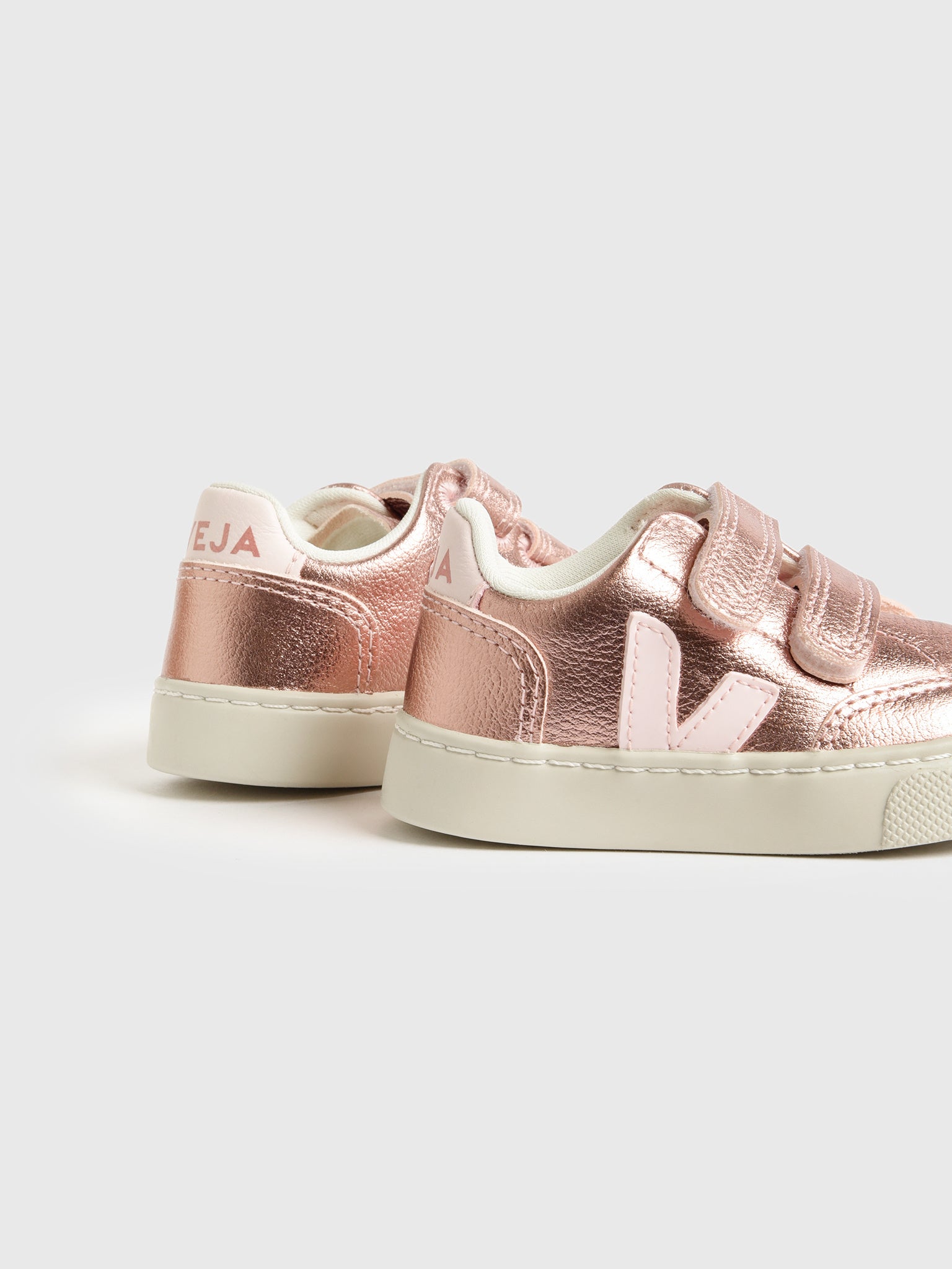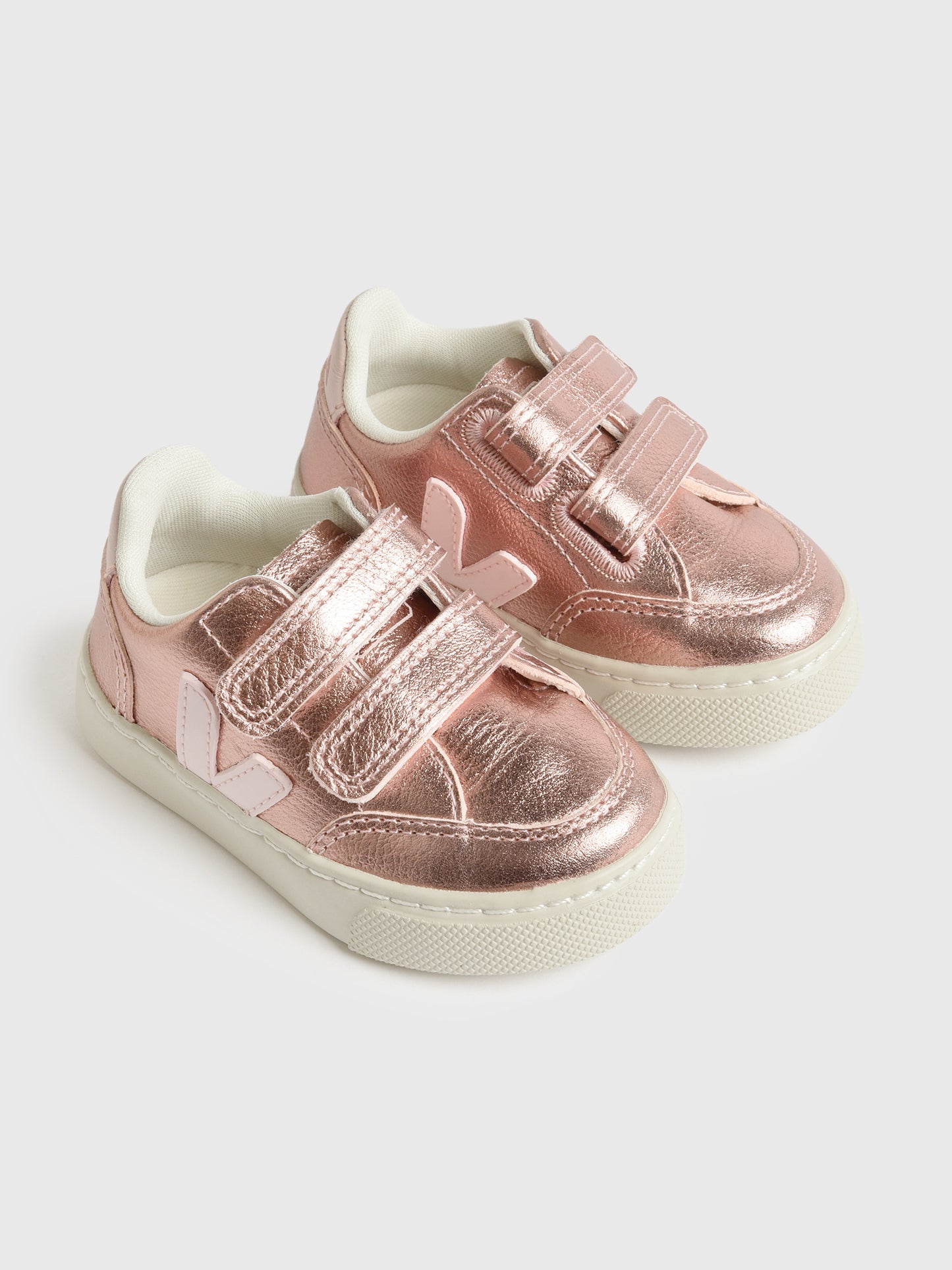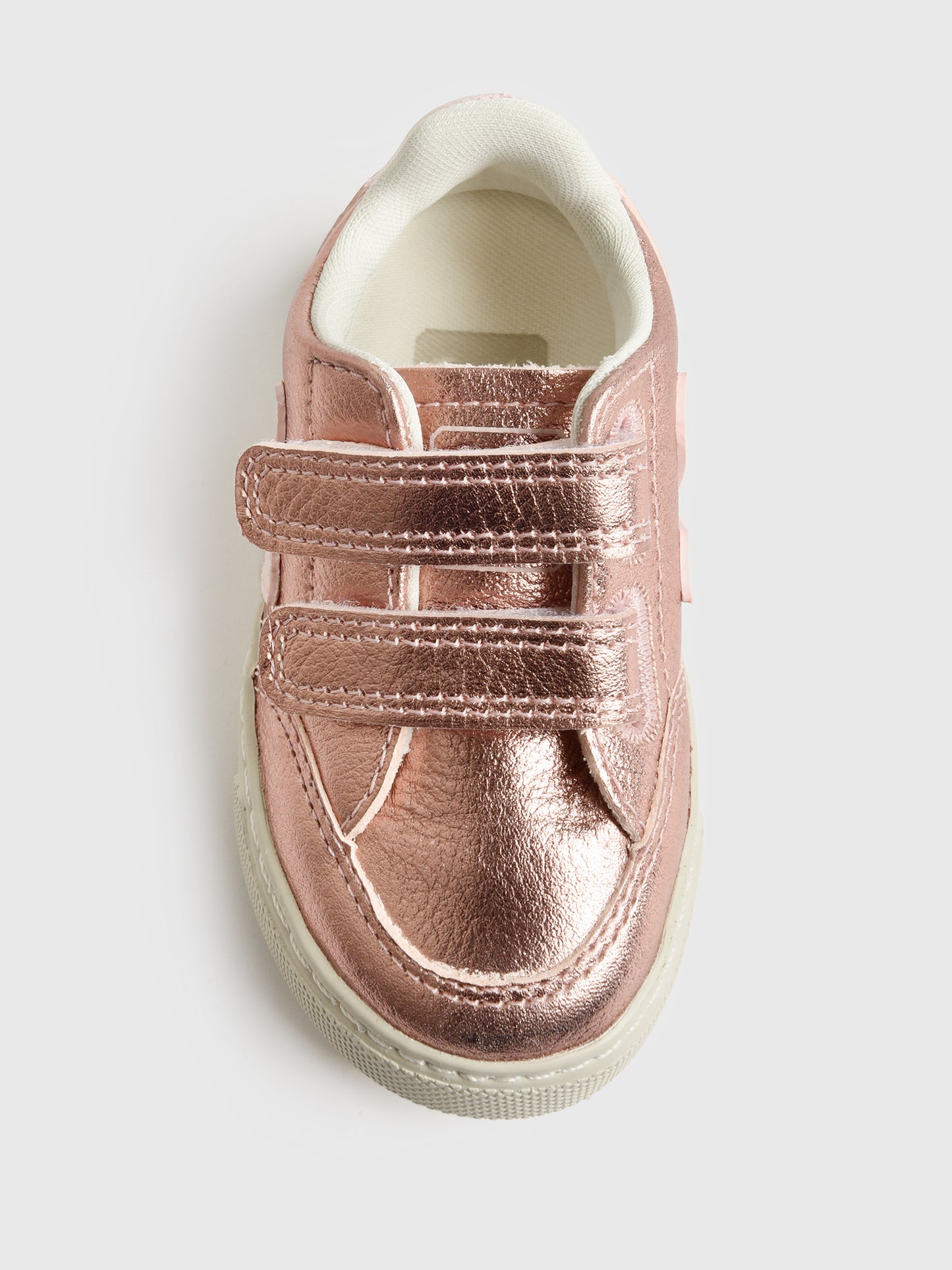 A best-selling velcro sneaker made from chromefree pink metallic leather.