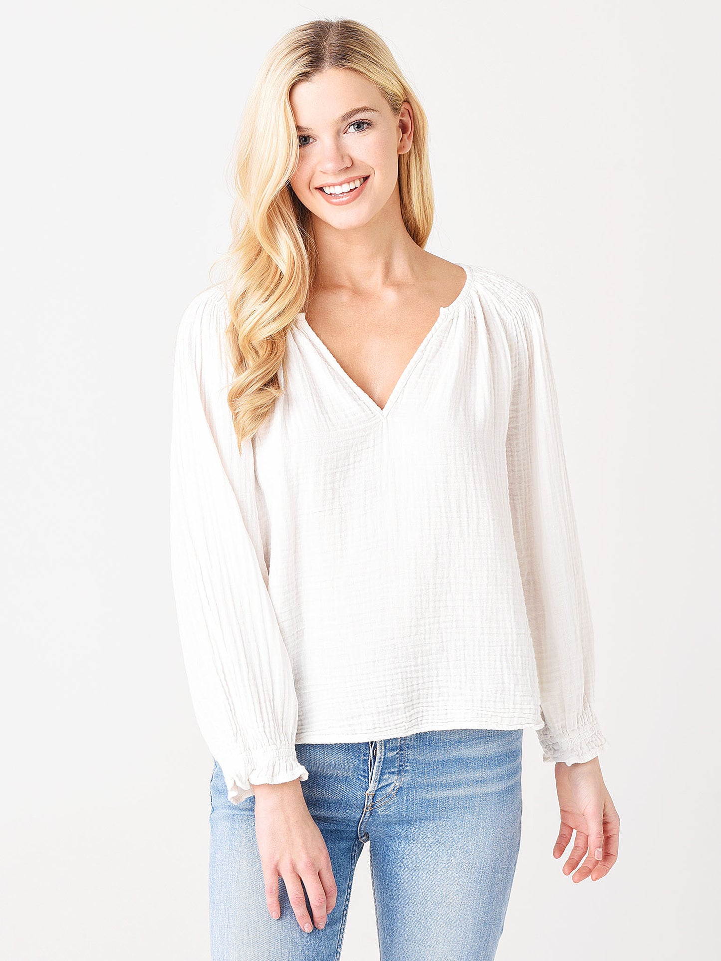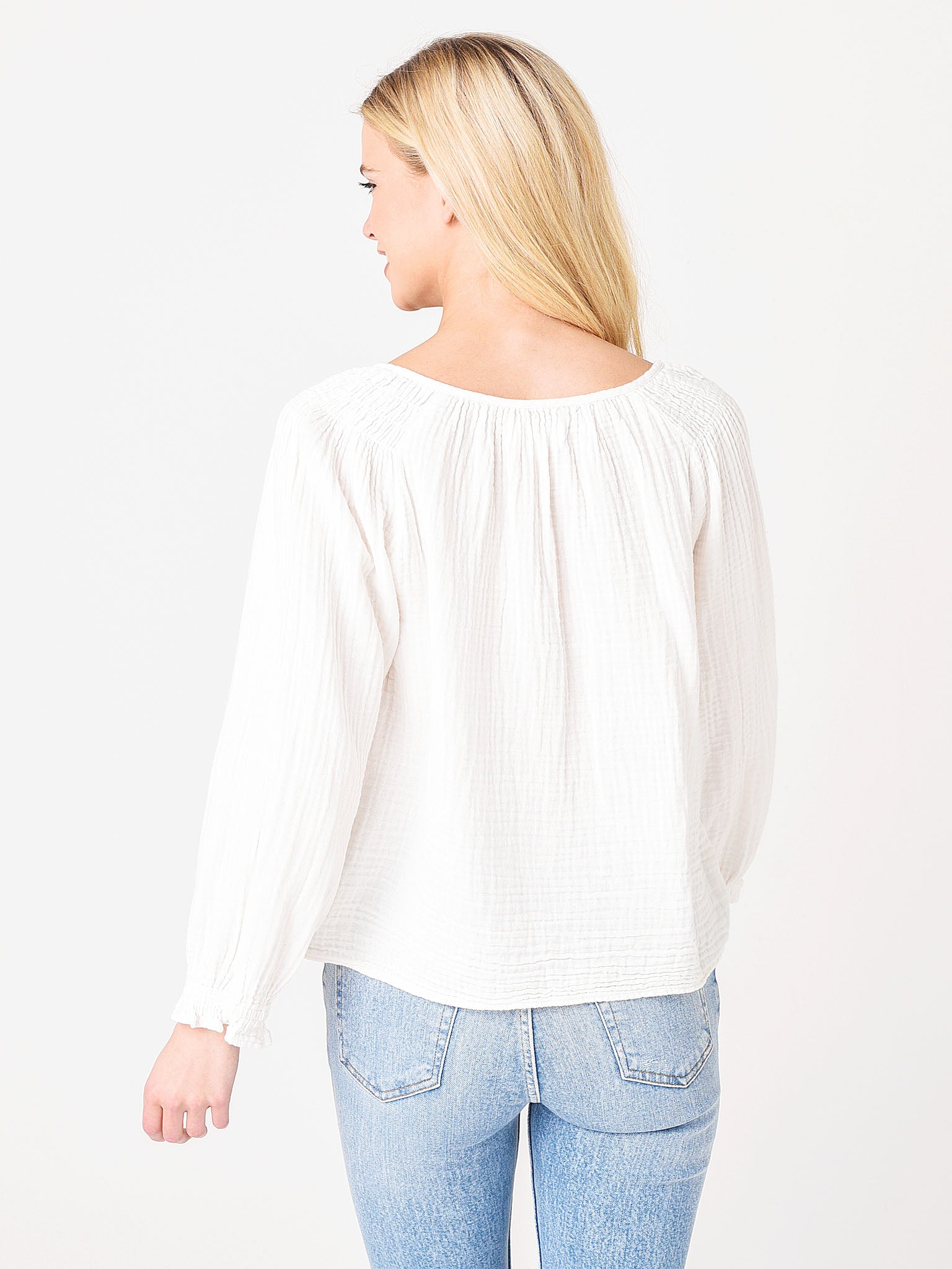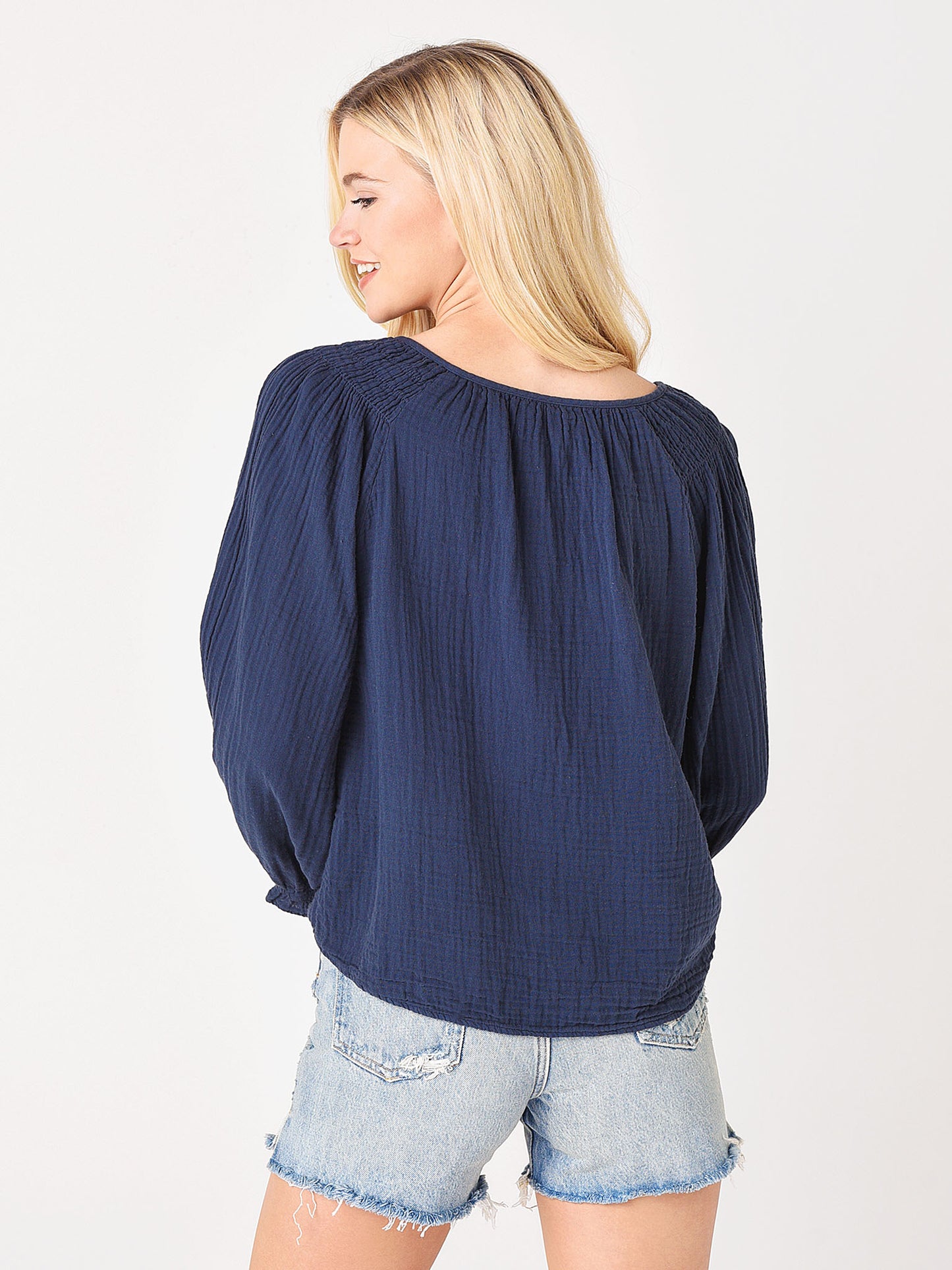 A long sleeve gauze top with a smocked shoulder detail.