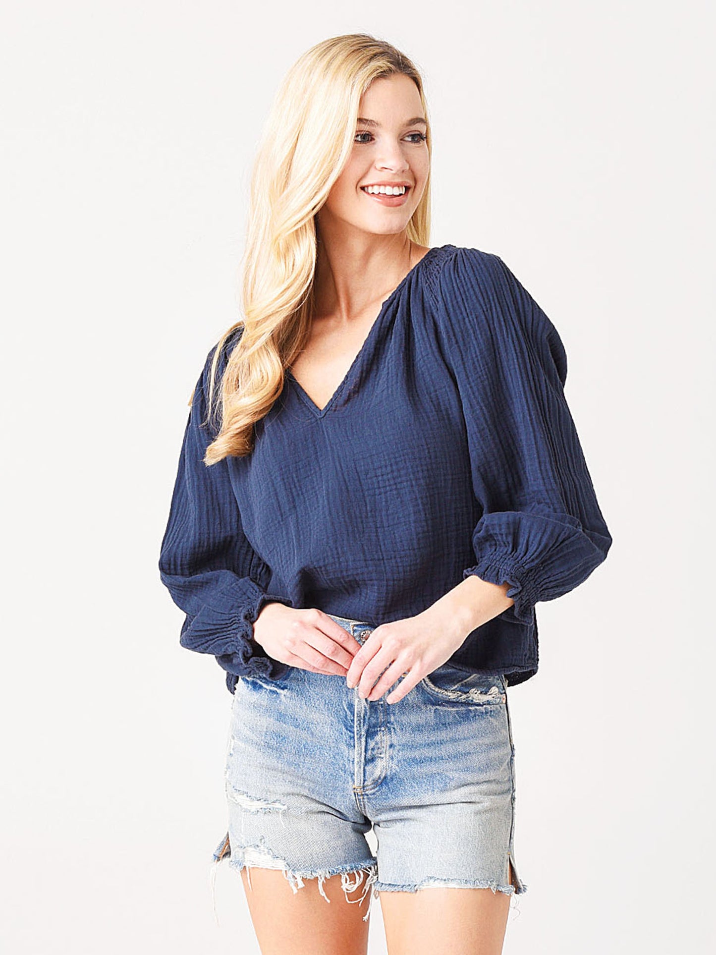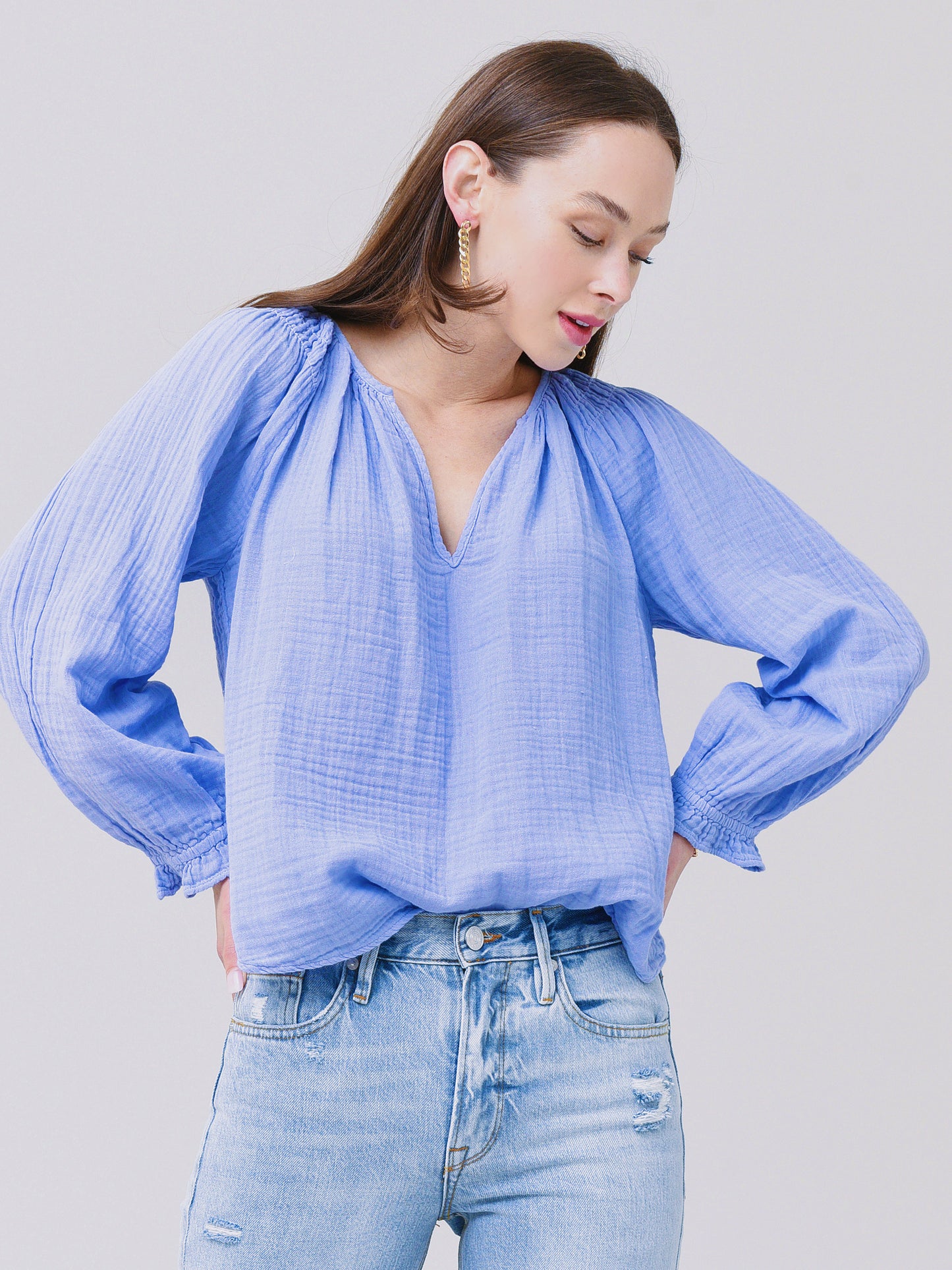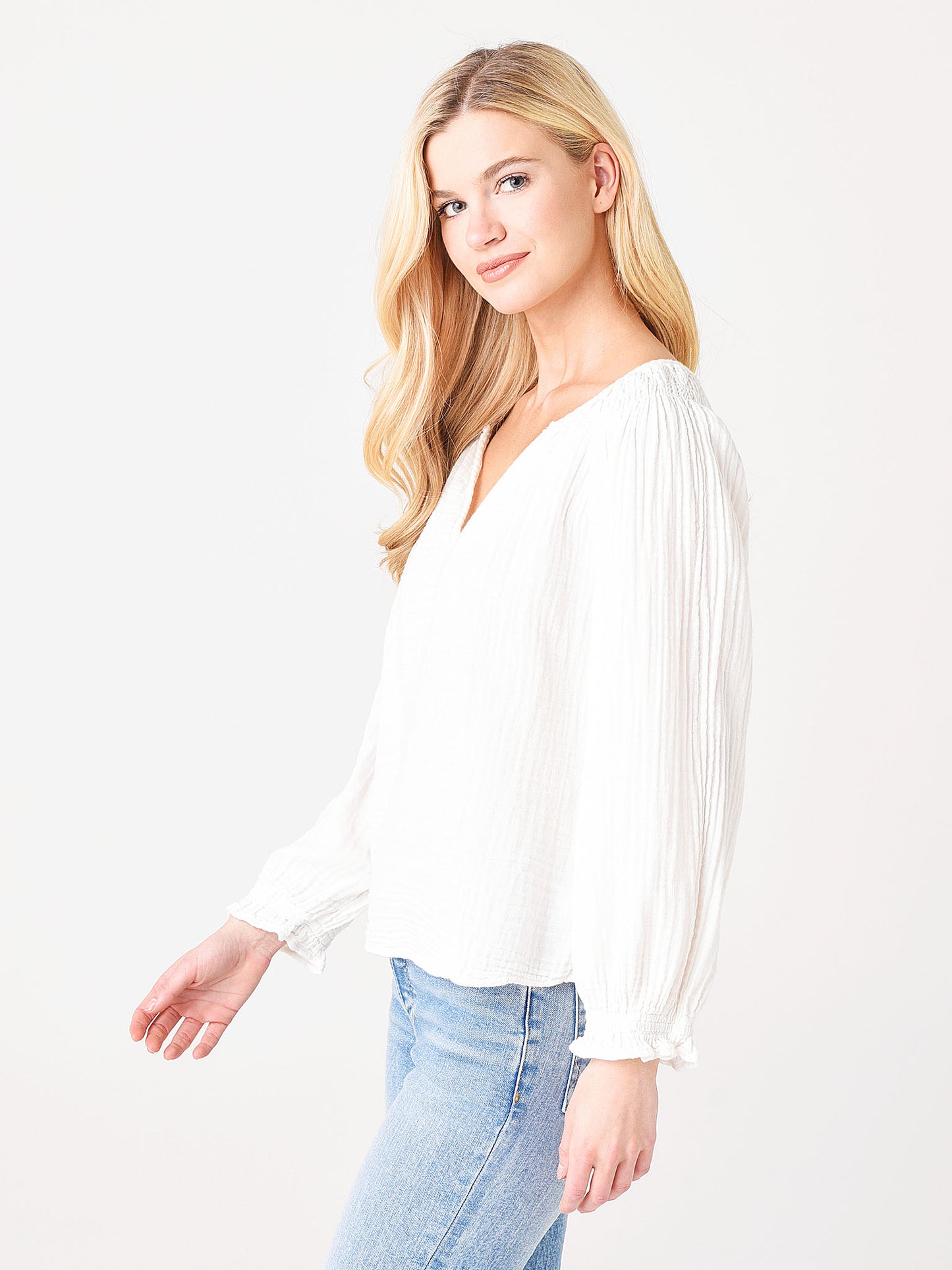 A long sleeve gauze top with a smocked shoulder detail.
