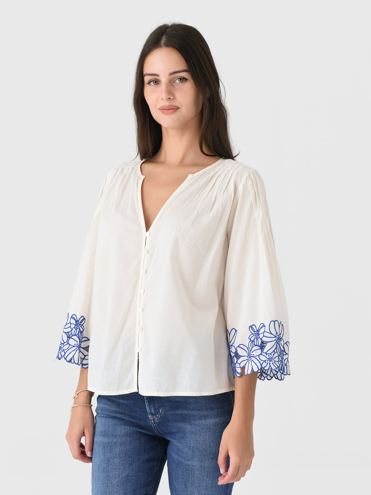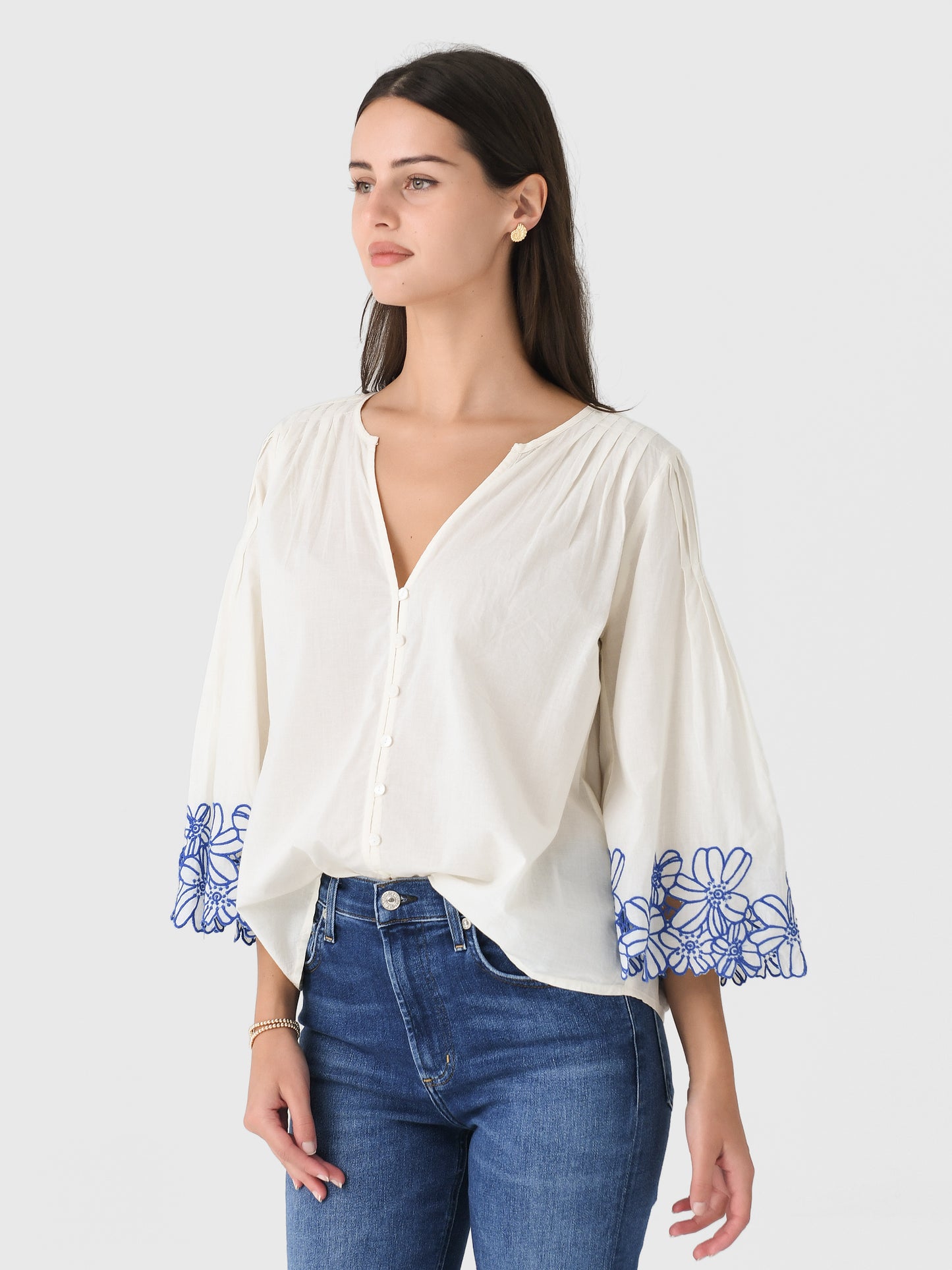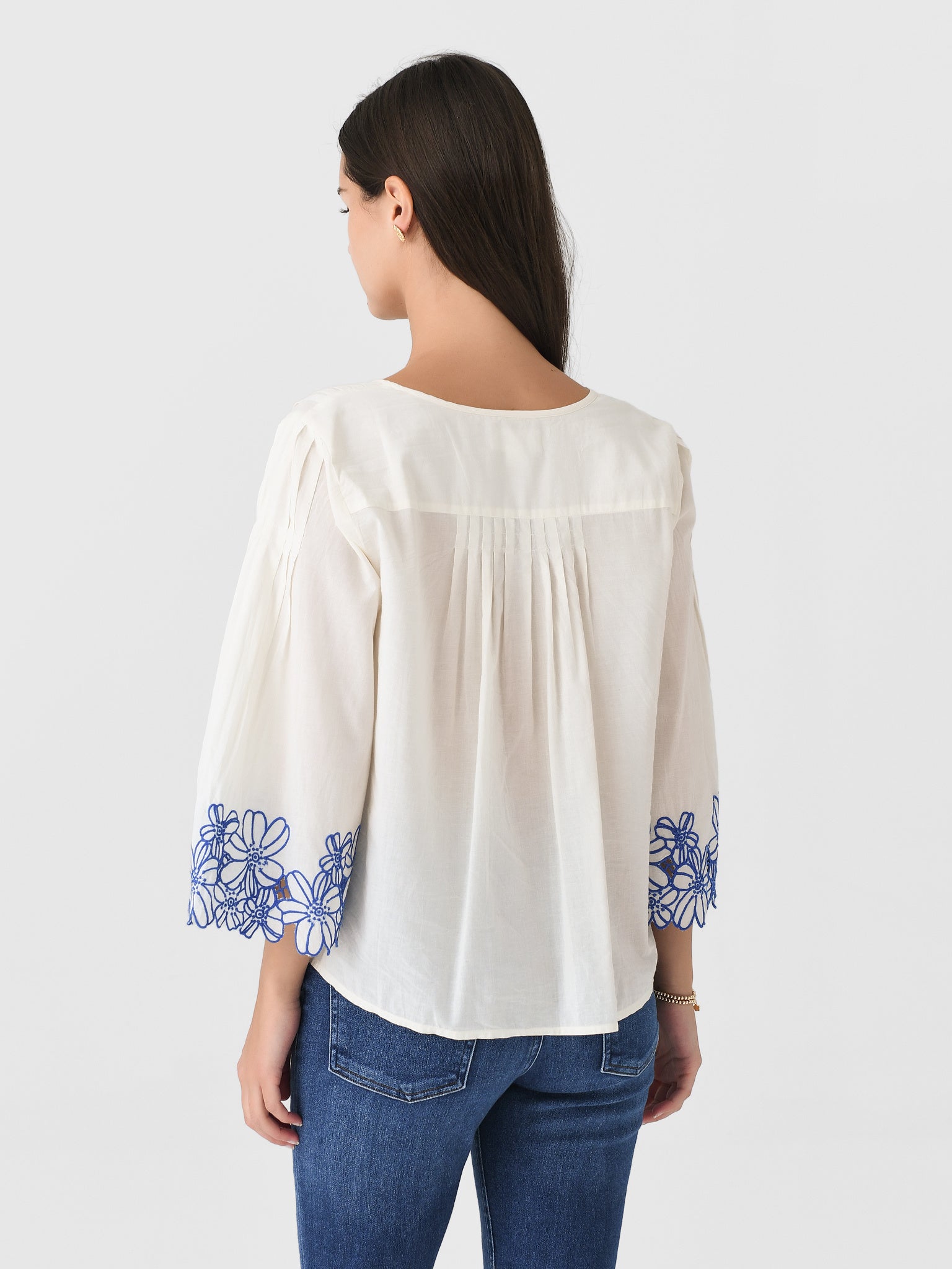 A lightweight cotton blouse featuring pintuck details and half-length sleeves with floral embroidered trims.
