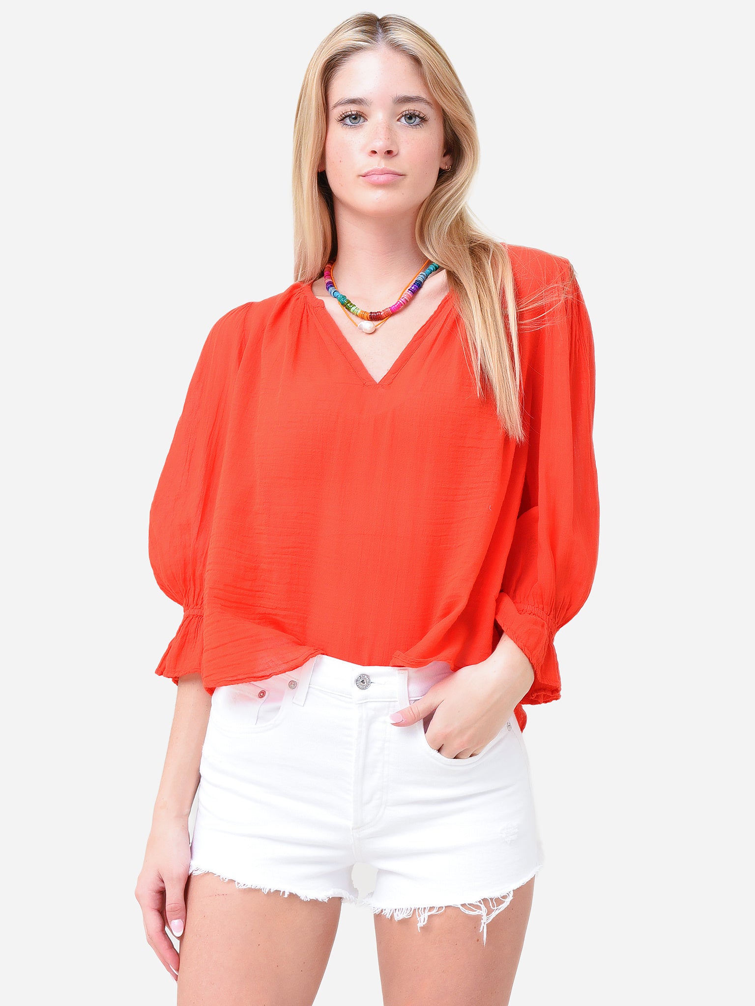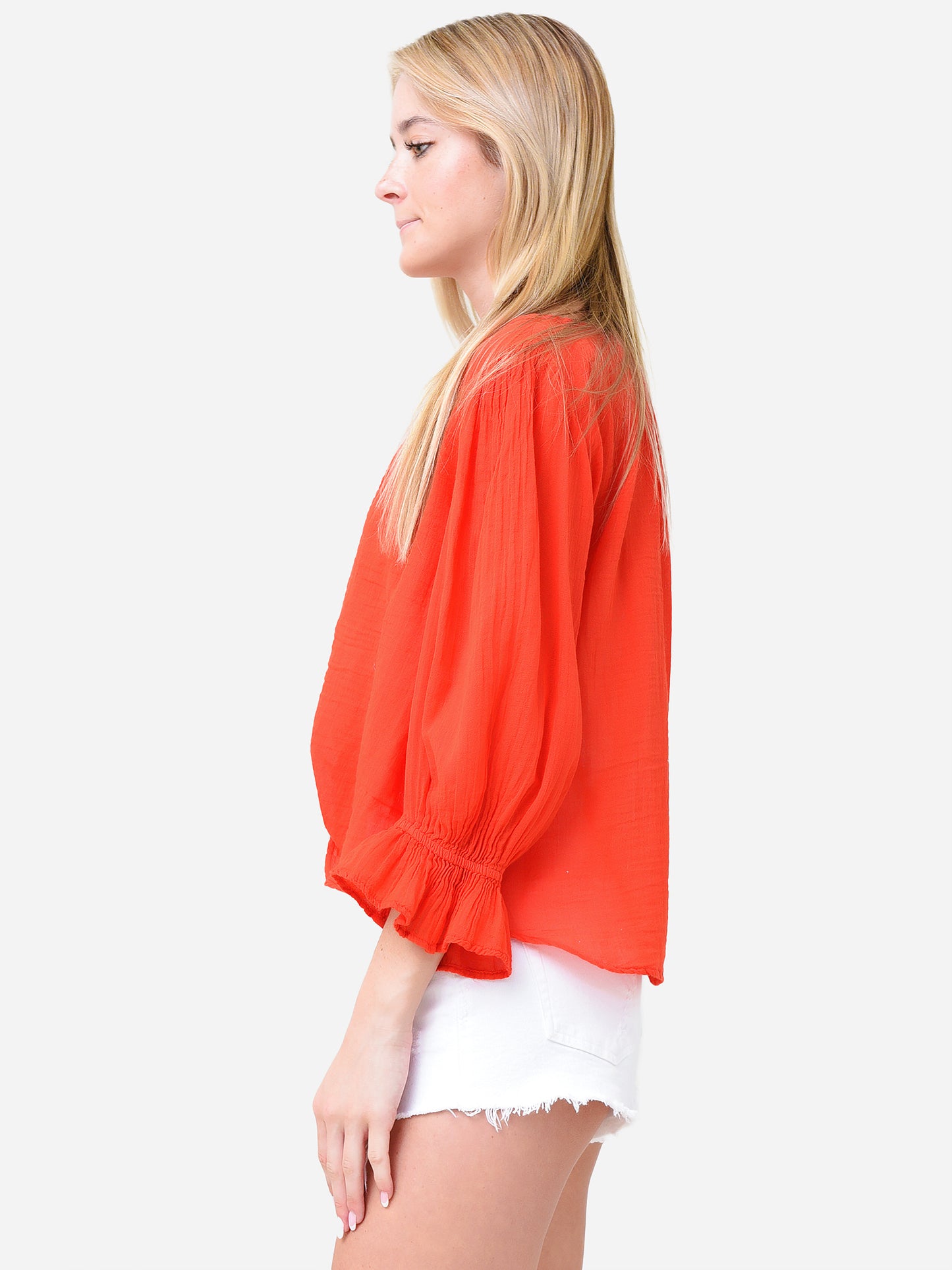 Peasant-style blouse with a v-neckline, and blouson sleeves with ruffle cuffs.