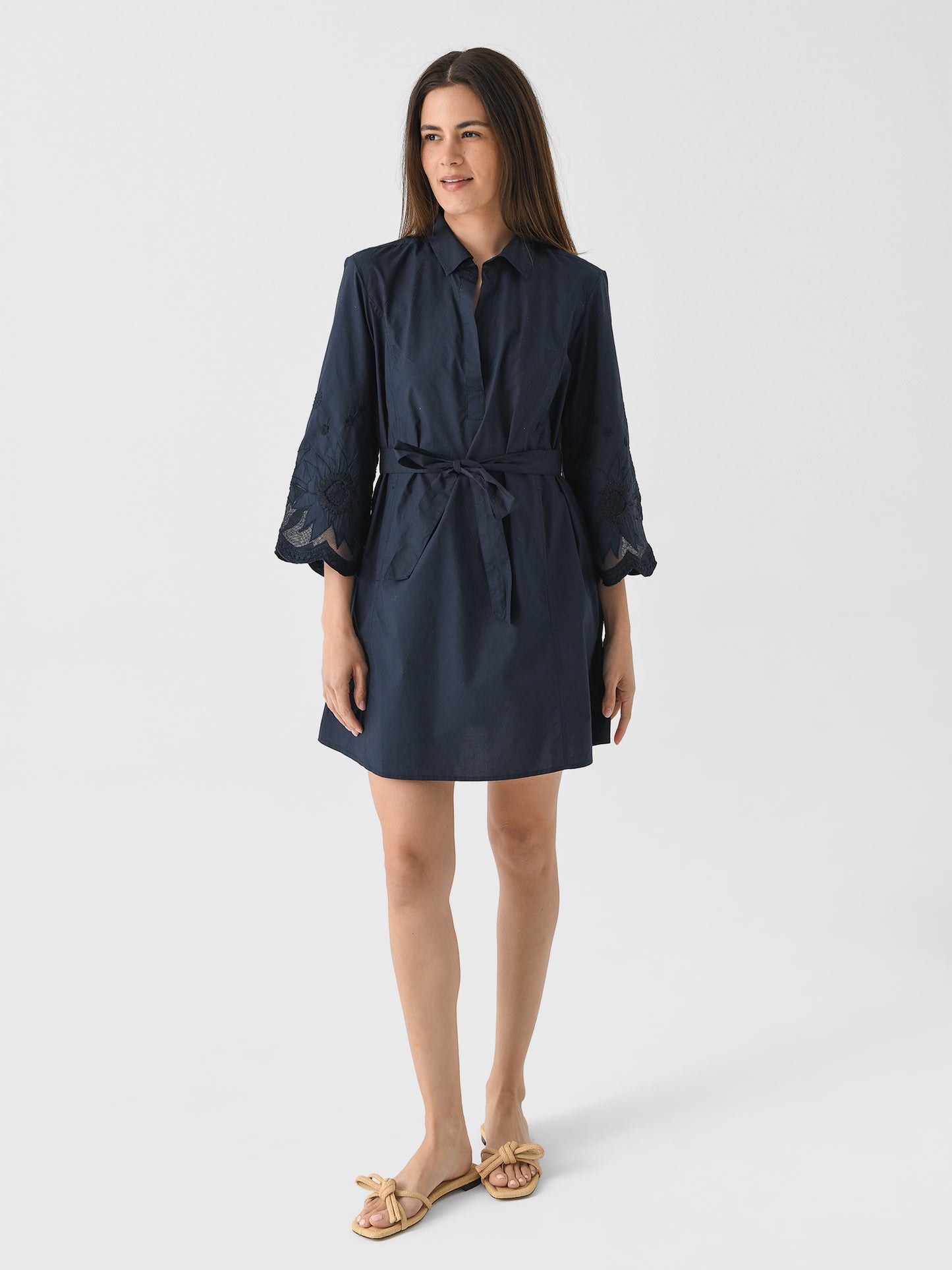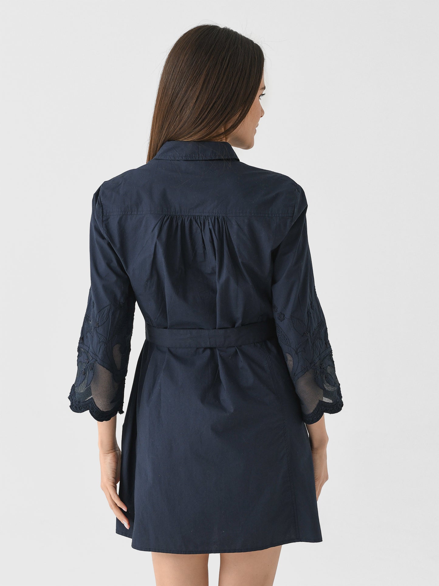 Combining subtle accents with a relaxed silhouette, this mini dress offers a stylish look. It includes a v-neckline, sunflower embroidery with mesh details, a detachable belt, and scalloped cuffs.