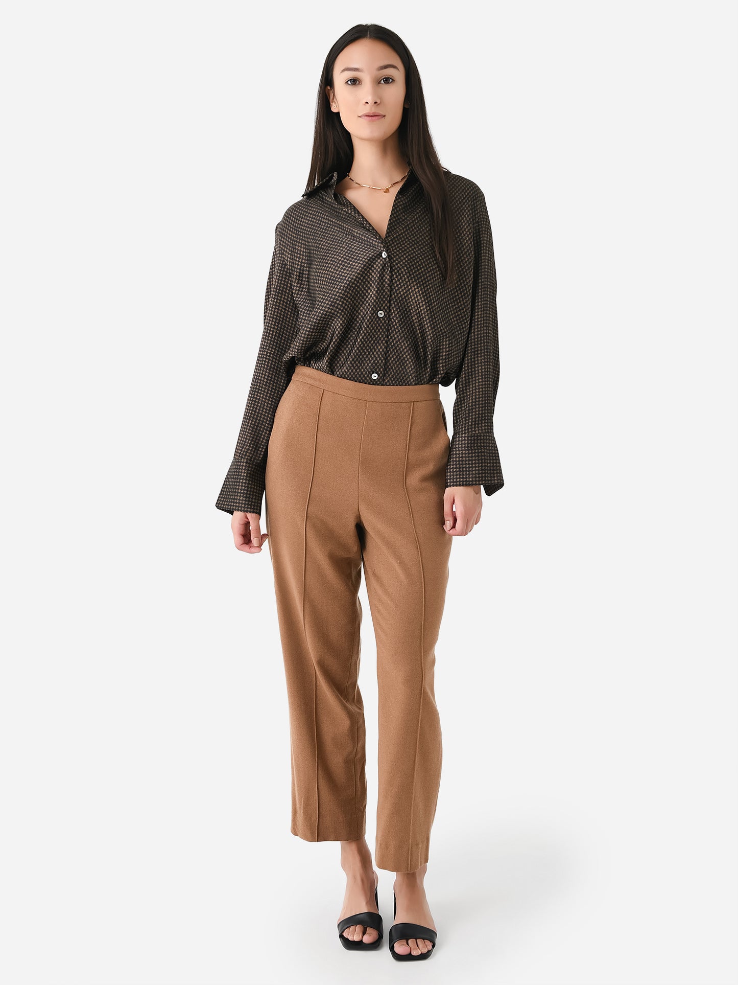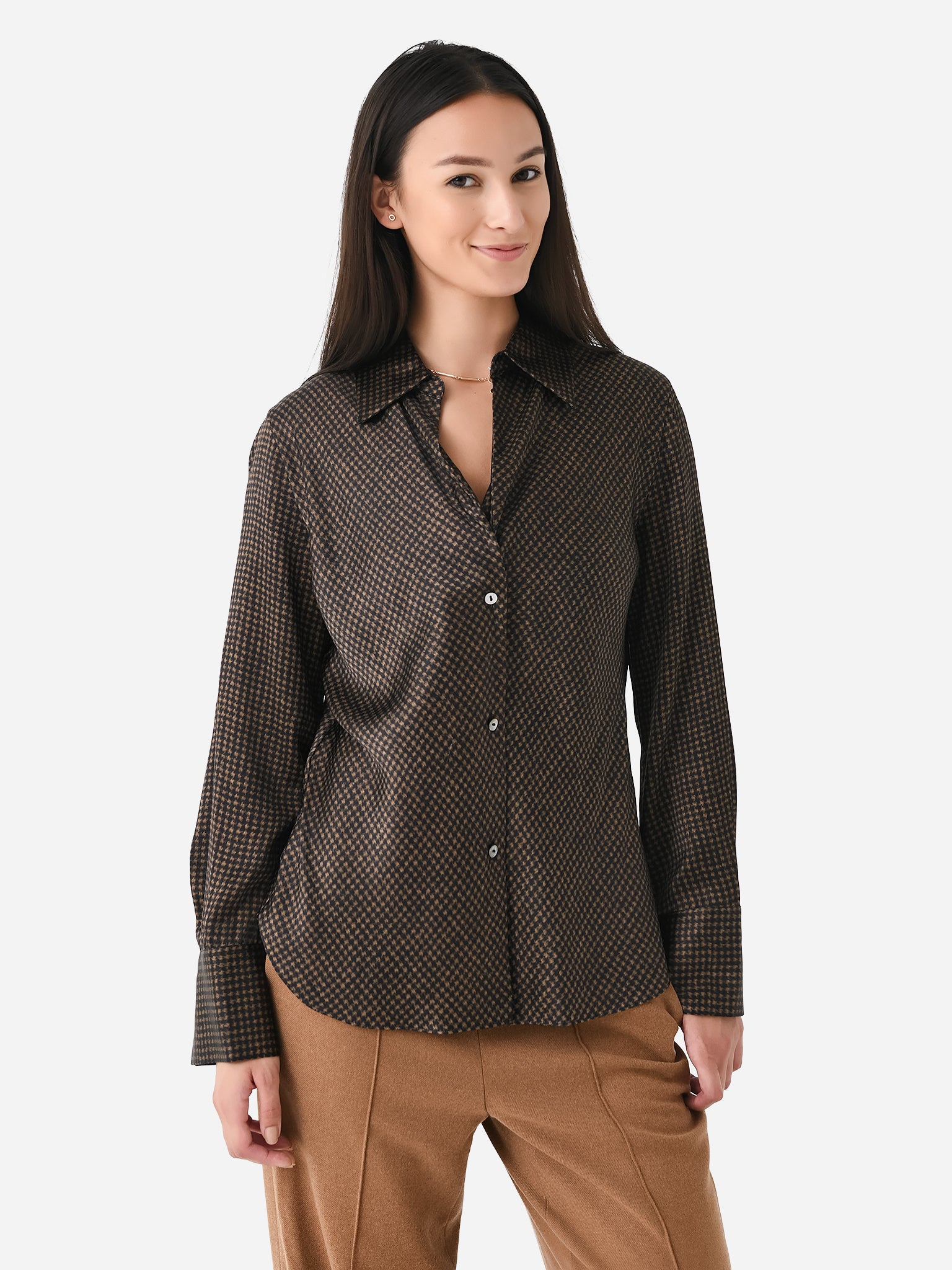 Women's Houndstooth Silk Bias Long Sleeve Blouse