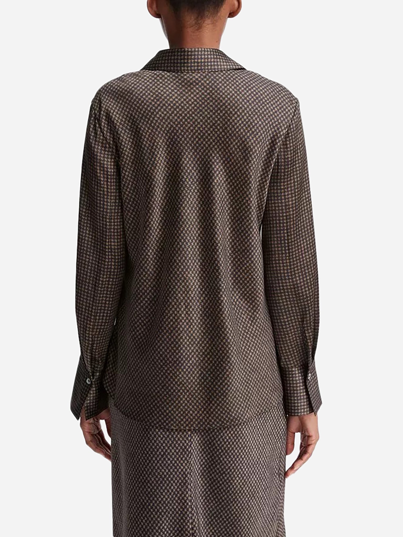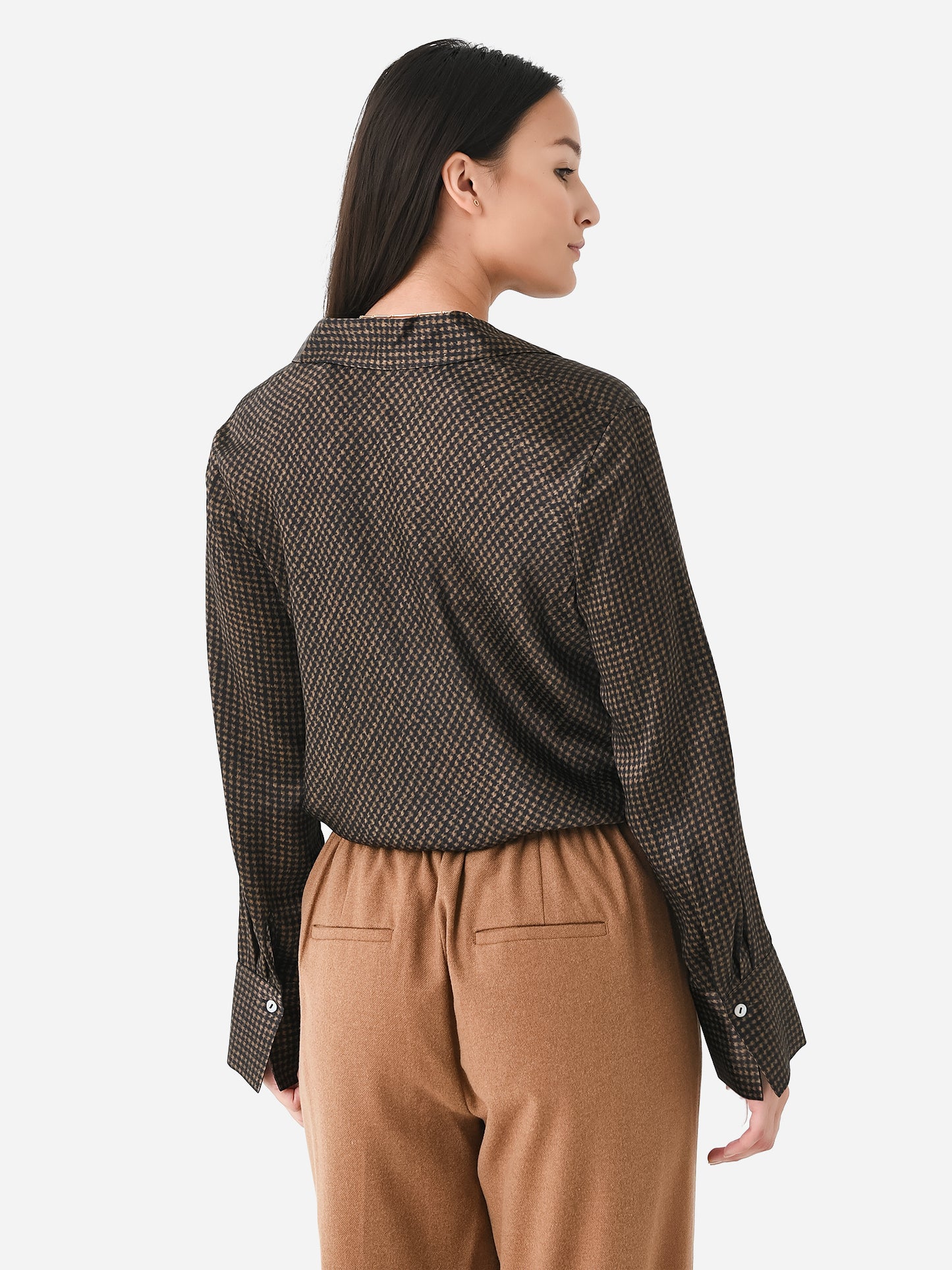 Slim-bodied bias-cut silk blouse with an open-collared neckline and houndstooth print.