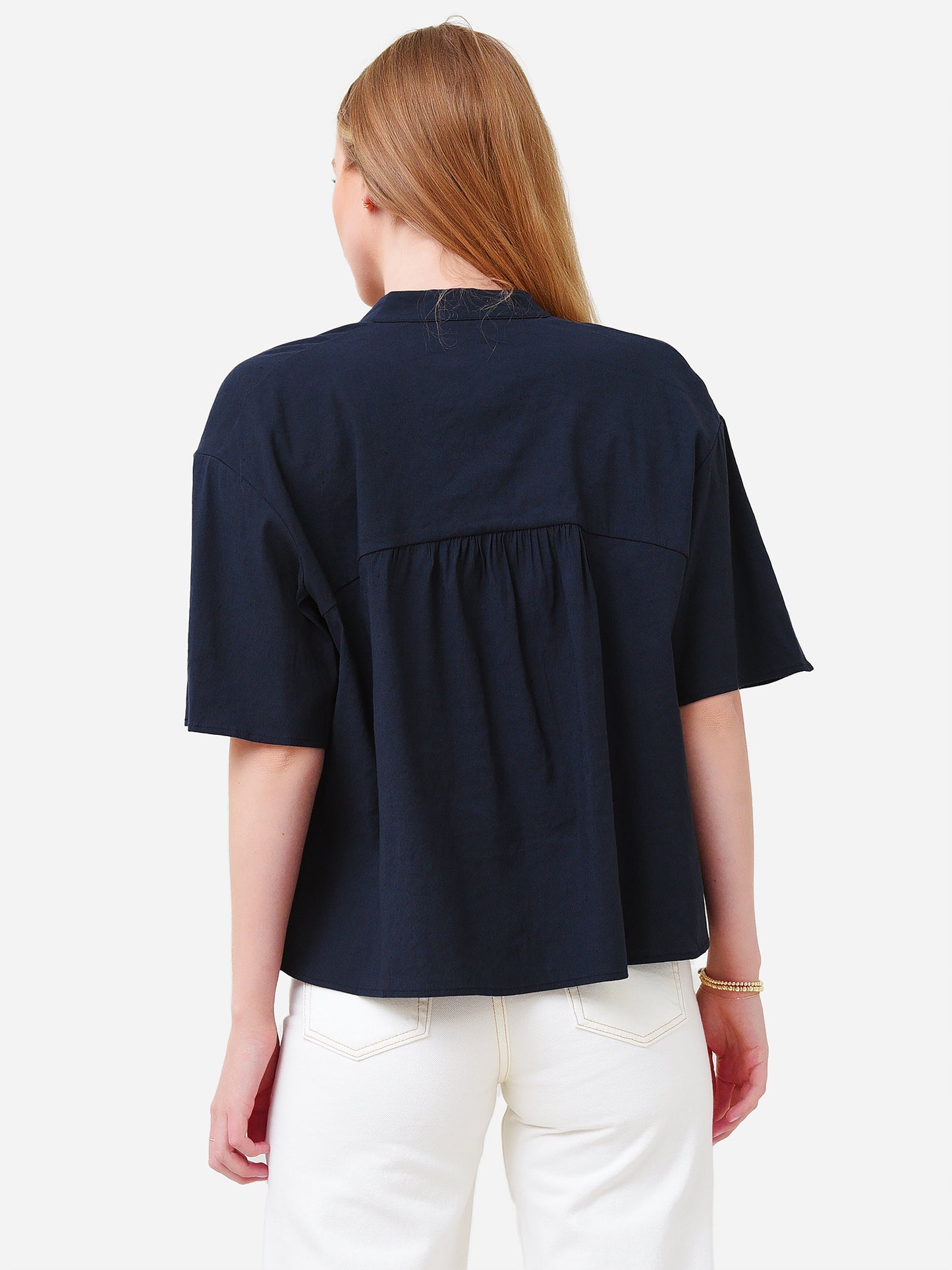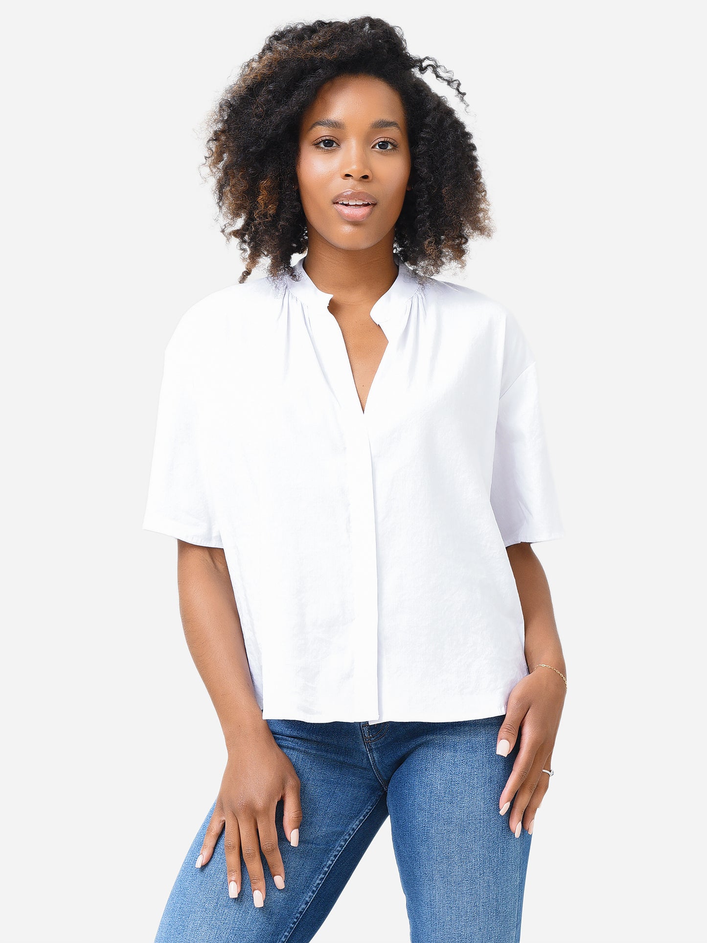 Women's Short Sleeve Shirred Band Collar Blouse