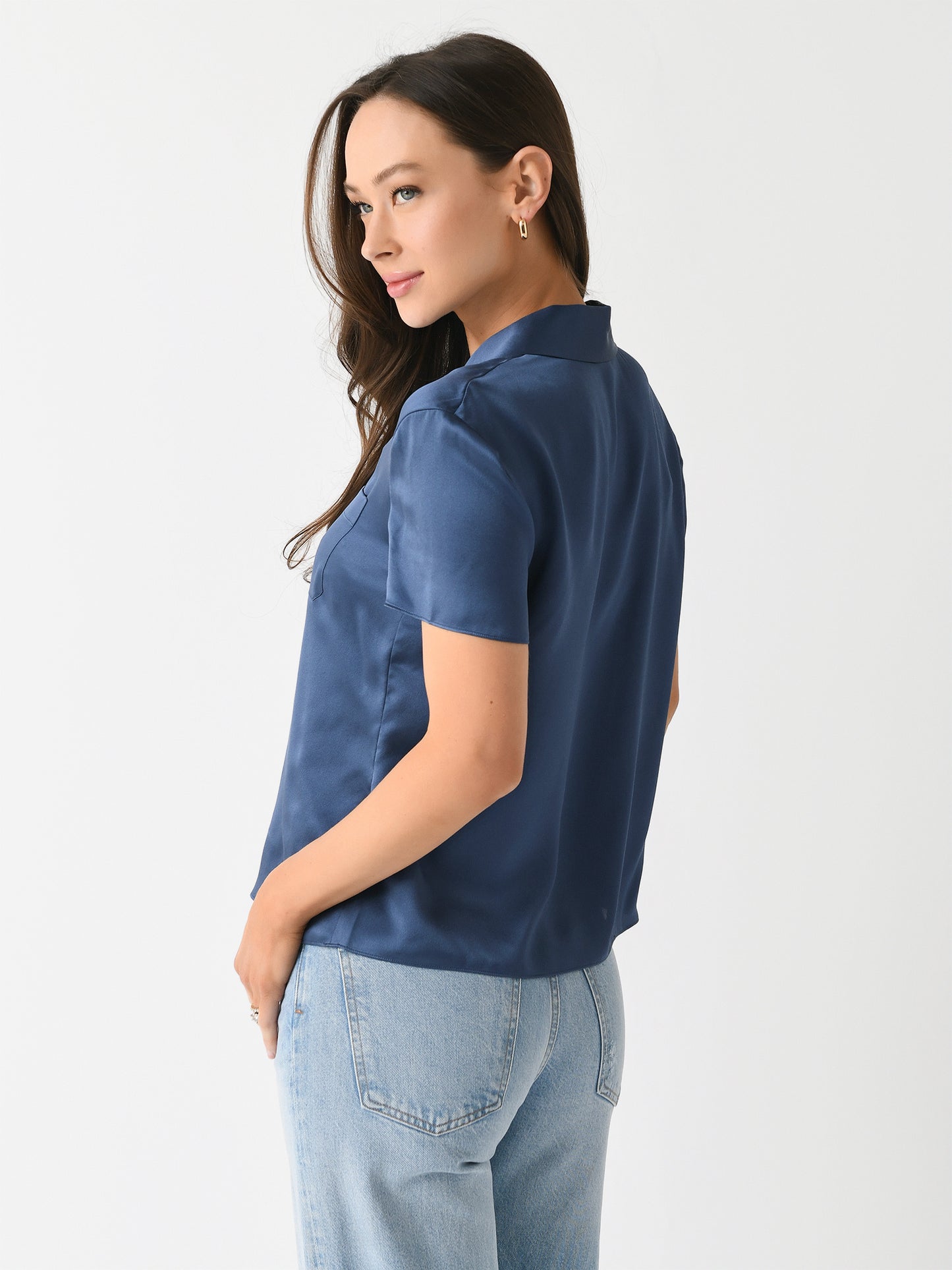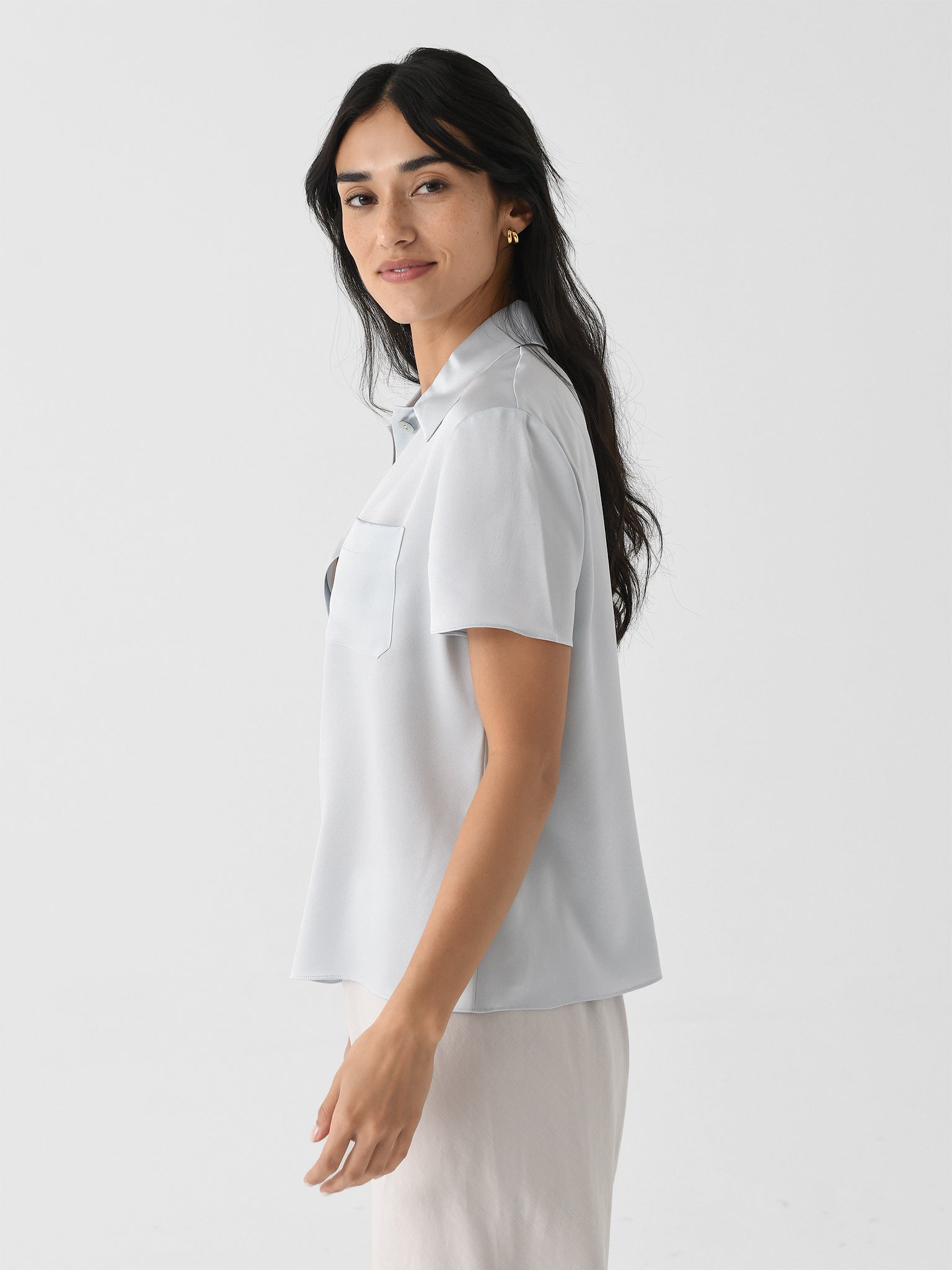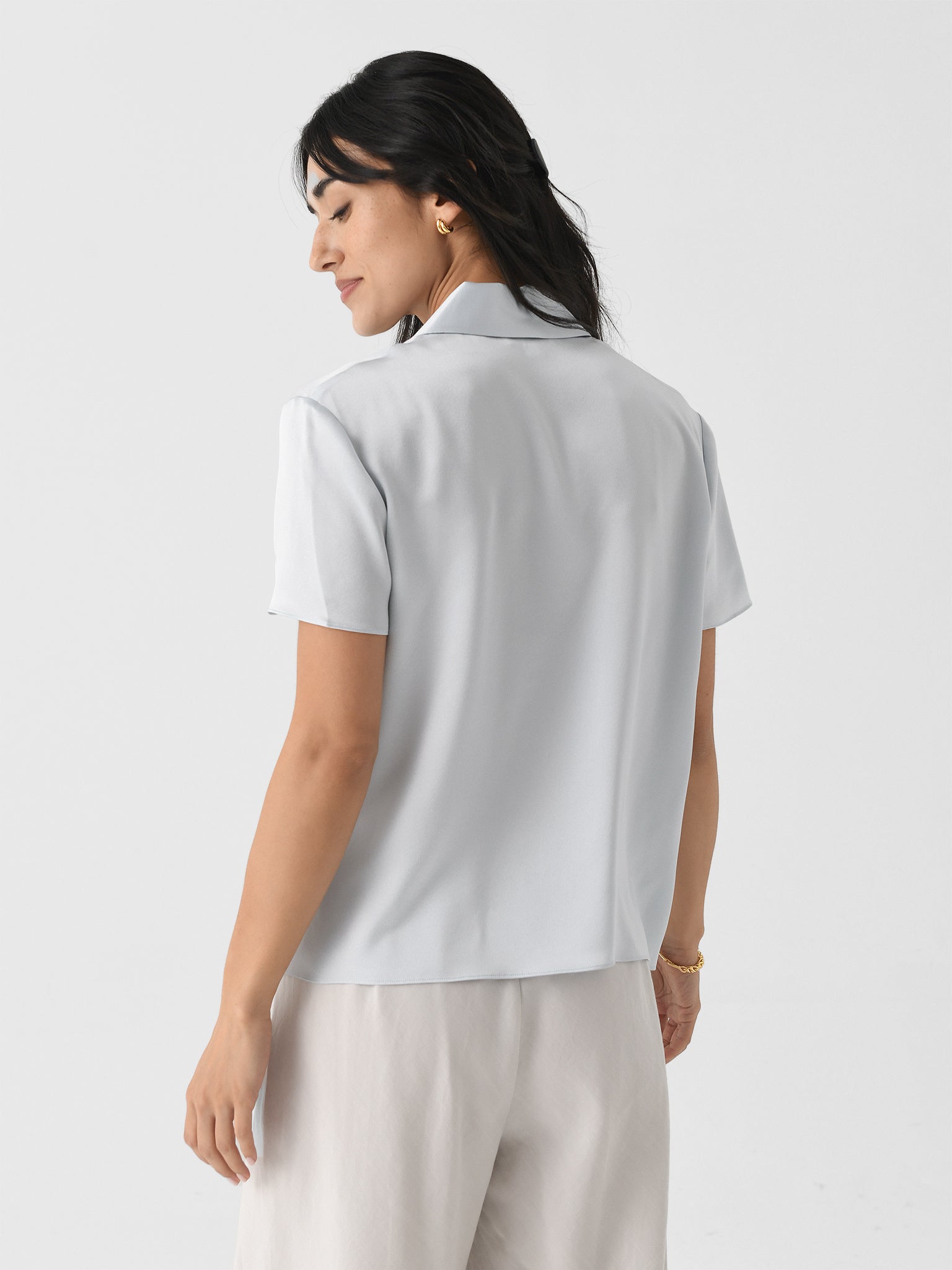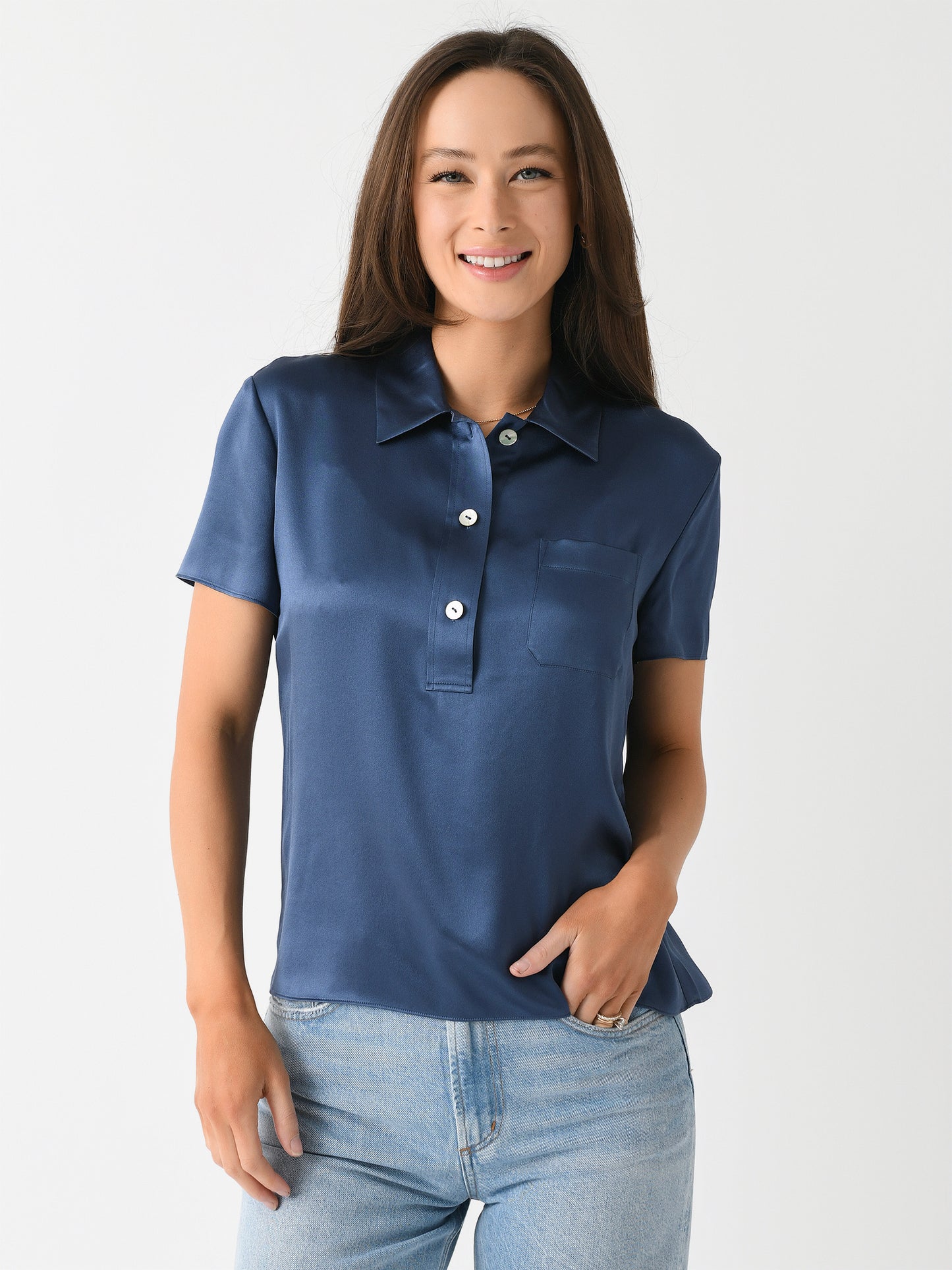A sporty-inspired blouse with a feminine design made from luxe silk fabric.