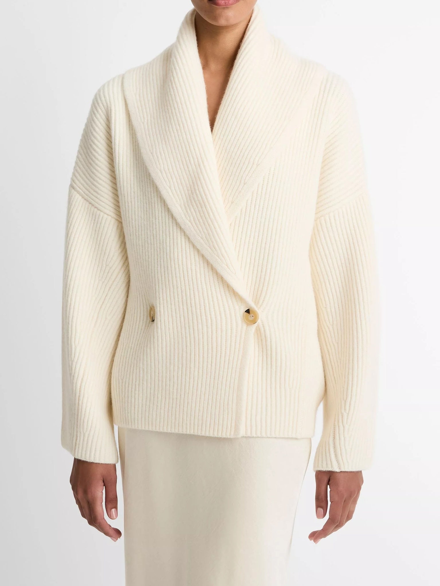 Blending the very best elements of a sweater and a coat, this latest layer offers both style and substance. It is crafted from a chunky rib-knit wool blend, providing an exceptionally sumptuous feel and a comfortable, substantial weight. The cozy topper is given a dash of definition by an exaggerated shawl collar, making it the perfect refined outer layer.