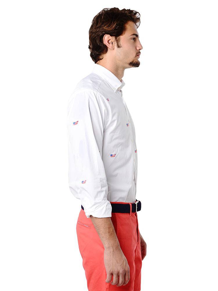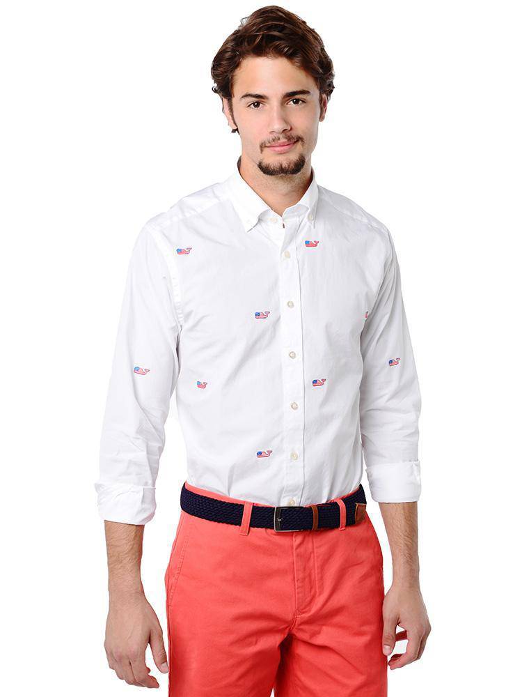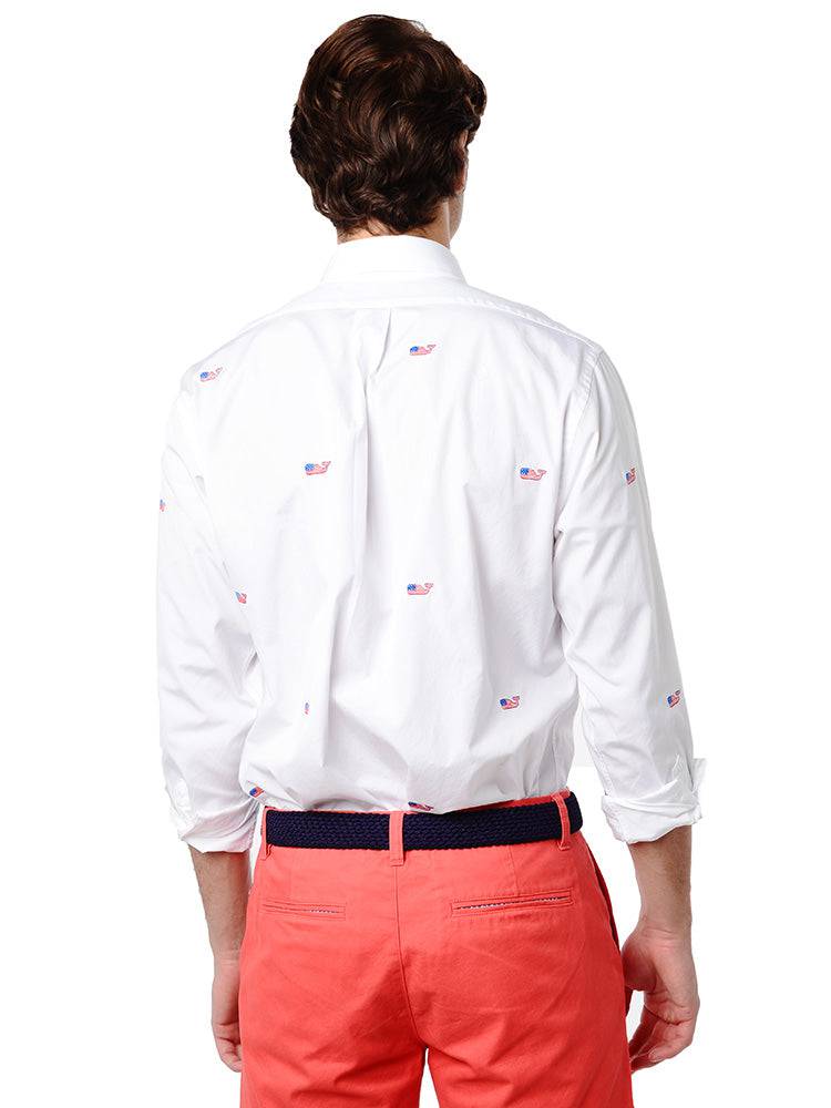Get the perfect patriotic look with the Vineyard Vines Flag Whale Embroidered Slim Whale Shirt.