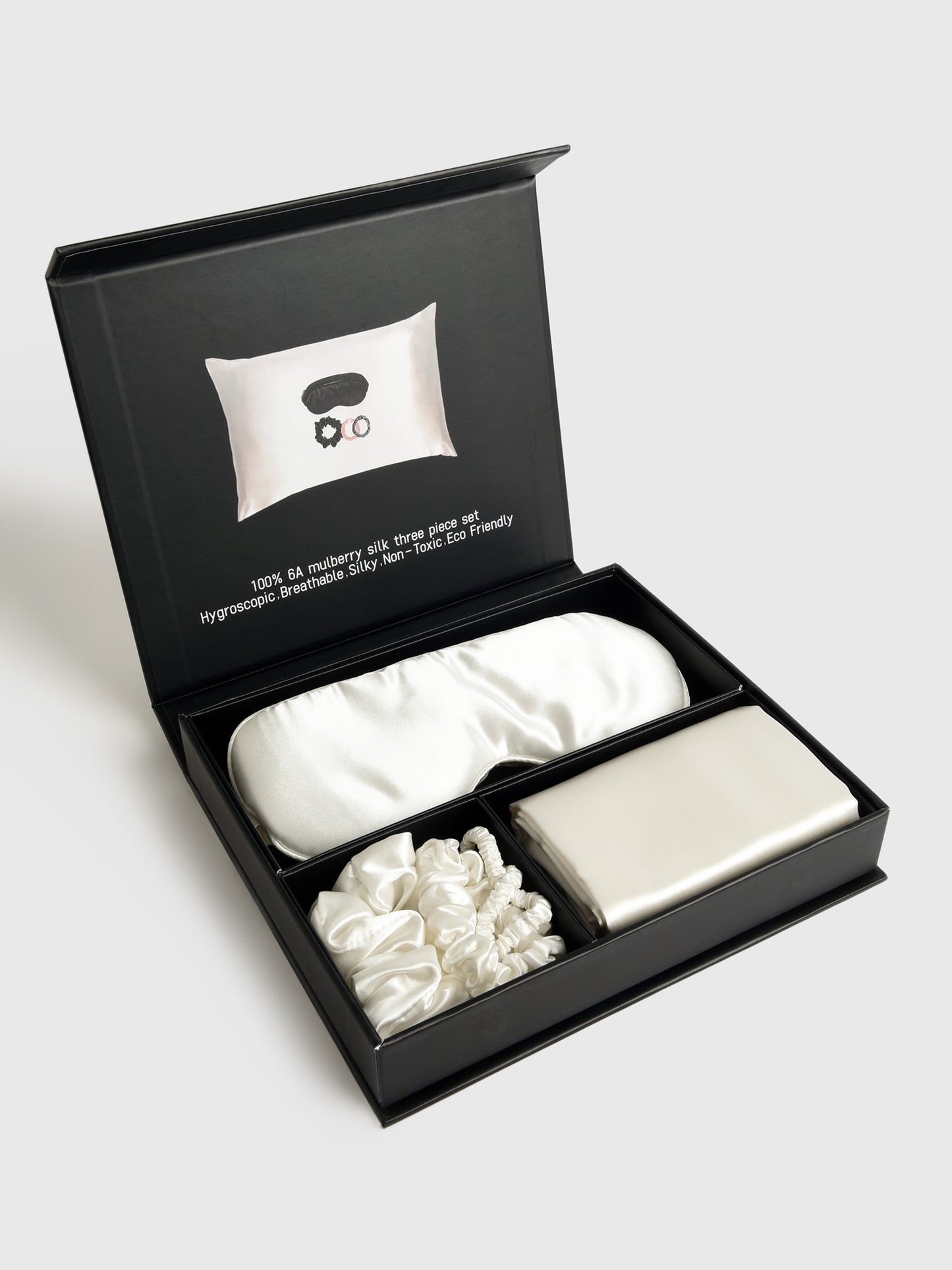 This exquisite trio includes a sleep mask, a hair tie, and a pillowcase. Experience the ultimate in comfort and style as you drift off to sleep, enveloped in the finest silk.