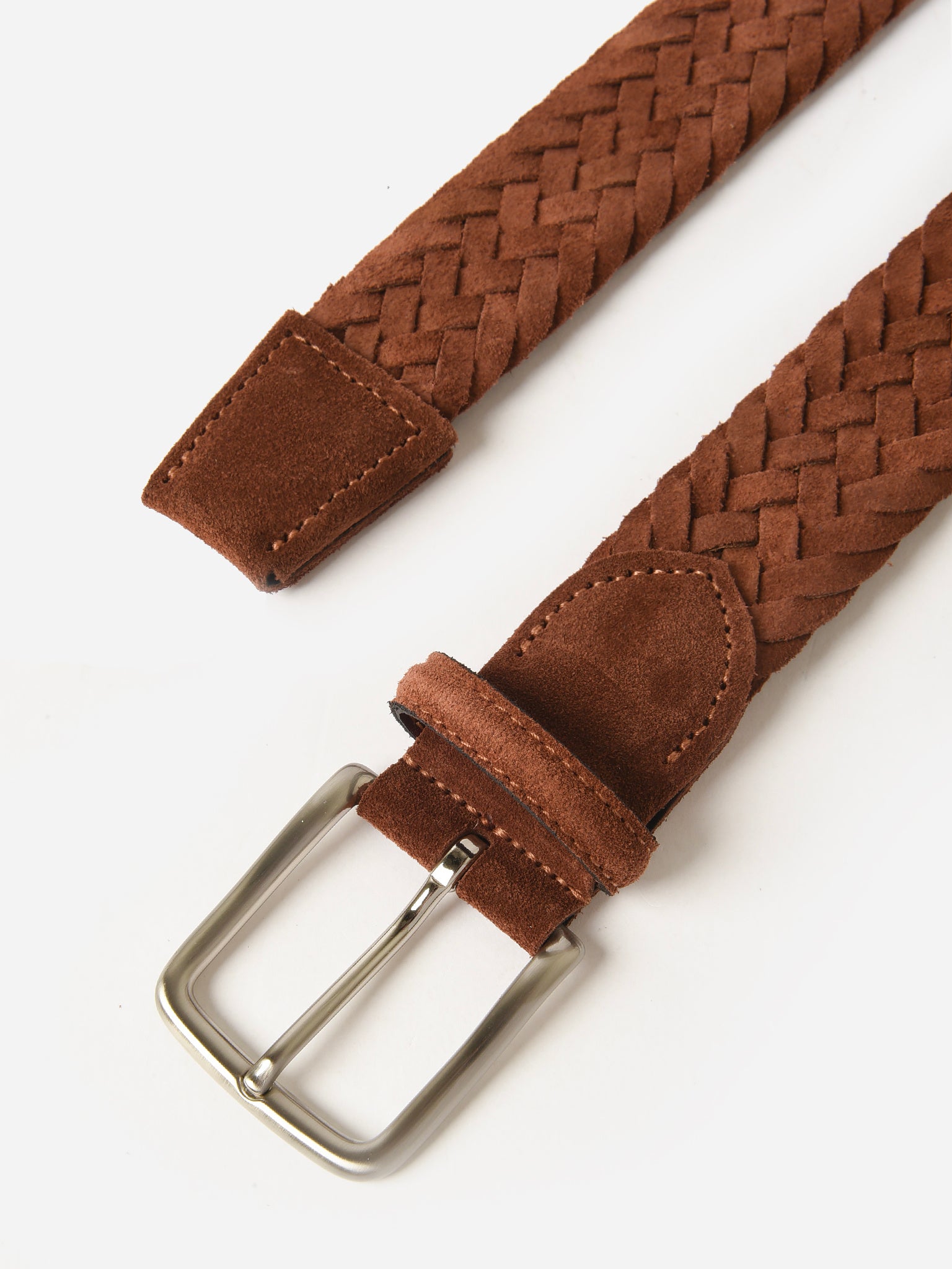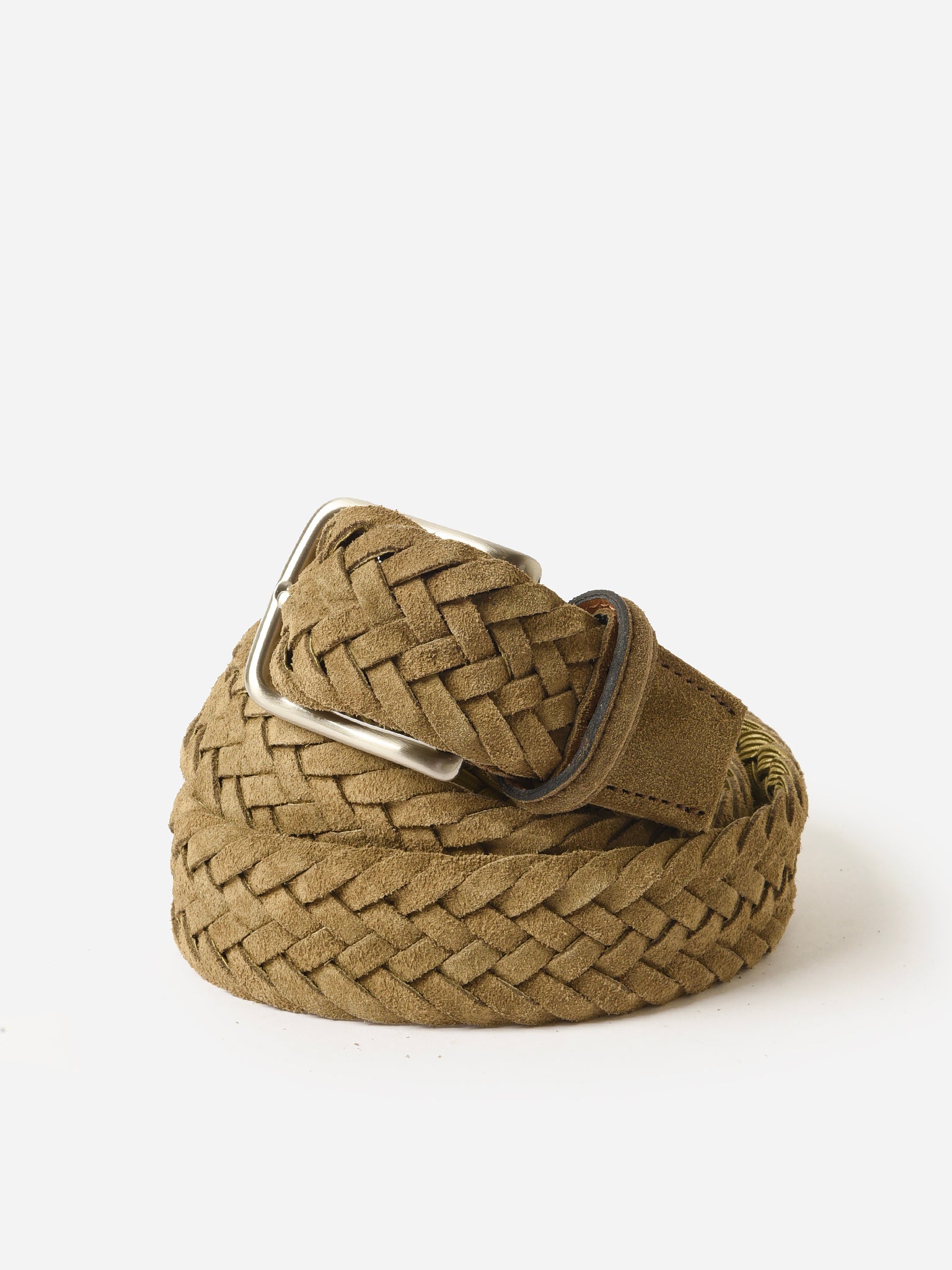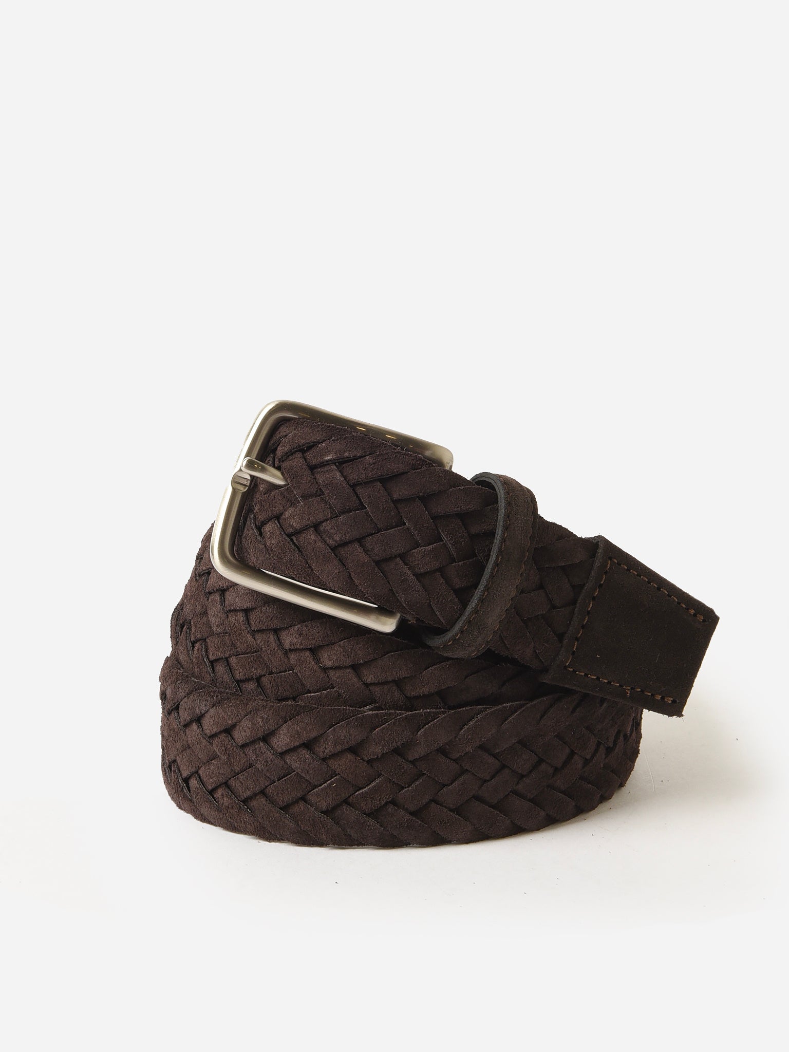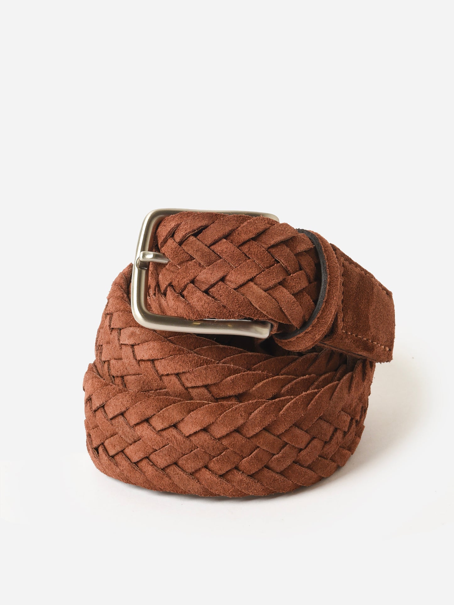 A woven belt made from Italian suede leather with a brushed nickel buckle.