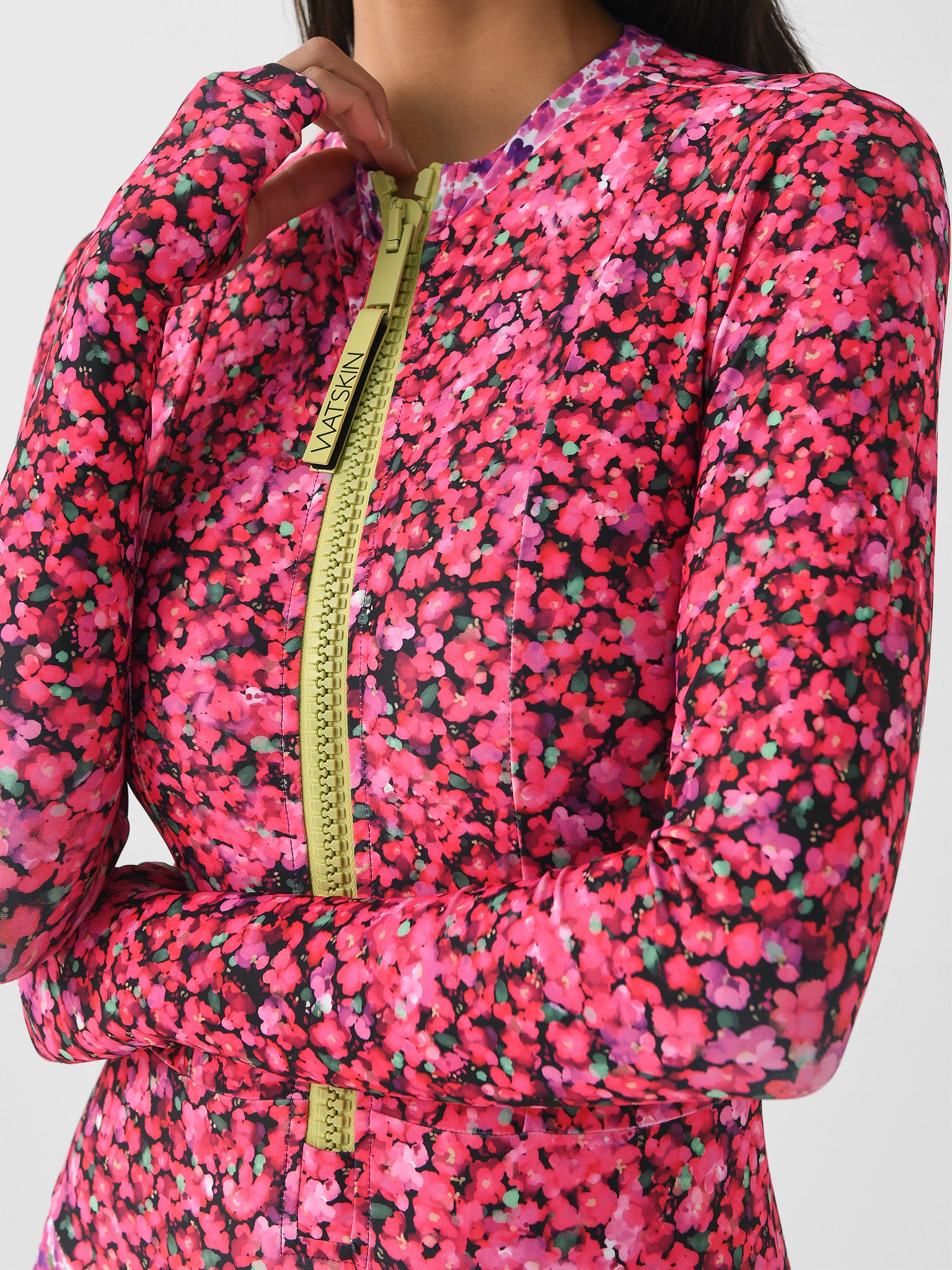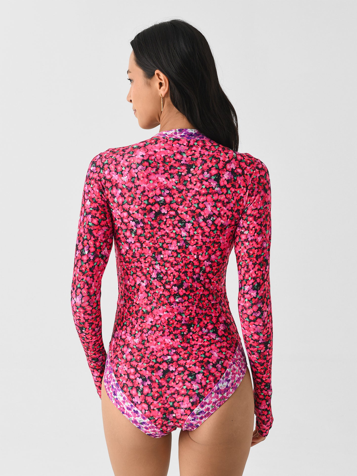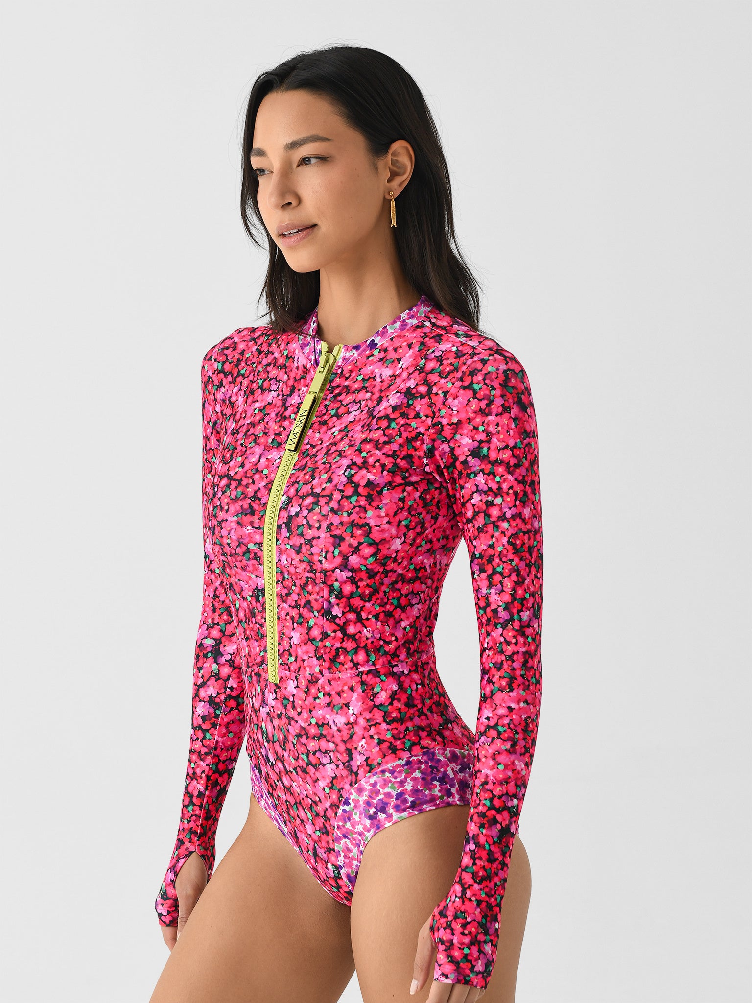 A comfortable one-piece swimsuit made from sun-protective fabric with a durable zipper closure and moderate back coverage.