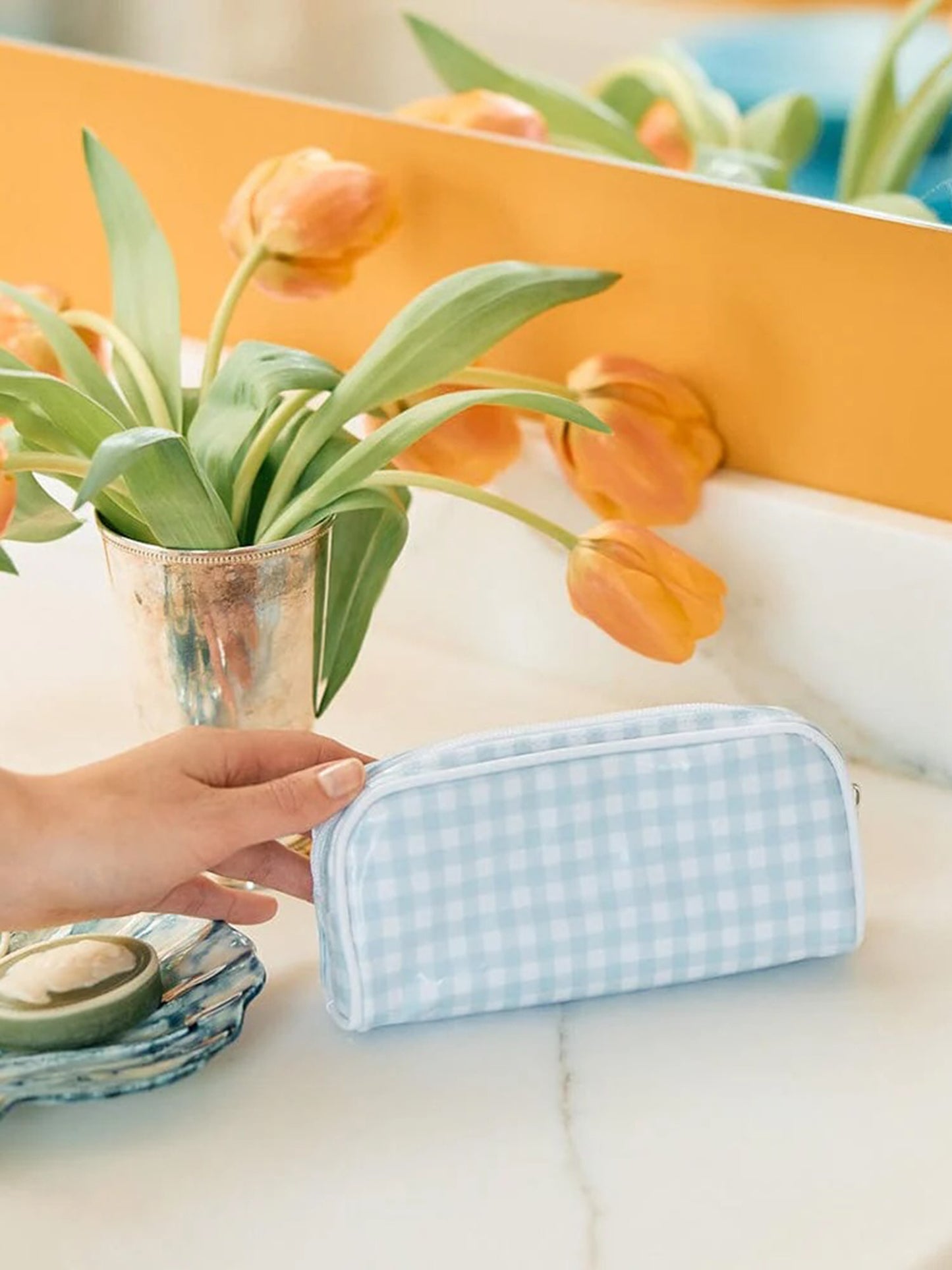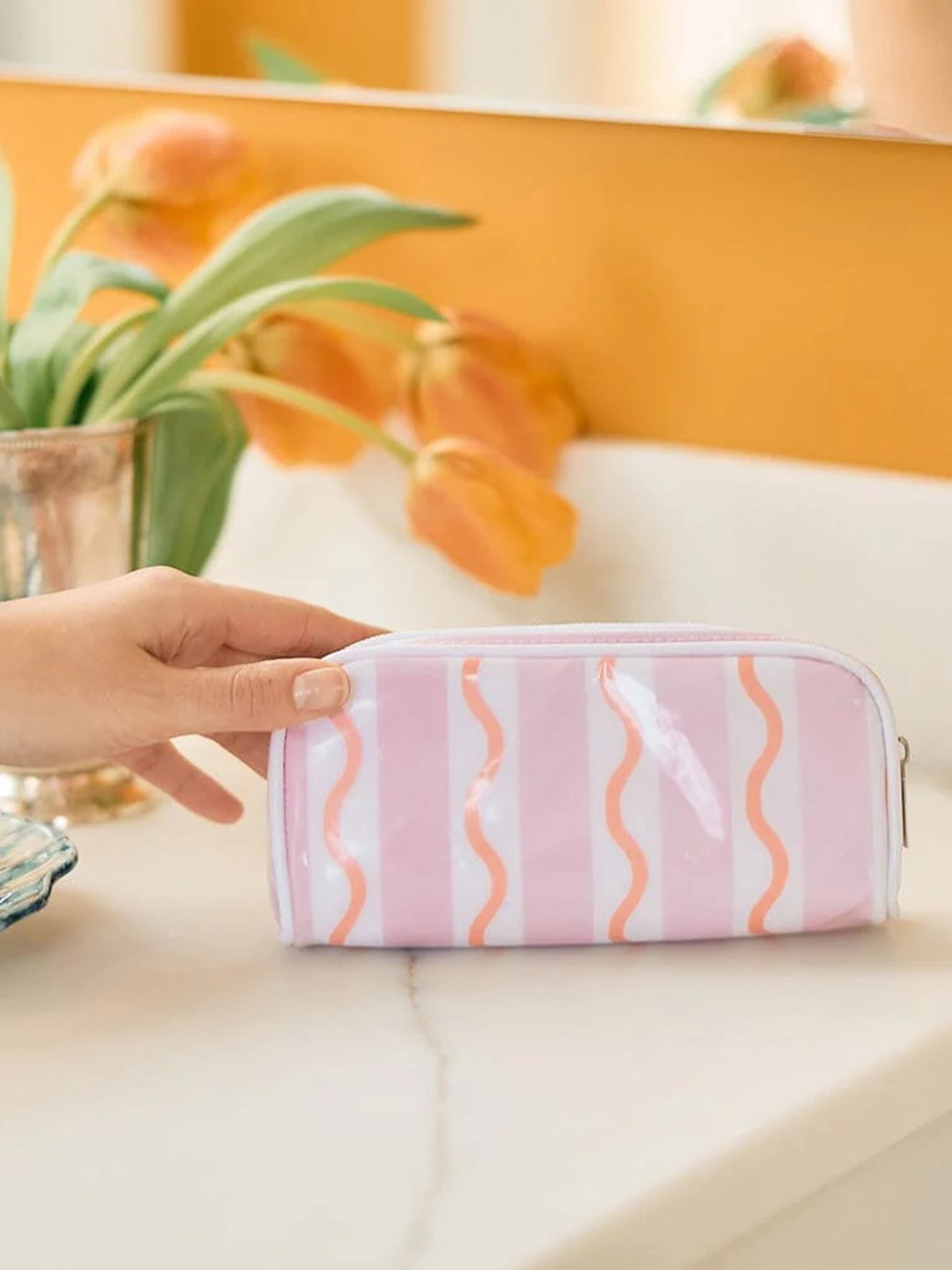 This mini, patterned toiletry bag is made from a coated EVA material with a water-resistant lining.